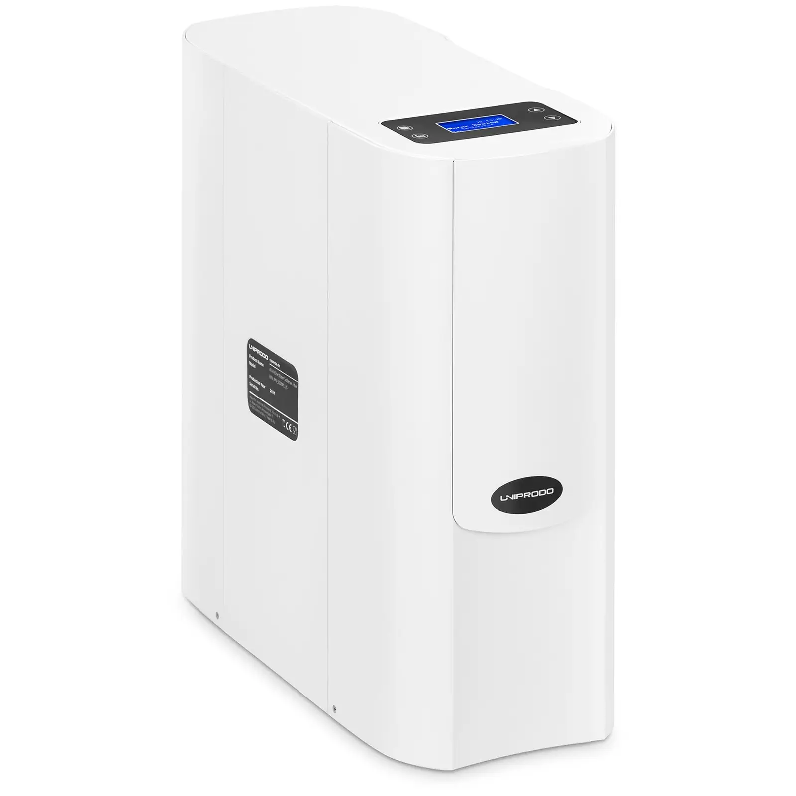 Uniprodon vedenpehmennin kotiin parantaa juomavetesi laatua ja siten myös ruokien, kahvin tai teen makua ja pidentää lisäksi putkien, lämmityslaitteiden, lämminvesivaraajien, pesukoneiden sekä veden- ja kahvinkeittimien elinikää. Uniprodon vedenpehmentimellä saavutat optimaalisen vedenlaadun, jolla helpotat elämääsi ja teet siitä terveellisempää! Kalkinpoistojärjestelmä ja vesisuodatin tarjoavat puhdasta vettä kahdessa vaiheessa. Ensin vesi johdetaan aktiivihiilisuodattimen läpi, joka poistaa epäpuhtaudet luotettavasti. Sen jälkeen tapahtuu kalkinpoisto. Hartsisäiliö ja aktiivihiilisuodatin ovat erillään toisistaan, jolloin keskinäinen kontaminaatio ei ole mahdollista. Prosessia ohjataan automaattisella venttiilillä, jossa on mikroprosessori. Tarpeitesi tai mieltymystesi mukaan voit ainoastaan suodattaa vettä tai ottaa sen käyttöön vasta pehmennyksen jälkeen. Tätä varten laitteessa on kaksi erillistä liitäntää. Vedenpehmentimen kompaktin rakenteen ansiosta laite voidaan asentaa myös pesualtaan alle. Tätä varten ohjausjärjestelmä on irrotettavissa ja tarvittaessa sijoitettavissa myös laitteen reunaan. Viehättävän rakenteensa ansiosta vedenpehmennintä voidaan käyttää myös sellaisenaan. Sinä päätät, miten laitetta haluat käyttää! Vedenpehmentimen toiminta perustuu ioninvaihtoperiaatteeseen, jolla kalsiumia ja magnesiumia poistetaan vedestä. Ioninvaihtimena toimii hartsista valmistettu vedenpehmentimen ydin. 4 litran täyttötilavuudella tämä malli tarjoaa vettä kotitalouksiin ja rakennuksiin 2 – 4 henkilön tarpeisiin. 1,0 – 4,5 baarin paineella vettä voidaan pehmentää ja käyttää noin 1 m³ tunnissa. Viemäröintiliitännän ansiosta jätevesi ohjautuu suoraan viemäriin. Vedenpehmentimen kokoaminen ja käyttö on erittäin helppoa. Kokoaminen kuvataan vaihe vaiheelta ohjeissa. Kun laite on otettu käyttöön, automaattinen venttiili integroidulla mikroprosessorilla ja vesimittarilla varmistaa vedenpehmentimen sujuvan toiminnan ja automaattisen säätämisen. Laite on erittäin helppohoitoinen, sinun on ainoastaan lisättävä suolaa säännöllisesti. Selkeä LED-näyttö antaa tietoja laitteen sen hetkisestä tilasta ja mahdollistaa asetusten mukauttamisen helposti milloin tahansa. Tehdyt asetukset on suojattu vahingossa tapahtuvilta asetuksilta.
