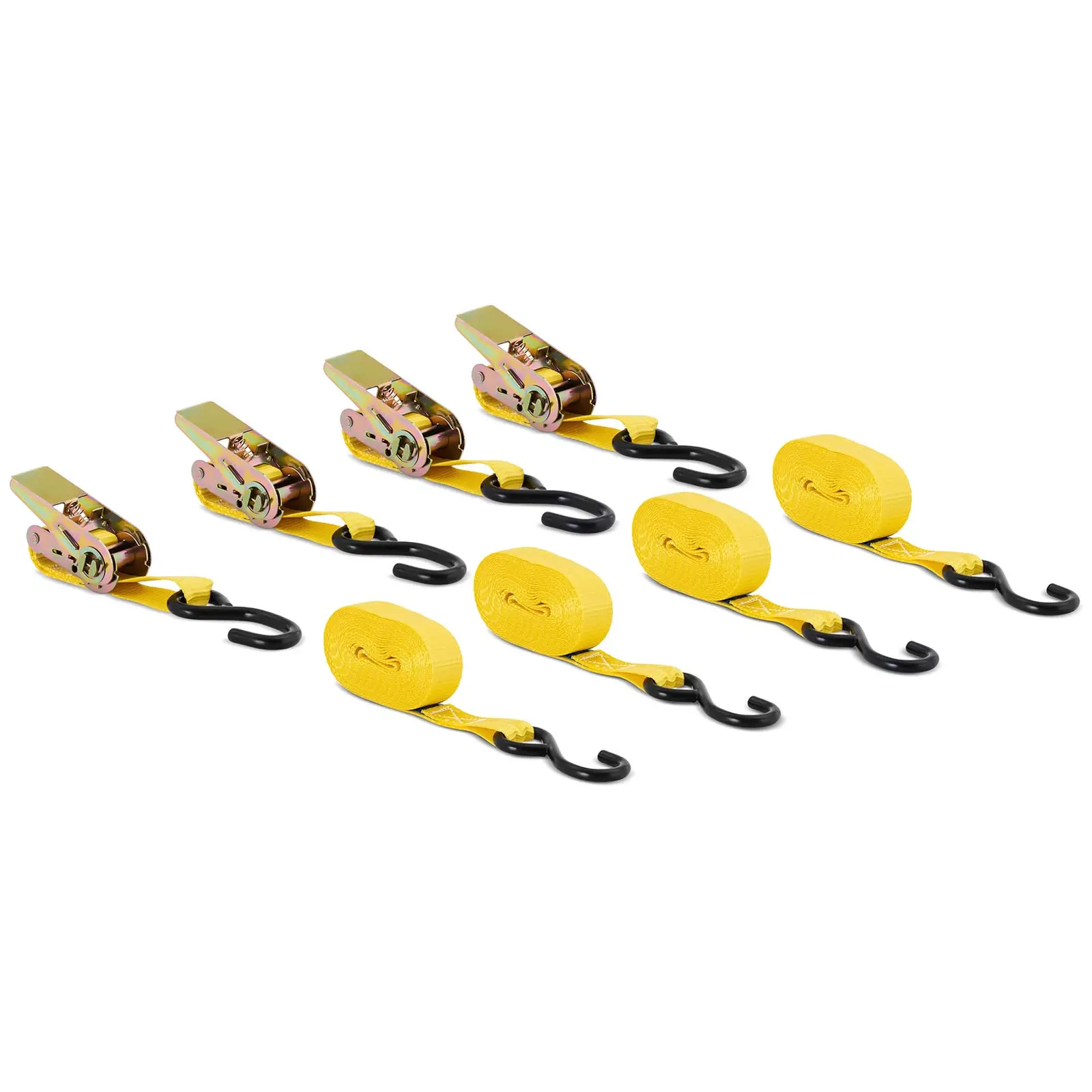 MSW:n räikällisillä kuormaliinoilla voit luotettavasti kiinnittää kuljetettavat tavarat esimerkiksi perävaunuihin tai auton kattotelineisiin. Joten tämä sarja sisältää neljä räikkäliinaa, jotka voit kiristää ja vapauttaa pienellä vaivalla pikalukituksen ansiosta. Monipuolisilla kuorman sidontatarvikkeilla voit kiinnittää luotettavasti erilaisia kuormia kuljetuksen ajaksi, olipa kyseessä sitten telineisiin tarkoitetuista tangoista, puupalkeista tai kookkaista esineistä. Sarja koostuu neljästä räikällisestä kuormaliinasta. 5 metrin (4,7 m nauhan pää + 0,3 m kiristinpää) pituudella ja 2,5 cm leveydellä jokainen kiristyshihna voidaan helposti kiinnittää erilaisten kuljetettavien tavaroiden ympärille. S-muotoisten koukkujen avulla voit kiinnittää hihnojen päät varmasti rei’itetyille lastausalueille. Kun optimaalinen asento on löytynyt, hihna voidaan kiristää räikällä. Jokainen neljästä räikkähihnasta on valmistettu 100 % polyeteenistä. Kiinnikkeet on valmistettu galvanoidusta raudasta. Täten koukulliset räikkähihnat ovat erittäin pitkäikäisiä ja korroosionkestäviä. Lujatekoisten materiaalien ansiosta hihnojen murtolujuus on 400 daN (suora) / 800 daN (vanteessa).