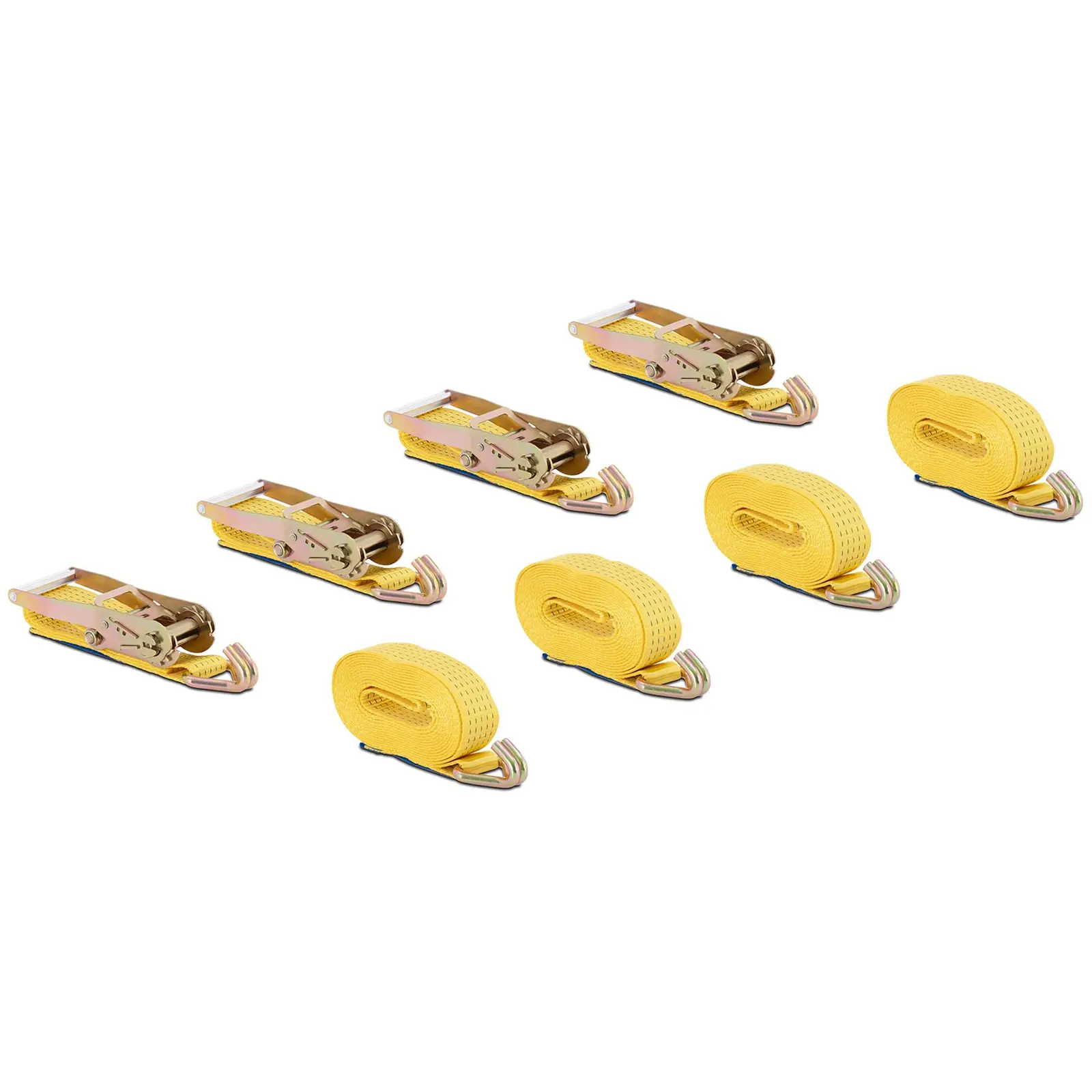 MSW:n räikällisillä kuormaliinoilla voit luotettavasti kiinnittää kuljetettavat tavarat esimerkiksi perävaunuihin tai auton kattotelineisiin. Joten tämä sarja sisältää neljä räikkäliinaa, jotka voit kiristää ja vapauttaa pienellä vaivalla pikalukituksen ansiosta. Monipuolisilla kuorman sidontatarvikkeilla voit kiinnittää luotettavasti erilaisia kuormia kuljetuksen ajaksi, olipa kyseessä sitten telineisiin tarkoitetuista tangoista, puupalkeista tai kookkaista esineistä. Sarja koostuu neljästä räikällisestä kuormaliinasta. 6 metrin (5,5 m nauhan pää + 0,5 m kiristinpää) pituudella ja 5 cm leveydellä jokainen kiristyshihna voidaan helposti kiinnittää erilaisten kuljetettavien tavaroiden ympärille. A-muotoisten koukkujen avulla voit kiinnittää hihnojen päät varmasti rei’itetyille lastausalueille. Kun optimaalinen asento on löytynyt, hihna voidaan kiristää räikällä. Jokainen neljästä räikkähihnasta on valmistettu 100 % polyeteenistä. Kiinnikkeet on valmistettu galvanoidusta raudasta. Täten koukulliset räikkähihnat ovat erittäin pitkäikäisiä ja korroosionkestäviä. Kestävät materiaalit antavat hihnoille 5 000 daN:n repäisylujuuden.