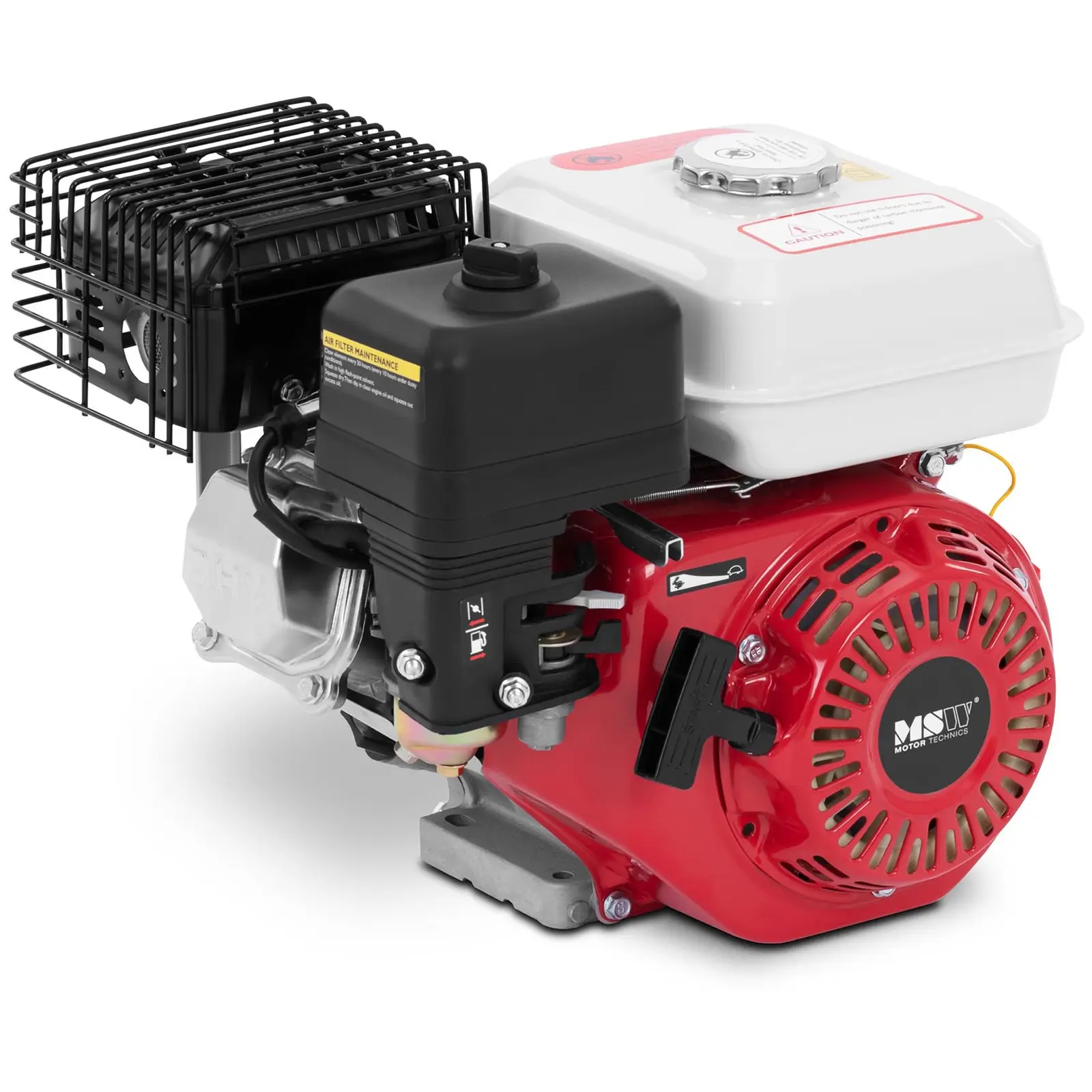 Käytä tehokasta 4-tahtista moottoria, jossa on 6. 5 HP moniin eri sovelluksiin. Se sopii sekä kiinteäksi moottoriksi että varamoottoriksi laitteissa, kuten vesipumpuissa, tärylevyissä, ruohonleikkureissa, lakaisukoneissa tai lumilingoissa. Mutta myös kartingmoottorina ja monilla muilla alueilla se vakuuttaa luotettavilla suorituskykyarvoillaan. Monipuolinen moottori tarjoaa sinulle erittäin helpon käsittelyn ja hämmästyttävän alhaisen polttoaineenkulutuksen. Käytä vakuuttavia teknisiä arvoja käyttöalueellesi tarkasti suunnitellulla yksisylinterisellä 4-tahtimoottorilla, jossa on OHV-venttiilin ohjaus: jonka iskutilavuus on 196 cm³ ja suorituskykyarvot ovat 6. 5 HP ja 3600 rpm maksimivääntömomentilla 11. 2 Nm, paikallaan oleva moottori täyttää korkeimmat vaatimukset. Tehokas suorituskyvystään huolimatta bensiinimoottori on erittäin taloudellinen, ja sen kulutus on vain 370-380 g/kWh, mikä tekee hyvää lompakolle. Vetokäynnistyksellä saat laitteen nopeasti käyttöön. 3,6 litran säiliön ansiosta voit käyttää moottoria pitkään. Jos arvostat kestävyyttä ja turvallisuutta, bensiinimoottori on juuri sinulle sopiva. Kestävät materiaalit, puhdas työstö ja tehokas sytytin takaavat luotettavasti lukuisia intensiivisiä bensiinimoottorin käyttöjä. Lisäksi tehokas ilmajäähdytys suojaa kart-moottoria ylikuumenemiselta.