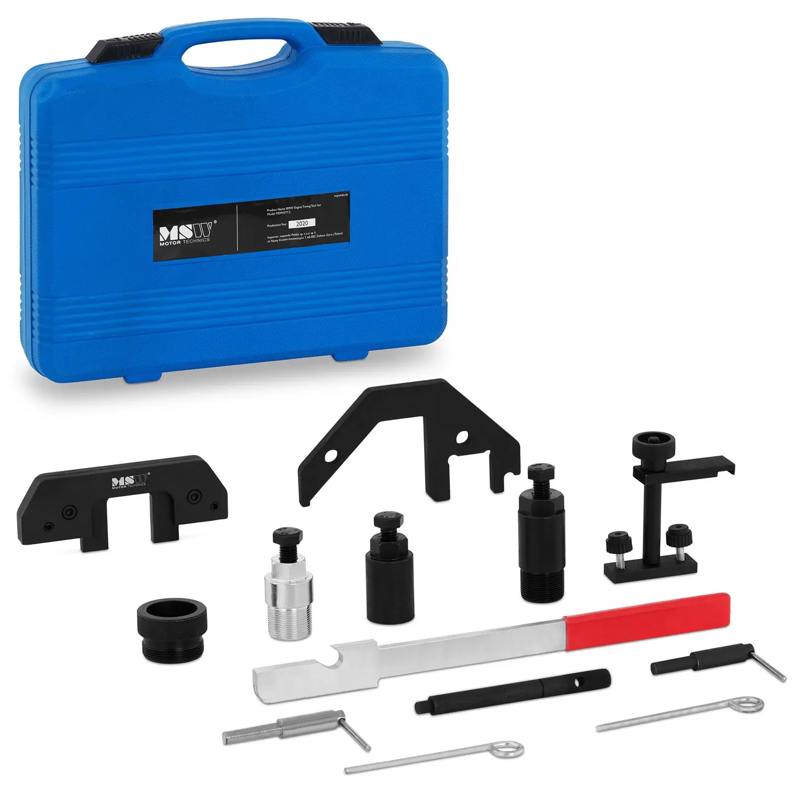 MSW:n ajoitustyökalusarja MSW-ETT. 2 on optimaalinen ammattilaissetti eri valmistajien, kuten BMW, Land Rover tai Opel moottorien korjaukseen. Tätä settiä voi yhtä lailla käyttää moottorien ohjauksen tai nokka-akselikäyttöjen ketjujen kireyden säätöön tai akselien ammattimaiseen irrotukseen ja asennukseen. Tämä korkealuokkainen työkalu on arvokas apuväline sekä ammatti- että kotikorjaamoissa. Tämä ajoitustyökalusarja sopii yhteen mitä erilaisempien moottorien kanssa. Jo yksin BMW-moottorimalleja on yli 20 – E34-malleista E93-malleihin- mainitsemattakaan muita merkkejä kuten Opel tai Land Rover. Täydellinen luettelo sarjan kanssa yhteensopivista automerkeistä on kohdassa ”tekniset tiedot”. Ammattitason BMW-ajoitustyökalu on loistava apu lukuisiin korjaamotöihin. Monet moottorin ohjauksen elementit, kuten esimerkiksi nokka-akselit, voi säätää, lukita, asentaa tai irrottaa tarpeen mukaan. Samoin tällä työkalulla voi säätää optimaalisesti nokka-akselikäytön ohjausketjun kireyttä. Sarjaan kuuluu 13 erilaista työkaluelementtiä, jotka on suunniteltu monenlaisiin tarkoituksiin. Setti on valmistettu korkealaatuisesta terässeoksesta, mikä tekee siitä vankan ja kestävän. Koko setti toimitetaan käytännöllisessä muovisalkussa, jonka sisällä on oma syvennyksensä jokaiselle yksittäiselle osalle. Salkku on erittäin kompakti ja mahtuu vaivatta kaikkiin korjaamoihin. Sitä on mukava kantaa ja kuljettaa käytännöllisestä kahvastaan.