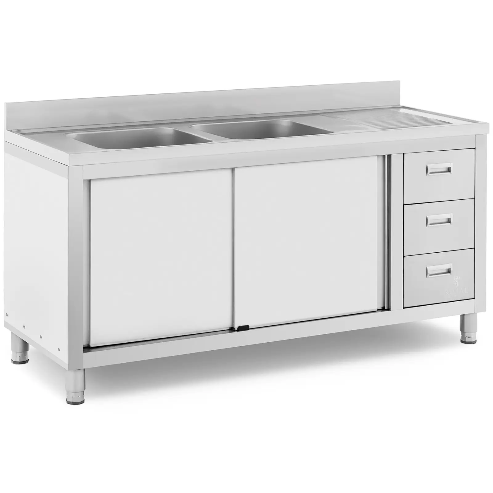 Royal Cateringin allaskaappi RC-IKS04 on ihanteellinen ratkaisu suuriin keittiöihin, ravintoloihin tai kouluihin, sairaaloihin ja laboratorioihin. Vankka allaskaappi on valmistettu kokonaan ruostumattomasta teräksestä ja tekee vaikutuksen tarkkaan harkitulla rakenteeltaan. Pienikokoisessa allaskaapissa on kaksi suurta pesuallasta, joihin mahtuu helposti isot kattilat, pannut tai grilliritilät. 400 x 400 x 300 mm altaissa on siivilällä varustettu viemäri. Lisäksi käytännöllinen 100 mm:n roiskesuoja suojaa laattoja ja seinää roiskeilta. Käytännöllisillä liukuovillaan ja vetolaatikoillaan allaskaappi sopii hyvin myös ahtaisiin tiloihin. Kaikki säilytettävät astiat pysyvät hygieenisinä ja niihin pääsee käsiksi nopeasti kevyesti liukuvien ovien ansiosta. Allaskaappi on valmistettu kokonaan kestävästä ruostumattomasta teräksestä. Materiaali on erityisen kestävä ja sopii ajattomana jokaiseen keittiöön. Lisäksi ruostumattomasta teräksestä valmistetut keittiökalusteet voidaan puhdistaa nopeasti ja helposti. Hyödyt kestävästä metallista, joka säilyttää kiiltonsa pitkään ja on myös erittäin korroosionkestävä. Jalkoja voidaan säätää korkeudesta 20 mm, joten allaskaappi mukautuu optimaalisesti yksilöllisiin tarpeisiin. Edes epätasaiset lattiat eivät ole ongelma kaapin vakaudelle. Mukana toimitettujen ohjeiden ansiosta kokoaminen ja asennus sujuu vaivattomasti. Royal Cateringin allaskaappi RC-IKS04 on tyylikäs ratkaisu jokaiseen keittiöön. Huomio: Hana ei sisälly toimitukseen.