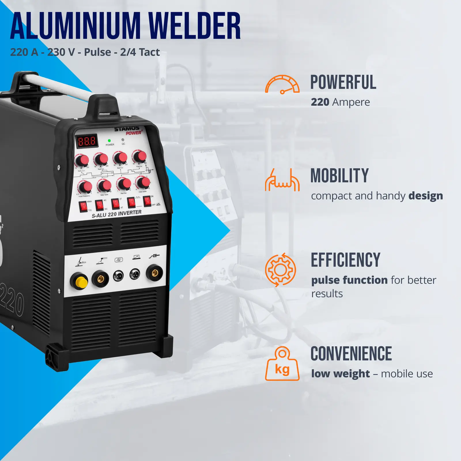 Stamos Germanyn ALU- hitsauskone S-ALU 220 soveltuu sekä TIG- että MMA-hitsaukseen. Molemmissa tapauksissa käytettävä hitsausvirta voidaan valita 10 – 220 ampeerin väliltä ja hitsausmenetelmä työstettävän metallin ja olosuhteiden mukaan. Tämä hitsauskone soveltuu jopa ohuiden peltien hitsaukseen. 60 prosentin toimintakertoimella hitsausvirran maksimiteho on 220 A. Kun teho pudotetaan 170 A voidaan hitsata keskeytyksettä. Suuren tehonsa ansiosta laite voi hitsata erittäin tarkasti ja nopeasti jopa 8 mm paksuisia metallikappaleita. ALU-hitsauskoneessa on selkeä käyttöpaneeli, jota voi käyttää vaivattomasti myös hitsauskäsineet kädessä. Viidestä vipukytkimestä voidaan suoraan valita hitsaamisen perustoiminnot (TIG, MMA, AC, DC, 2T, 4T, pulssi, ON, OFF). Lisäksi 8 portaattomasta vääntökytkimestä voidaan valita tarvittavat arvot, kuten esimerkiksi pulssitaajuus, pulssileveys, jälkivirtausaika ja Clean Width-arvo. Suuren LED-näytön avulla tarkkailet joka hetkistä ampeerilukua. Hitsauskoneella AC-DC TIG-hitsaus on mahdollista, joten voit hitsata joko tasavirralla (DC) tai vaihtovirralla (AC). Vaihtovirta soveltuu parhaiten kevyiden metallien, kuten alumiinin ja titaanin käsittelyyn. Tasavirtaa voidaan käyttää lujien metallien ja niiden seosten, kuten teräksen, ruostumattoman teräksen, kuparin ja messingin hitsaamiseen. Hitsaus sujuu pienellä liekillä ja vähillä roiskeilla, joten hitsaussaumasta tulee erittäin laadukas ja siisti, eikä se aiheuta juurikaan epämuodostumia. Hitsaus onnistuu erilaisissa asennoissa, joko pään yläpuolella tai pystysuorassa. TIG-hitsauksessa voidaan valita erilaisia toimintoja, kuten pulssitoiminto, joka mahdollistaa muun muassa ohuiden peltien hitsaamisen erittäin tarkasti. Tätä varten voidaan erilaiset parametrit, kuten alku-, perus- ja loppuvirta valita ja säätää vääntökytkimestä. Hitsauskone käyttää MOS-FET-teknologiaa, joka takaa parhaan mahdollisen tehon laitteen pienestä koosta ja alhaisesta painosta huolimatta. Tehokkuustaso on näin ollen 93 %! Hitsausvirta on erittäin tasainen ja tuloksena on täydellinen hitsaussauma. Hitsauksen valokaari aktivoituu korkeataajuus – eli HF-sytytyksellä. TIG-hitsauksen tyypilliset toiminnot, kuten tasa- tai vaihtovirran ja 2- tai 4-tahtitoiminnon valinta voidaan suorittaa suoraan ja ongelmitta käyttöpaneelista. Lisäksi hitsauskoneessa on liitäntä polkimelle, jonka voit erikseen tilata expondolta. Puikkohitsaukseen (MMA) ei tarvita ulkoista kaasua, jolloin hitsaaminen onnistuu hyvin myös vaikeissa olosuhteissa, kuten tuulessa ja silti siistien hitsaussaumojen saavuttaminen on mahdollista. Hitsauskone vakuuttaa tasaisella hitsausvirrallaan, jolloin on mahdollista aikaansaada erittäin laadukkaita hitsaussaumoja monenlaisia metalleja työstettäessä. Elektrodinpidikkeeseen sopii suuret, jopa 4 mm elektrodit. Puikkohitsausmenetelmällä hitsaat eripaksuisia 1,5 – 8 mm metalleja ja niiden seoksia, kuten terästä, rautaa, valurautaa, nikkelia tai kuparia. Hitsauskoneella voidaan suorittaa metallisten kaiteiden, portaiden, porttien, ovien, säiliöiden jne. asennus- ja huoltotöitä ammattimaisesti. Tuuletin ja hitsauskoneen ylikuumenemissuoja turvaavat koneen pitkäkestoisen käytön ja lisäävät sen käyttöikää. Metallisen hitsauskotelon kahva helpottaa laitteen kantoa ja mukana toimitettavat 3 – 4 metrin letkut ja johdot antavat maksimaalista liikkumisvaraa hitsaamiseen.