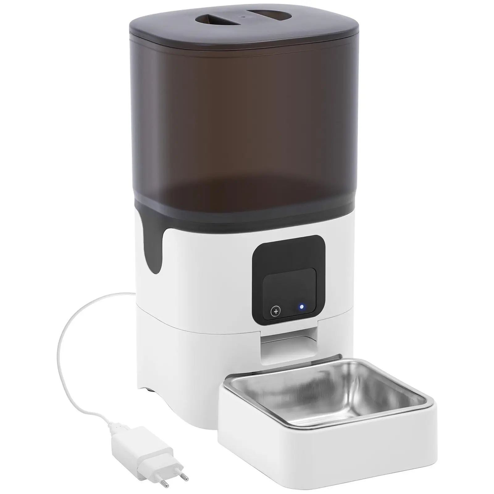 Wiesenfieldin automaattinen koirien ja kissojen ruokinta-automaatti ajastimella takaa lemmikkisi optimaalisen hoidon – myös silloin, kun et itse ole paikalla. Ruokinta-automaatissa on suuri syöttösäiliö, yksilöllisesti säädettävät annostelusyklit ja syöttömäärät sekä irrotettavat osat helppoa puhdistusta varten. Kissojen ja koirien ruoka-annostelija toimii erittäin yksinkertaisesti: Täytä vain sen läpinäkyvä säiliö haluamallasi ruoalla. Turvallisen sulkumekanismin ansiosta ruoka pysyy ensin lemmikkisi ulottumattomissa. Automaatti annostelee halutun määrän ruoan vasta esiasetettuun aikaan. Voit määrittää automaatin annostelemaan 4 ateriaa päivässä ja enintään 6 annosta ateriaa kohden. Voit tehdä tämän helposti intuitiivisella, LED-näytöllä varustetulla ohjauspaneelilla tai mobiililaitesovelluksen kautta. Suuren, 6 litran tilavuutensa ansiosta tämä kissan ja koiran ruoka-annostelija kattaa pidempiäkin poissaolojaksoja ja ruokkii useita eläimiä samanaikaisesti. Ruoka-automaatin läpinäkyvän säiliön ansiosta näet yhdellä silmäyksellä, milloin se on täytettävä uudelleen. Lemmikkiesi ruoan säilytyksen ja annostelun ohella kaksiosainen virransyöttö verkkoliitännän ja paristojen kautta takaa automaatin luotettavan toiminnan. Näin varmistat, että eläimesi saavat riittävästi ruokaa myös sähkökatkon sattuessa. Kestävä syöttölaite on valmistettu erityisen kestävistä materiaaleista, kuten ruostumattomasta teräksestä ja ABS-muovista. Tästä syystä voit puhdistaa sen nopeasti ja perusteellisesti. Lemmikin ruokinta-automaatin yksittäiset elementit, kuten säiliö ja ruokakuppi, voidaan helposti irrottaa ja vaihtaa, samoin kuin sen leveä pohja, joka tekee siitä myös erittäin vakaan.