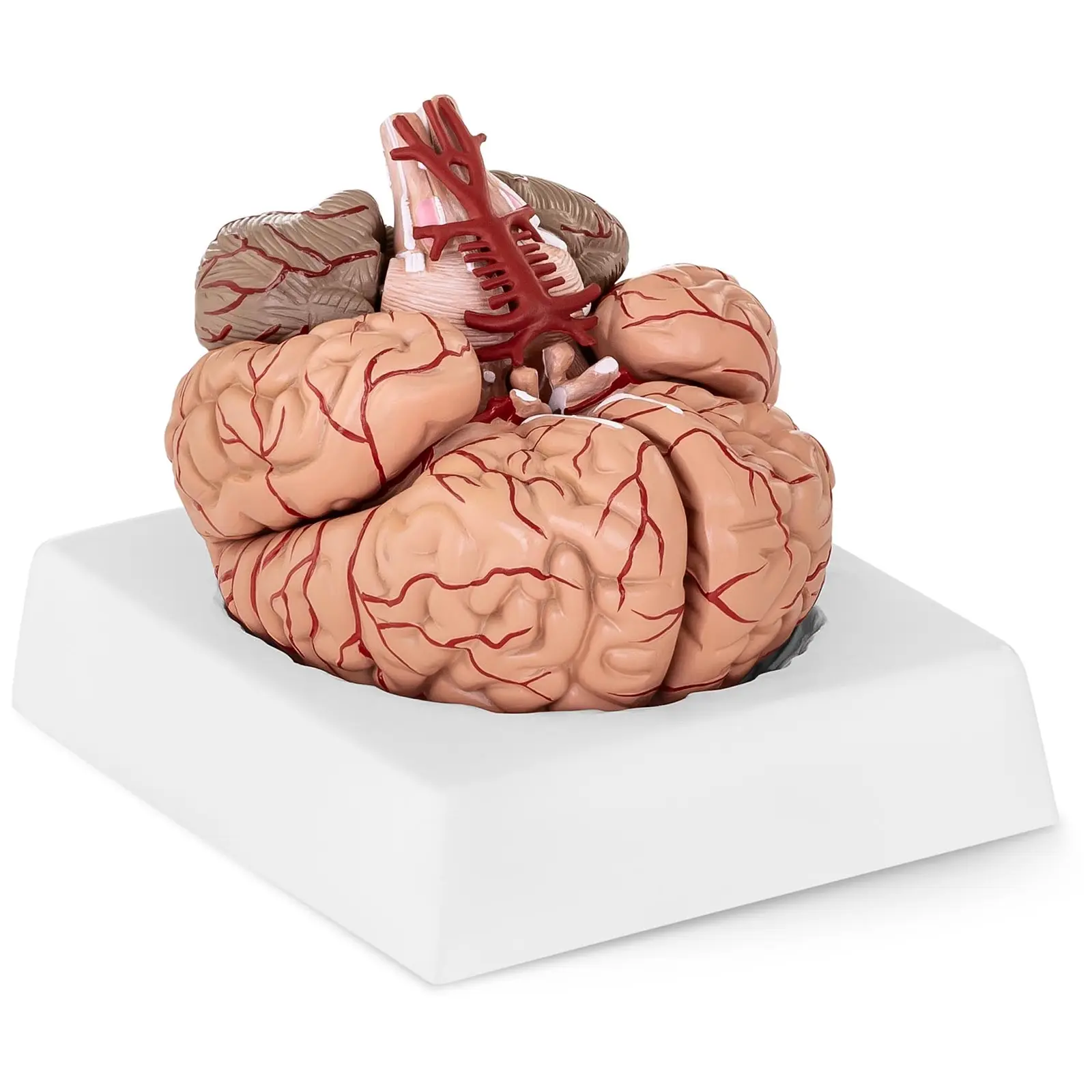 Physan anatominen malli – aivot PHY-BM-1 on kolmiulotteinen malli ihmisen aivoista niiden luonnollisessa koossa (1:1). Malli kuvantaa aivorungon, pikkuaivojen, aivopuoliskojen ja valtimoiden ulkoisia ominaisuuksia, jotka esitetään 9 yksittäisessä segmentissä. Näin tätä synteettistä mallia voi käyttää erityisesti visualisointiin ja opetukseen, jolloin se on ihanteellinen täydennys sairaaloihin, lääkäriasemille, kouluihin tai yliopistoihin. Aito anatominen malli – aivot suunniteltiin luonnollisen kokoiseksi (1:1) ja tarjoaa mahdollisuuden tarkkailla aivojen rakennetta 9 yksittäisessä segmentissä. Luonnollisten mittojensa ansiosta malli on loistava kuvaus ja tiedonjakaja! Täten anatominen malli – aivot löytää paikkansa niin opetustilanteissa kuin myös lääkärin vastaanotoilla. Erittäin luonnollisen kuvauksen ansiosta mallin avulla voidaan selittää kaikki ihmisaivojen toiminnot, mikä tekee siitä korvaamattoman välineen lääkärin vastaanotoille ja aivojen anatomiaa käsittelevään opetukseen! Malli esittää aivojen anatomisen rakenteen erittäin luonnollisesti. Täten potilaat voivat helpommin ymmärtää lääkärin selostusta. Samoin malli tukee oppimisprosessia ja sallii rakenteen tarkan analysoimisen. Sairaudet ja myös aivotoimintojen monimutkaiset suhteet voidaan kuvailla yksinkertaisemmin. Tällä mallilla saat luonnonmukaisen kopion ihmisaivoista! Kaikki aivorakenteet ovat yhtä selkeästi havainnollistettuna kuin myös yksittäiset alueet ja yksityiskohdat. Sekä isot aivot, väliaivot (diencephalon), pikkuaivot (cerebellum), keskiaivot (mesencephalon) että myös aivorunko ovat yhtä tarkasti esitettyinä. Vakuutu erittäin luonnollisesta 3D-mallista! Jokainen ihmisaivon osa on esitetty tässä mallissa mieleenpainuvasti. Anatominen malli – aivot jäljittelee erityisen tarkasti aivojen perusrakennetta ja on täten välttämätön kaikille lääketieteen oppilaitoksille! Malli koostuu 9 realistisesta segmentistä, jotka on valmistettu erityismuovista. Myös käytetyt värit ovat parhaimman laadun mukaisia! Malli voidaan koota muutamassa käden käänteessä ja asettaa esille. Koska eriosat ovat luonnollisen aivonosien muotoisia ja yhteensopivia sujuu kokoaminen nopeasti ja intuitiivisesti! Täten malli on hetkessä käyttövalmis. Toimituksen sisältöön kuuluu lisäksi vankka jalusta, jolle 3D-malli voidaan asettaa. Jalusta tarjoaa neliömuotoisen 195 x 195 millimetrin alustan ja takaa sen, että anatominen malli – aivot voidaan asettaa esille varmasti ja tukevasti!