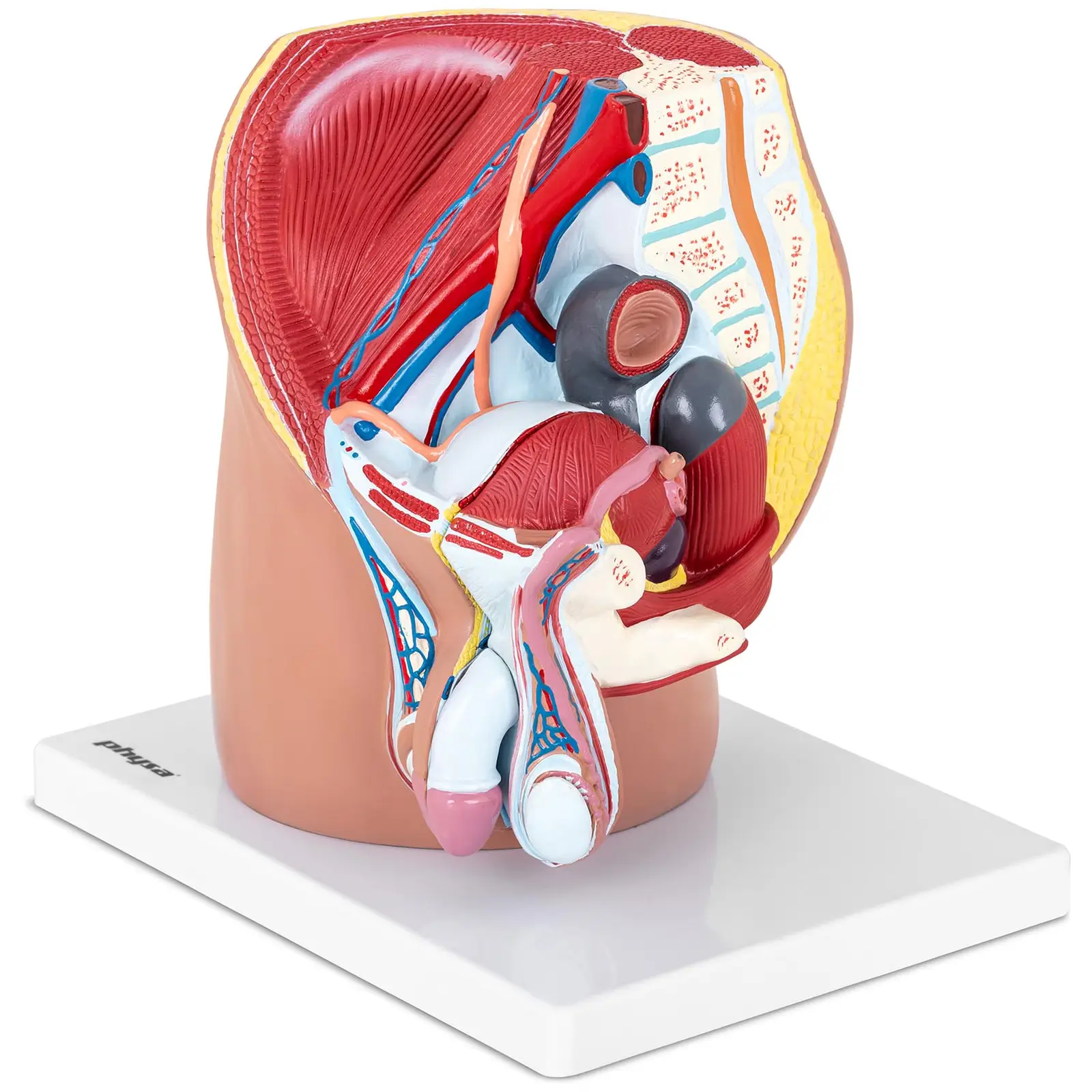Physan kolmiulotteinen anatominen malli – lantio PHY-MP-1 on kaikkea, mitä voit odottaa realistiselta miehen lantion mallilta: Kaikki etu- ja keskileikkauksena havainnollistetut yksityiskohdat ovat tarkkoja ja huolellisesti väritetty. Tämä on ihanteellinen apuväline oppimiseen ja eri harjoitustehtäviin lääkärien vastaanotoille, sairaaloihin, kouluihin ja yliopistoihin. Miehen lantion mallin mittakaava 1:1 vastaa sen luonnollista kokoa. Kaikki sen elementit on muotoiltu yksityiskohtaisesti ja realistisesti. Luonnollisen koon ansiosta lantion rakenne ja toiminta on helpompi käsittää. Mallissa on sukuelimien eli peniksen ja kivesten lisäksi myös vatsaseinämän lihakset, virtsarakko, eturauhanen, peräsuoli, osa selkärankaa, häntäluu sekä lantion alueen lihakset ja verisuonet esitettyinä selkeästi. Havainnollisuutta lisää, että peniksen, peräsuolen ja peräaukon sekä virtsarakon ja eturauhasen voi irrottaa. Tämä anatominen lantion malli on lähestulkoon korvaamaton apuväline kaikille sisätautilääkäreille tai opintoihin. Tärkeät toiminnot ja sairaudet on helppo havainnollistaa tällä 3D-mallilla. Aidon tuntuinen ulkonäkö auttaa ymmärtämään ja oppimaan lantion rakennetta ja toimintoja. Kolmiulotteisen mallin avulla miehen sukupuolielimien, virtsarakon ja virtsateiden sekä eturauhasen ja peräaukon toimintojen analyysi on tarkempaa. Luonnollisen kokoinen malli toimitetaan käyttövalmiiksi koottuna. Kaikki yksittäiset osat ovat jo oikein paikoillaan. Tätä lantion mallia voi käyttää koska vain ja missä vain – näin säästät kallista aikaasi. Materiaalina käytetyn kevyen erikoismuovin ansoista malli vaikuttaa erityisen luonnolliselta. Tämä hyvin realistinen lantio on yksi tarkimmista myynnissä olevista kolmiulotteisista malleista. Lantion mallin vankka rakenne on todiste sen korkeasta laadusta. Vakaana jalustana toimii mallin oikea reisi. Huippulaadukas lantion malli!