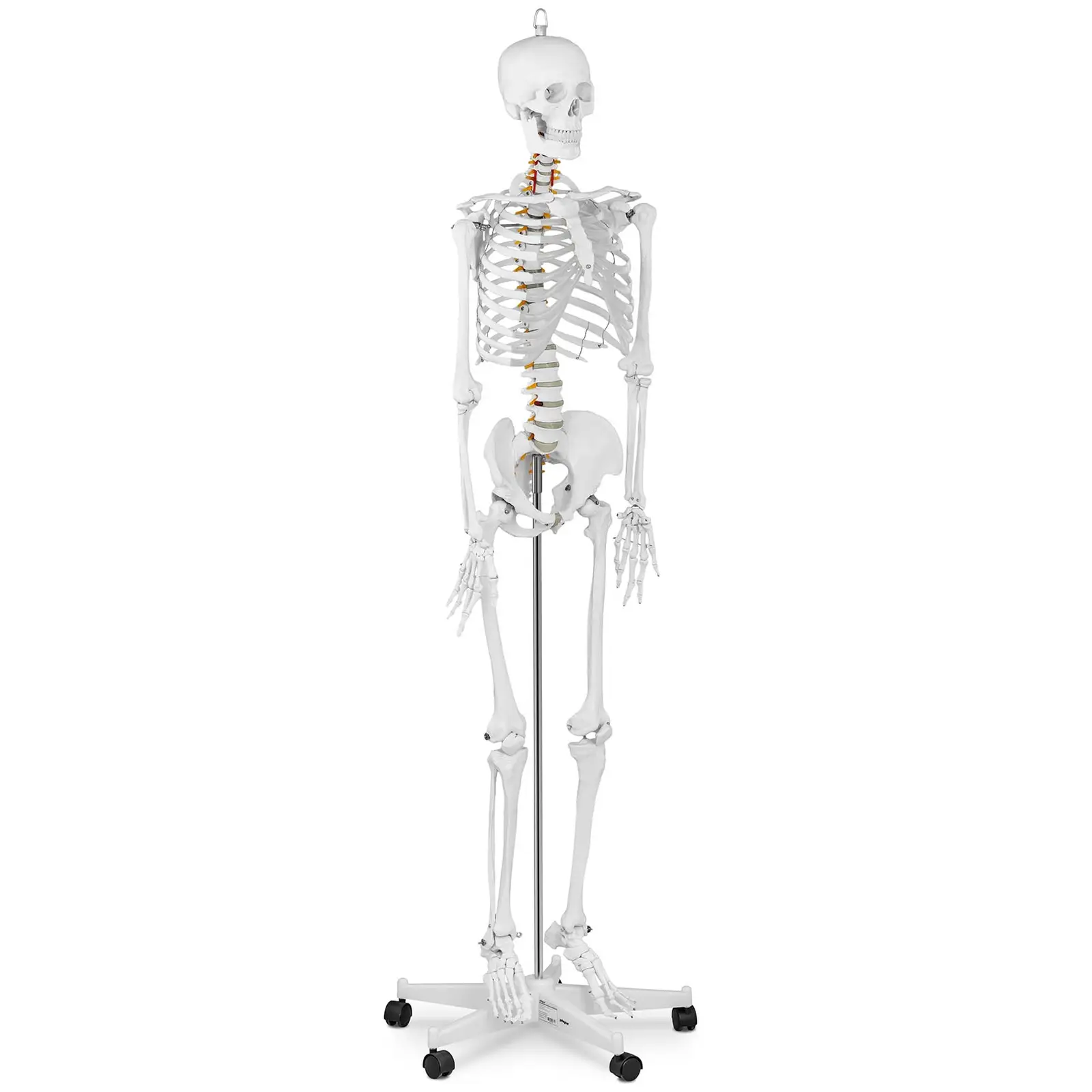 Physan anatominen malli – luuranko PHY-SK-1 on totuudenmukainen jäljennös ihmisen luurangosta luonnollisessa koossa (176 cm) suhteessa 1:1. Se sisältää kaikki luurangon osat erittäin yksityiskohtaisesti. Tähän lukeutuvat ennen kaikkea hartiat, kädet, jalat, pääkallo, kylkiluut, selkäranka, lantio sekä erittäin vaikuttavasti kuvatut selkärangankanavan verisuonet. Luuranko on valmistettu muovista ja sen pinta on niin luonnonmukainen, ettei sitä juurikaan erota aidosta luurangosta. Tämä lääketieteellinen malli on mitä sopivin tarkasteluobjekti opetus- ja havainnollistamistarkoitukseen yliopistoilla, klinikoilla ja kouluissa, kun kyseessä on ihmisen anatomia. Ja sen tulisi kuulua jokaiselle lääkärin vastaanotolle, jotta potilaat voisivat kuvailla liikunta- ja tukielinvaivojaan paremmin. Myös yksityiskäytössä tämä luuranko on mielenkiintoinen tarkastelun kohde. Tämän lääketieteellisen mallin toimituksen sisältöön kuuluu pölysuoja ja suuri värijuliste, jossa on nimetty ja kuvattu kaikki ihmisluurangon osat. Lisäksi opetusmalli vakuuttaa tärkeiden vartalonosien yksityiskohtaisella rakenteellaan. Alaleukaa voidaan liikuttaa ruostumatonta terästä olevien jousien avulla ja havainnollistaa siten ihmisen purukaluston toimintaa. Mukana saat lisäksi varahampaat hampaiston yksityiskohtaisempaa tarkastelua varten. Kallon voi myös avata, mikä mahdollistaa sen sisätilan tarkastelun. Myös raajat ja tärkeimmät nivelet, kuten kyynärpää, rannenivelet ja polvinivel ovat liikuteltavia, joten liikuntaelimistön liikkeitä pystytään visualisoimaan erittäin todenmukaisesti. Tämä luurankomalli on erinomainen opetusväline monien värikkäästi merkittyjen osiensa ansiosta. Värit auttavat ymmärtämään ihmisluustoa ja sen liikkeitä ja helpottavat murtumien, nyrjähdysten ja luusirujen analysoinnissa. Hyvälaatuiset ruuvit ruostumattomasta teräksestä takaavat sen, että luurangon osat pysyvät kiinni toisissaan ja paikoillaan, tukevoittavat rakennetta ja pidentävät täten koko mallin elinikää. Tarvittaessa ruuvit on helppo irrottaa. Lisäksi tukitanko, jolla luuranko kiinnitetään jalustaan, on valmistettu ruostumattomasta teräksestä. Tämän materiaalin ansiosta nämä osat pysyvät vuosikymmeniä kiiltävinä, ne eivät kulu ja ovat vieläpä helppo puhdistaa. Luurangon, tukitangon ja jalustan kokoaminen hoituu tarkkaan suunnitellun ruuvisysteemin myötä minuuteissa. Lujatekoisessa jalustassa on viisi 360°-kääntyvää kevyesti liikkuvaa pyörää, joiden avulla opetusluurankoa voidaan mukavasti liikutella paikasta toiseen ilman, että luurankorakenteen vankkuus kärsii. Tukitangossa on lisäksi silmukka, josta se voidaan tarvittaessa ripustaa esimerkiksi seinään tai kattoon, jolloin sitä voidaan tarkkailla eri kulmista.