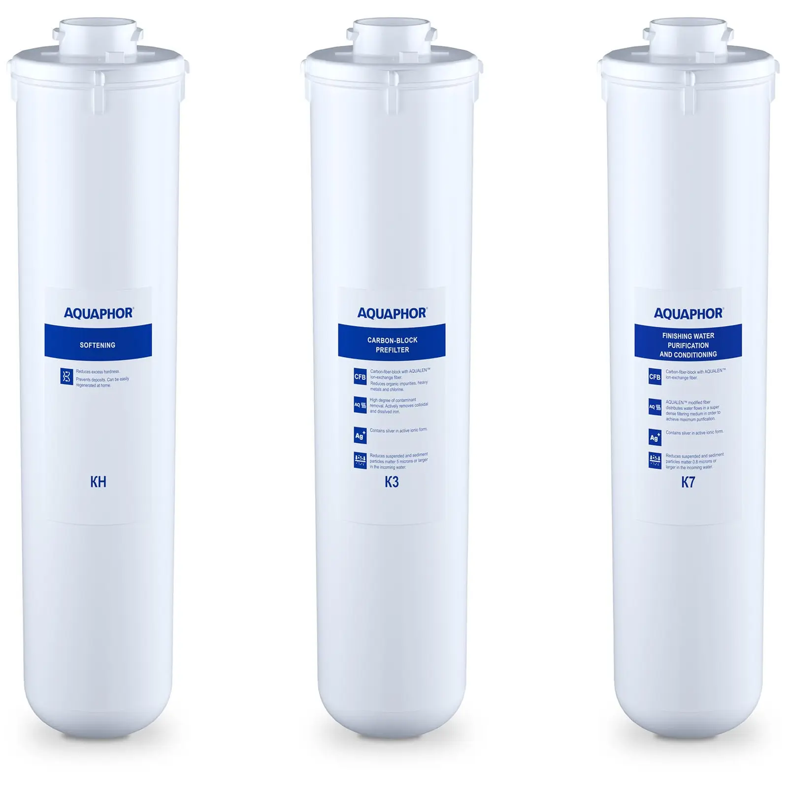 Aquaphor aktiivihiilivesisuodatin CRYSTAL H FILTERS pitää huolen pehmeästä puhtaasta vedestä, josta on 99,99 % kaikki epäpuhtaudet puhdistettu. Paremman makunsa ansiosta se soveltuu erinomaisesti juomavedeksi tai ruoan ja juomien valmistamiseen. Sarja koostuu kolmesta suodattimesta, jotka on suunniteltu aktiivihiilijärjestelmien vedenpehmentäjälaitteille CRYSTAL H, CRYSTAL B ECO sekä juomajärjestelmä FOUNTAIN WATER DISTIBUROR:lle. Kolme aktiivihiilisuodatinta rakentuvat toistensa varaan ja varmistavat siten parhaan veden laadun: K3-suodatin on aktiivihiilisuodatin, jossa on ioninvaihtomassaa Aqualen kuitutekniikalla sekä hopeaioneja. Tämä suodatin poistaa vähintään 5 mikronin hiukkasia – kuten raskasmetalleja, rautaa, aktiivista klooria tai orgaanisia yhdisteitä. Se suojaa seuraavia suodatinvaiheita ja pidentää suodatinjärjestelmän käyttöikää. Aktiivihiilisuodatin K7:ssa on hienoksi jauhettua aktiivihiiltä kookoskuorista, joka yhdessä aqualen-kuitujen ja aktiivisen ionihopean kanssa poistaa luotettavasti vähintään 0,8 mikronin hiukkasia vedestä. Jälleenkäsittelyprosessin viimeisenä vaiheena KH -suodatin varmistaa veden pehmenemisen. Suodattimien vaihto on erittäin helppoa ja ne vaihdetaan suoraan kotelon kanssa. Näin voidaan välttää kosketusta epäpuhtauksien kanssa. Suodattimien säännöllinen vaihto varmistaa suodattimen pitkäikäisyyden ja aina korkean vedenlaadun. Aktiivihiilisuodattimen vaihtoa suositellaan noin 8000 litran jälkeen tai kerran vuodessa. Vedenpehmentäjän vaihtamisaika riippuu veden kovuusasteesta. Tämän vaihtoon suositellaan seuraavia välejä: veden kovuus 1 – 2: noin 500 – 1 000 litran jälkeen; veden kovuus 2 – 3 noin 330 – 500 l: n jälkeen; veden kovuus 3 – 4 noin 250 – 330 l: n jälkeen; veden kovuus 4 – 5 noin 200 – 250 litran jälkeen.