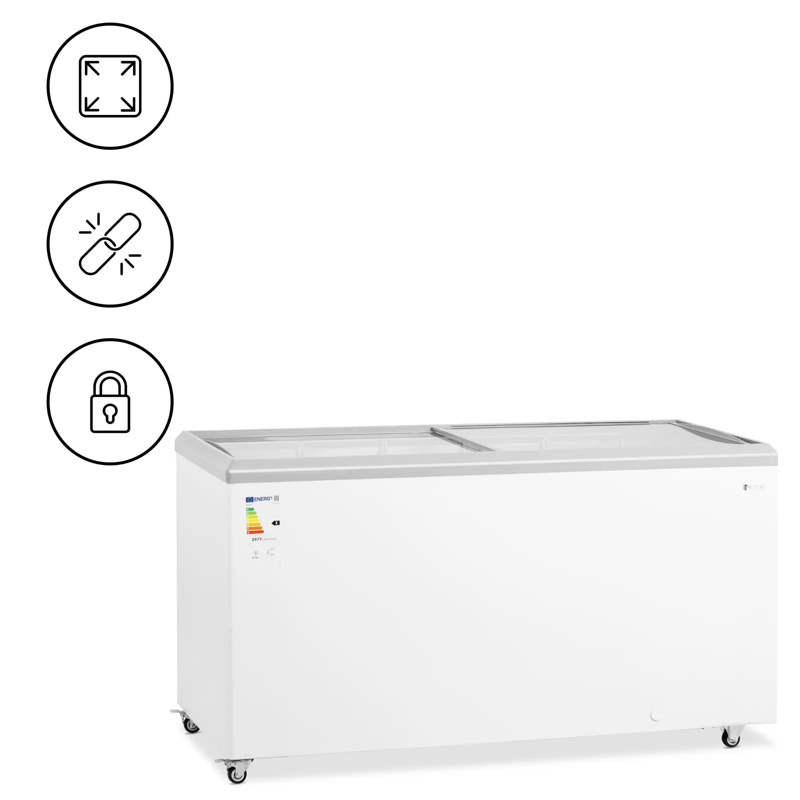 Royal Cateringin lukittava arkkupakastin tarjoaa modernin ratkaisun elintarvikkeiden pakastamiseen tai kylmätuotteiden näyttävään esilläpitoon Termostaatilla ja lasisilla liukuovilla varustettu pakastin on elementissään monenlaisissa ammattikeittiöissä, kuten pikaruokaravintoloissa, baareissa, hotellikeittiöissä tai pitopalveluyrityksissä. Myös jääpalat tai virkistävät jäätelöt löytävät paikkansa selkeästi järjestetystä pakastimesta. Pakastearkun kapasiteetti on 450 litraa, joten se tarjoaa käyttöösi runsaasti tilaa pakasteiden säilytykseen. Suurten lasisten liukuovien ansiosta voit tarkistaa pakastimen sisällön yhdellä silmäyksellä lasiovia avaamatta. Näin sinulla on aina yleiskuva kaikista pakasteistasi. Pakastinarkku jäähdytetään kylmäaineella R290, jolla on erinomaiset termodynaamiset ominaisuudet, ja joka tekee vaikutuksen korkealla energiatehokkuudellaan. Sisäänrakennettu 340 W:n kompressori varmistaa, että tavoitelämpötila saavutetaan nopeasti, ja että se pysyy vakaana. Voit säätää halutun lämpötilan eri elintarvikkeille -15 ja -18 °C:n välillä. Termostaatti ohjaa lämpötilaa tarkasti ja on erityisen energiatehokas. Tämä energiatehokas arkkupakastin sisältää 5 käytännöllistä koria, joiden avulla ylläpidät hyvää järjestystä. Ne sopivat erinomaisesti myös pienempien pakasteiden säilytykseen. Voit ottaa nostaa korit ulos pakastimesta, kun et tarvitse niitä. Pakastimen runko on terästä ja sisäpinta kohokuvioitua alumiinia. Tästä syystä se on erityisen tukeva ja kestävä. Lisäksi alumiini on ihanteellinen materiaali pakastuskäyttöön, sillä se ylläpitää kylmää lämpötilaa erinomaisesti. Nämä laadukkaat metallit ovat myös erityisen helppohoitoisia, ja pakastimen valkoiset ja harmaat pinnat pitävät huolen ammattimaisesta ulkonäöstä. Kevyesti rullaavien pyörien ansiosta myös pakastimen siirtäminen haluttuun paikkaan käy helposti.