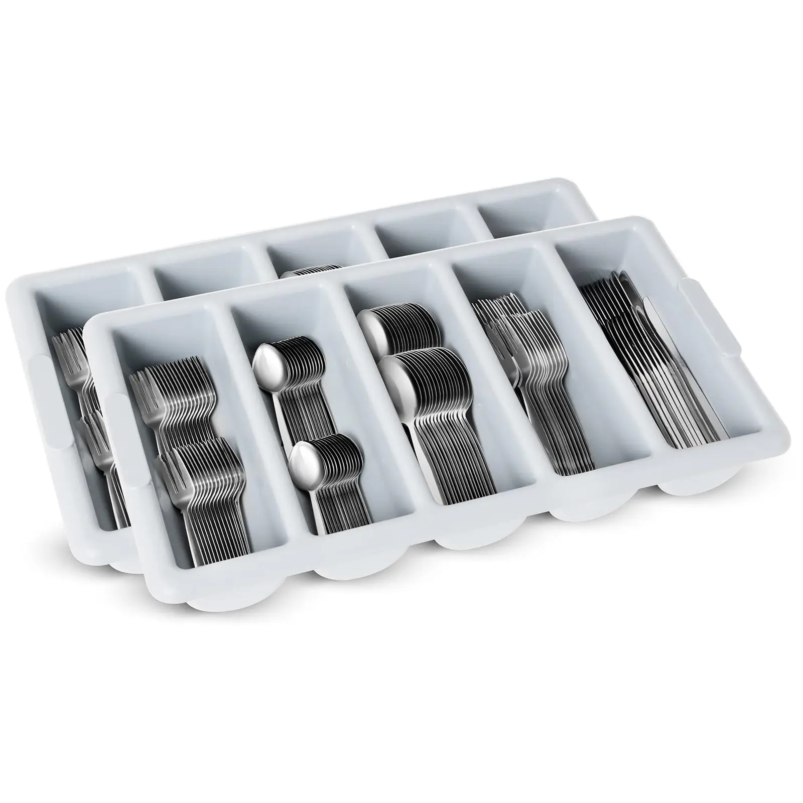 Royal Cateringin aterinsetti Gastro RCCT 310S2T on ajattoman elegantti ruostumatonta terästä oleva ruokailuvälinesetti. Kokoelma koostuu 310 osasta ja on luultavasti markkinoiden kattavin aterinsetti, jolla syö samanaikaisesti jopa 60 vierasta. Royal Cateringin hyvälaatuiset aterimet ovat helposti puhdistettavia, astianpesukonepestäviä eikä sormenjäljet tartu niihin herkästi, joten ne antavat arvokkaan vaikutelman kaikenlaisiin kattauksiin! Ihanteellisina ravintolatarvikkeina näiden eleganttien ja ajattomien ruokailuvälineiden ei tulisi puuttua yhdestäkään hotellista, ravintolasta, kahvilasta tai baarista. Lisäksi setin mukana saat kaksi aterinlaatikkoa ruokailuvälineiden kätevään säilytykseen. 310-osainen aterinsetti Gastro vakuuttaa jo ensisilmäyksellä hienolla, klassisella muotoilullaan. Uskollisena tyyliperiaatteelle: „vähemmän on enemmän“, sopivat nämä hillityt mutta tyylikkäät aterimet jokaiseen keittiöön ja jokaiselle pöydälle. Kauniin kaiverruksensa ansiosta aterimet ovat tukevasta ergonomisesta varrestaan huolimatta ajattoman elegantteja. 60 veitsen, haarukan, kakkuhaarukan, lusikan ja kahvilusikan lisäksi settiin kuuluu kaksi aterinlaatikkoa, joissa jokaisessa on viisi lokeroa. Kaikki setin aterimet on valmistettu korkealaatuisesta ruostumattomasta teräksestä, jossa kromipitoisuus on korkea, 18 prosenttia. Ruokailuvälineet ovat täten pitkäikäisyytensä, helppohoitoisuutensa ja korroosionkestävyytensä lisäksi myös täysin neutraaleja kosketuksissa elintarvikkeiden kanssa. Näin ollen ne eivät vaikuta kuumien tai kylmien ruokien tai juomien makuun. Royal Cateringin aterimet ovat hypoallergeenisia ja nikkelivapaita – nykypäivänä erilaisten yliherkkyyksien yleistyessä tärkeä turvallisuustekijä, joka laiminlyödään liian usein. Lisäksi Gastro aterimet ovat erityisen sileällä ja pienihuokoisella pinnallaan erittäin hygieenisiä. Biologisesti inertti valmistusmateriaali minimoi kontaminaatioriskin ja on terveydellä täysin harmiton. Aterimet ovat helppohoitoisia ja astianpesukoneen kestäviä. Sileät pinnat takaavat ongelmattoman puhdistuksen ja tekevät aterimista hygieniastandardien mukaisia. Lisäksi korkealaatuisiin ruostumaton teräspintoihin eivät tahrat tai sormenjäljet tartu, joten ne näyttävät aina juuri kiillotetuilta ja antavat arvokkaan vaikutelman kattaukseesi. Kaikkien Royal Cateringin ruokailuvälineiden tapaan myös ruostumatonta terästä oleva aterinsetti Gastro erottuu edukseen pitkäikäisyydellään. Hyvälaatuisen valmistusmateriaalinsa, hillityn ja elegantin muotoilunsa sekä täydellisen valmistuksensa ansiosta näyttävät aterimet myös useasti toistuvan ja monivuotisen käytön jälkeen kuin uusilta. Ruostumattomien teräsaterimien mukana saat kaksi aterinlaatikkoa mukavaan säilytykseen ja lajitteluun! Laatikot ovat vankkaa, kuumuudenkestävää ja terveydelle vaaratonta PP-muovia. Jokaisessa laatikossa on viisi yksittäistä lokeroa, joihin voit järjestää ja lajitella aterimet. Hyödy näistä kaupan päälle saatavista lisätarvikkeista!