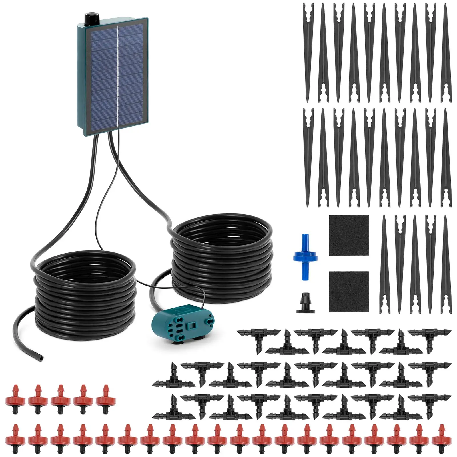 Sinulla ei ole vesi- tai sähköliittymää ja haluat kastella kasvisi tehokkaasti? hillvert:n aurinkokastelujärjestelmällä tämä on lasten leikkiä! Se saa virtansa aurinkopaneelista, joka lataa akun, kun aurinko paistaa. Pumppu saa veden säiliöstä, kuten vesiputkesta. Sinun on vain varmistettava, että se on aina täynnä tarpeeksi vettä. Ja mikä parasta: kastelu toimii täysin automaattisesti. Aseta tippuputket, jotka tuovat veden laitokseen, 5 m pitkään letkuun T-kappaleiden avulla. 25 tiputtimen ansiosta voit toimittaa kastelujärjestelmällä jopa 25 kasvia. Kiinnitä tippuputket maahan pienillä koukuilla. Ohjaa pumppu vesisäiliöön, joka syöttää veden letkuun. Valitse kasteluaika ohjausyksiköstä: 1 tai 5 minuuttia/24 tuntia; 2 tai 8 minuuttia/48 tuntia; 3 tai 12 min/72 tuntia. Kun aurinkopaneeli on ladannut akun, kastelu tapahtuu täysin automaattisesti valitun ajan. Pumppu on erittäin tehokas ja voi jopa imeä vettä jopa 2 metrin syvyyteen asti. Voit esimerkiksi hyödyntää optimaalisesti sadeveden vesipussistasi. Jos puutarhassa on pieniä kaltevuutta, sekään ei ole ongelma. Pumppu pumppaa vettä 3 m korkeuteen. Pumppu saa virtaa akusta, jonka aurinkopaneeli on ladannut täyteen vain 6-8 tunnin auringonpaistetta. Kun kasteluaika on 12 minuuttia 72 tunnin välein, sähköä on aina tarpeeksi.