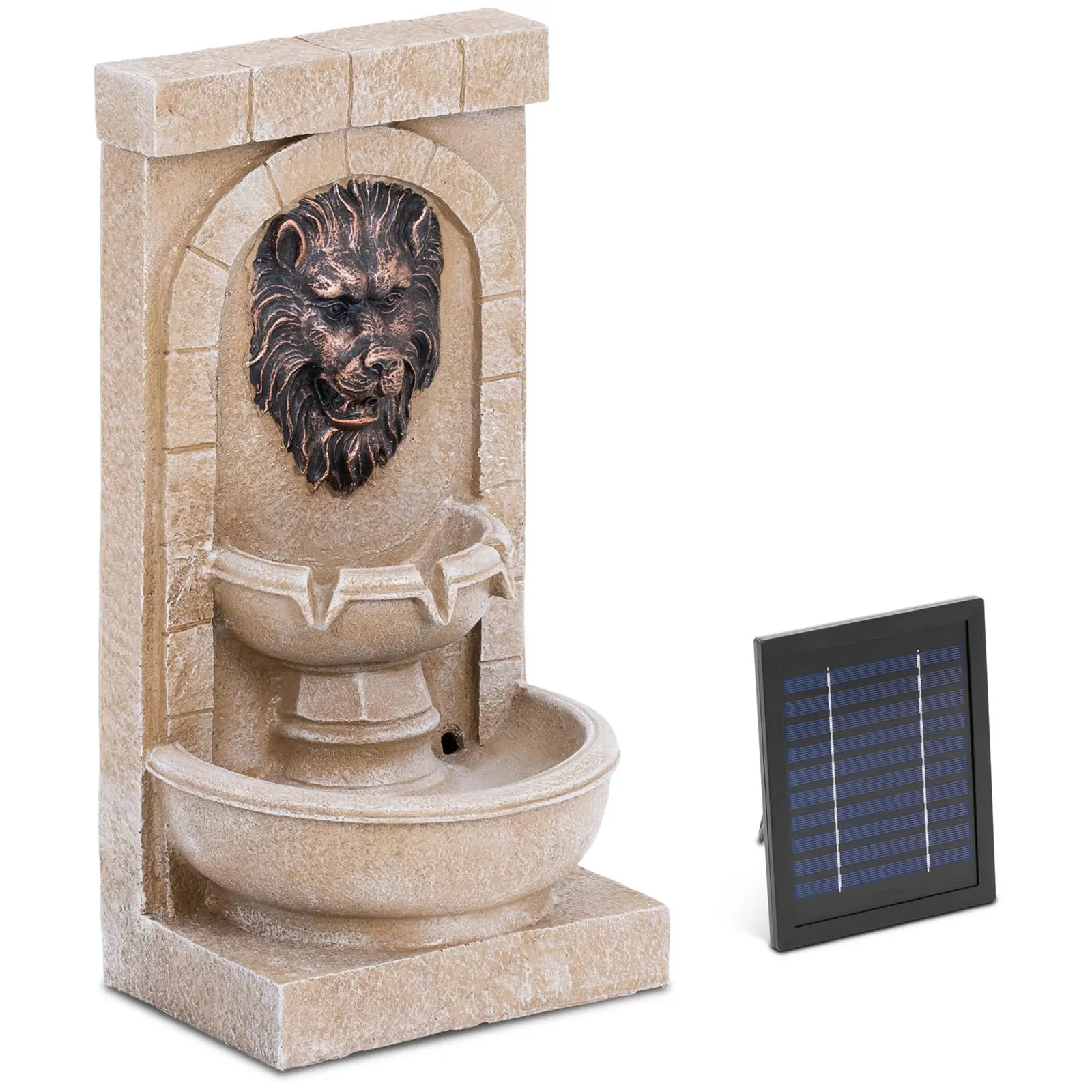 Onko sinulla joskus tunne, että puutarhastasi puuttuu jotain? Entä puutarhan suihkulähde! Sitä käytetään aurinkopaneelilla, veden lempeä aaltoilu luo miellyttävän tunnelman ja viimeisenä mutta ei vähäisimpänä se näyttää houkuttelevalta: suunnitellusta leijonanpäästä, jonka vesisuihku virtaa kahdella tasolla, on varmasti juhlaa. puutarhasi silmille, mikä antaa puutarhasi kokonaiskuvalle ratkaisevan korostuksen. Tasaisen takaosan ansiosta voit sijoittaa suihkulähteen optimaalisesti puutarhan reunaan tai seinän eteen. Vesiominaisuuden avulla saavutat miellyttävän mikroilmaston, joka vaikuttaa positiivisesti ympäröiviin kasveihin. Ja linnut ottavat kiitollisena suihkulähteen veden lähteenä. Vesiominaisuus tarjoaa ympäristöystävällistä sähköä aurinkopaneelista, joka on varastoitu laadukkaaseen litiumakkuun. Tämä käyttää tehokasta pumppua, joka varmistaa veden virtauksen 200 l/h. Jotta et häiritse aurinkosuihkulähteesi visuaalista vaikutelmaa puutarhassa, aseta aurinkopaneeli 500 cm pitkällä kaapelilla valovoimakkaaseen paikkaan koristesuihkulähteen ulkopuolelle. Yöllä integroitu LED-valaistus varmistaa tunnelmalliset tunnit. Cascade-suihkulähde on valmistettu polyresiinistä. Materiaali ei ole vain vedenpitävä, vaan myös erittäin vakaa ja kestävä, jotta puutarhasi suihkulähde kestää sään kuin sään. Turvallista ulkokäyttöä varten vedenpitävä pumppu on varustettu suojausluokalla IPX8, ja aurinkokennot on suojattu roiskevedeltä suojausluokan IP44 ansiosta. Huomautus: Akku ei ole toimitettaessa ladattu täyteen. Anna aurinkomoduulin ladata akkua 2 päivää ennen tuotteen käyttöä.