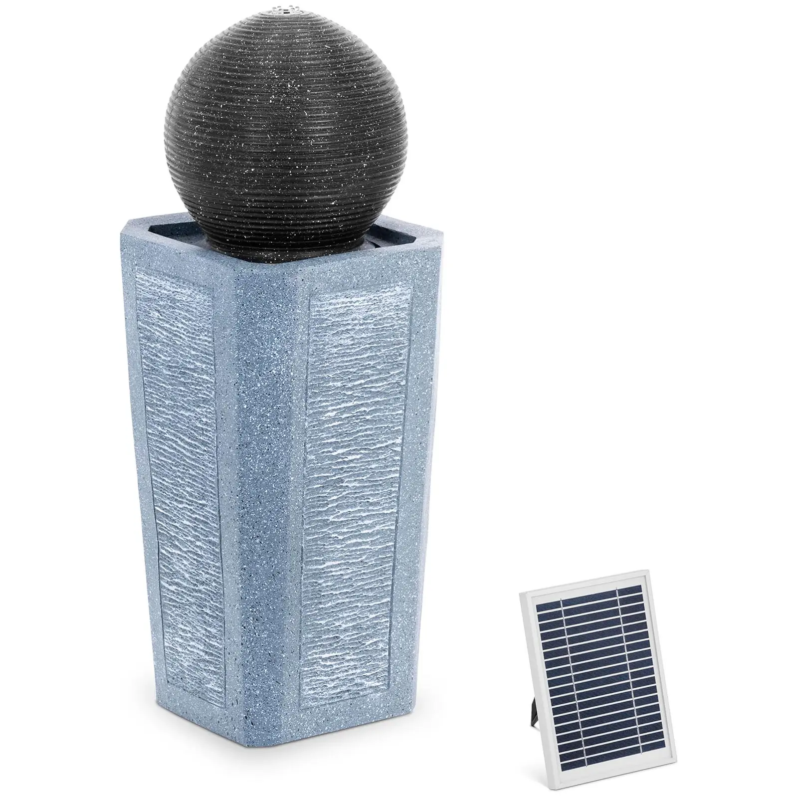 Puuttuuko pihastasi viimeinen silaus? Tyylikäs suihkulähde puutarhaan tai terassille täydentää minkä tahansa ulkoalueen yleisilmettä! Aurinkokenno-suihkulähteen lempeä veden liplatus luo miellyttävän tunnelman, ja näyttää samalla tyylikkäältä. Vesiaihe pylväällä ja kuulalla on vaikuttava katseenvangitsija ja tuo puutarhasi ilmeeseen täydellisen korostuksen. Vesielementti saa myös aikaan miellyttävän mikroilmaston, jolla on positiivinen vaikutus sitä ympäröiviin kasveihin. Suihkulähde aurinkopaneelilla saa virtansa ympäristöystävällisestä aurinkosähköstä, joka varastoituu korkealaatuiseen litiumakkuun. Akku puolestaan syöttää virtaa pumpulle, jonka virtausnopeus on jopa 300 l/h. Jotta suihkulähteen visuaalinen vaikutelma puutarhassa ei häiriinny, voit asettaa aurinkokennon 500 cm pitkän johdon ansiosta haluamaasi valoisaan paikkaan. Integroidun LED-valaistuksen ansiosta suihkulähde on lisäksi erittäin näyttävä myös pimeällä. Puutarha-suihkulähde on valmistettu polyresiinistä. Materiaali ei ole ainoastaan vedenpitävää, vaan myös erityisen pitkäikäistä. Tästä syystä suihkulähde onkin erityisen säänkestävä. Turvallista ulkokäyttöä varten vesitiivis pumppu on varustettu IPX8-suojaluokalla. Suojaluokan IP44 ansiosta myös aurinkokennot on suojattu roiskevedeltä. Huomautus: Akku ei ole ladattu täyteen toimitettaessa. Lataa aurinkomoduulia 2 päivän ajan ennen tuotteen käyttöönottoa.