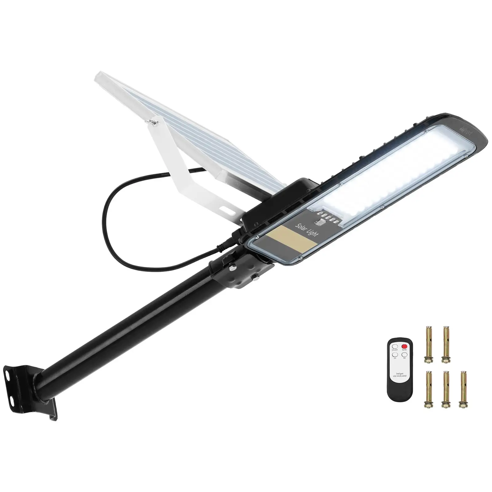 Valoa aurinkoenergialla: Tämä hillvertin aurinkokenno-ulkovalaisin on energiaa säästävä ratkaisu kulkuväylien, ajoteiden ja pysäköintialueiden valaisemiseen. Tehokas ulkovalo tekee vaikutuksen lyhyellä latausajallaan ja pitkällä toimintajaksollaan. Lisäksi 84 LEDin ja 6 000 – 6 500 K:n ansiosta se tarjoaa reilusti valoa pimeään. Aurinkokenno-ulkovalo toimii puhtaalla aurinkoenergialla, joten se ei aiheuta ylimääräisiä sähkökustannuksia. Valaisin onkin käytössä myös erittäin ympäristöystävällinen. Yksikiteinen aurinkokenno lataa laitteen akun 4 – 6 tunnissa – jopa hämärässä tai sateisella säällä. 6 Ah:n kapasiteetin ansiosta voit valaista pimeitä jalkakäytäviä jopa 16 tunnin ajan. Valaisimen 84 LEDin käyttöikä on 50 000 tuntia, mikä tarkoittaa, että ne kestävät käyttöä yli 5 vuotta. Tämä ulkovalo aurinkokennolla on helppo asentaa, sillä se ei vaadi toimiakseen sähköjohtoja tai erillistä virtalähdettä. Asenna ulkovalo seinään tai tolppaan kiinni. Suositeltu asennuskorkeus on noin 3 – 5 metriä. Valaisimessa on tunnistin, joka kytkee sen päälle hämärän tullen. Merkkivalo ilmaisee lataustilan. Lisäksi tämä ulkovalo-aurinkokenno sisältää myös kaukosäätimen. Aurinkokennovalaisin on ihanteellinen tapa valaista talosi ja puutarhasi pitkällä aikavälillä. Valaisimen tehokkaan toiminnan varmistavat laadukkaat komponentit sekä pitkäikäiset ja säänkestävät materiaalit. Sen kotelo on valmistettu kestävästä alumiinista ja muovista, ja itse aurinkokenno on päällystetty karkaistulla lasilla. IP65-suojausluokka suojaa valaisinta myös pölyltä ja roiskevedeltä kaikista suunnista.