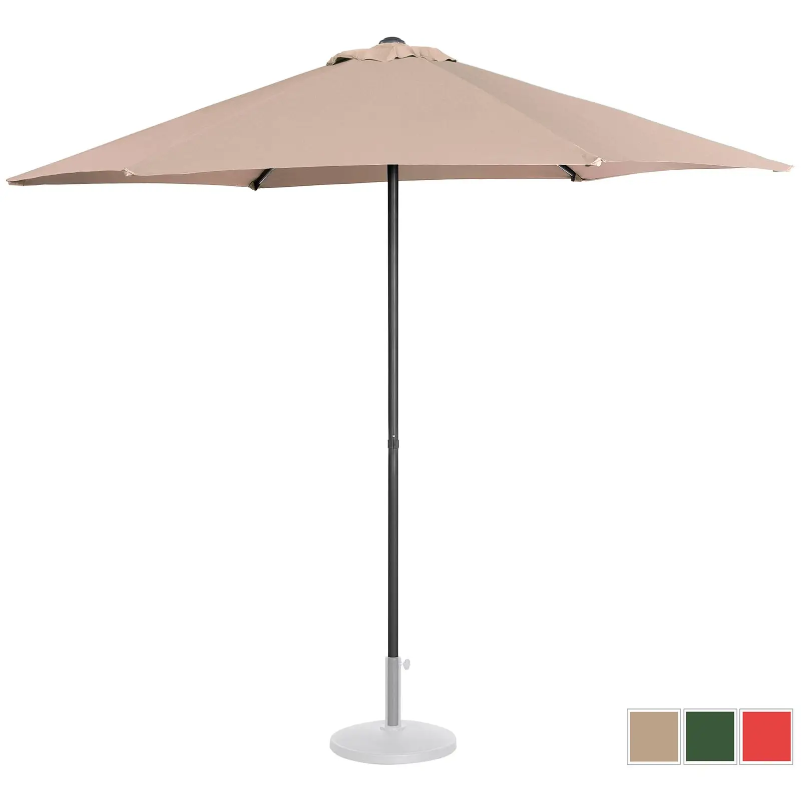 Suuri aurinkovarjo suojaa sinua kuumuudelta ja UV-säteilyltä rentoutuessasi kesällä terassilla tai puutarhassa. Uniprodon ammattilaitevalikoimasta löytyvät puutarhalaitteisiin lukeutuvat aurinkovarjot terassille, puutarhaan tai parvekkeelle vakuuttavat laadukkaalla, modernilla suunnittelullaan ja erityisellä pitkäikäisyydellään. Etsitkö suurta aurinkovarjoa? Kuusikulmainen, halkaisijaltaan 270 cm oleva kermanvärinen aurinkovarjo luo reilun, auringolta ja kuumuudelta luotettavasti suojaavan varjon. Ajattoman muotoilunsa ansiosta tämä tilava aurinkovarjo on myös houkutteleva katseenvangitsija. Laadukkaat materiaalit ja huolellinen valmistustapa korostavat hienovaraisesti sen vakuuttavaa ulkonäköä! Aurinkovarjo tarjoaa viileän paikan lisäksi myös ennen kaikkea luotettavan suojan haitallisilta auringonsäteiltä. Varjon UV-suojakerroin on UPF 50+, joten se suojaa jopa 98 prosenttisesti kaikelta UV-säteilyltä. Täten voit nauttia vieraidesi kanssa ruuasta ja juomasta turvallisesti ja huoletta. Aurinkovarjo on pystytetty nopeasti ja yksilöllisesti vain muutamalla yksinkertaisella toimenpiteellä. Varjon avaaminen ja sulkeminen käy aivan yhtä helposti käsikammella. Vankalla, tiheydeltään 160 g/m² olevalla polyesterikankaallaan varjo luo varjoisen paikan sinulle ja vieraillesi monen kesän ajan. Materiaalilla on suuri veto- ja repäisylujuus, se on pitkäikäinen, UV-kestävä ja erittäin helppo puhdistaa. Halkaisijaltaan 34 mm oleva vankka aurinkovarjon tanko, ruoteet ja ripustin on valmistettu teräksestä. Tuulensuojausjärjestelmä takaa paremman ilmankierron lisäksi myös vakauden tuulisella säällä. Voit käyttää aurinkovarjoa vapaasti seisovana tai pöytävarjona sen keskitetyn tukitangon ansiosta. Valitse alustaksi aina kiinteä tasainen pinta. Lisää vankkuutta sekä joustavuutta varjon pystytykseen antavat sopivat aurinkovarjon jalat, jotka löydät expondon valikoimasta.