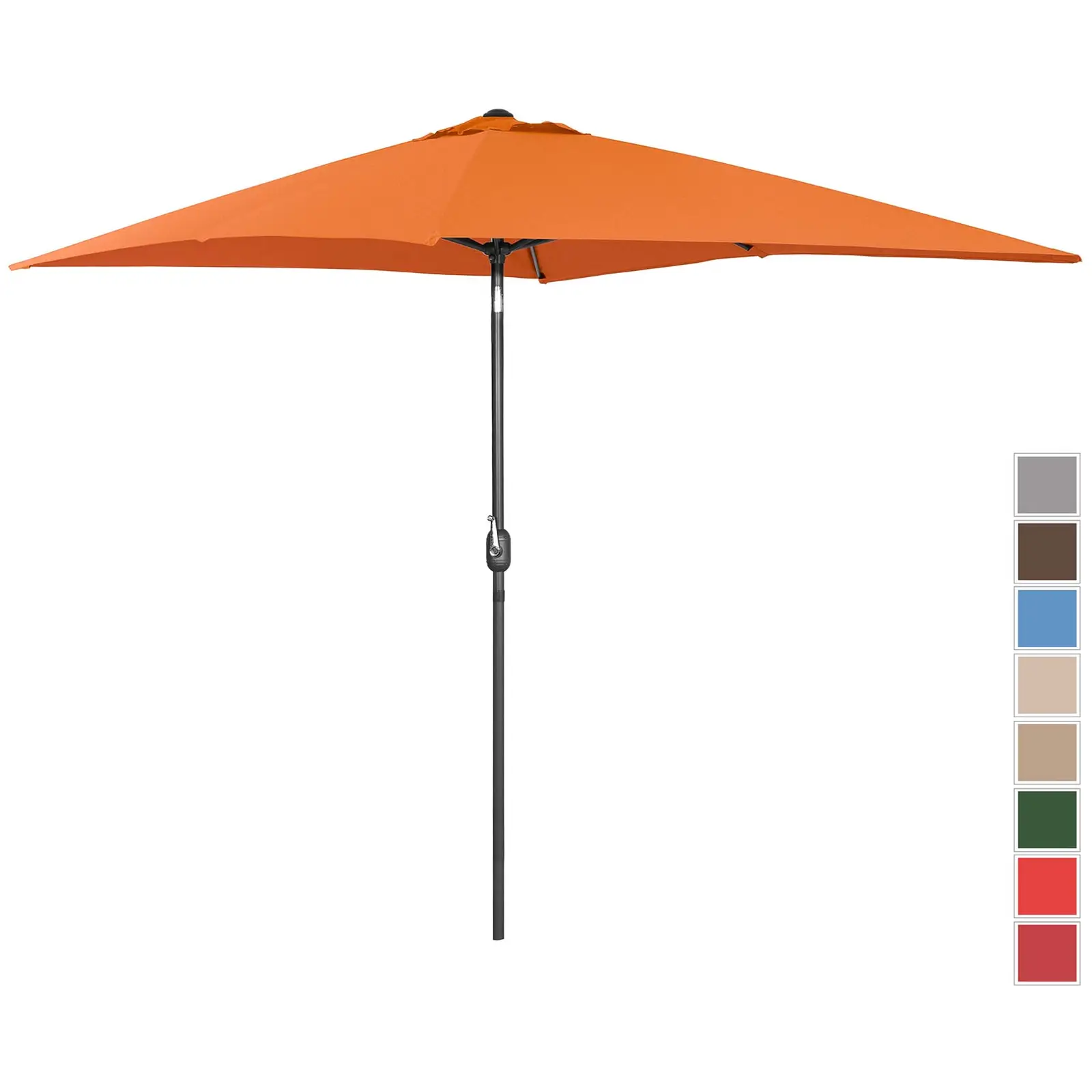 Suuri aurinkovarjo suojaa sinua kuumuudelta ja UV-säteilyltä rentoutuessasi kesällä terassilla tai puutarhassa. Uniprodon ammattilaitevalikoimasta löytyvät puutarhalaitteisiin lukeutuvat aurinkovarjot terassille, puutarhaan tai parvekkeelle vakuuttavat laadukkaalla, modernilla suunnittelullaan ja erityisellä pitkäikäisyydellään. Etsitkö suurta aurinkovarjoa? Suorakulmainen, jänneväliltään 200 x 300 cm oleva oranssi aurinkovarjo luo reilun, auringolta ja kuumuudelta luotettavasti suojaavan varjon. Ajattoman muotoilunsa ansiosta tämä tilava aurinkovarjo on myös houkutteleva katseenvangitsija. Laadukkaat materiaalit ja huolellinen valmistustapa korostavat hienovaraisesti sen vakuuttavaa ulkonäköä! Aurinkovarjo tarjoaa viileän paikan lisäksi myös ennen kaikkea luotettavan suojan haitallisilta auringonsäteiltä. Varjon UV-suojakerroin on UPF 50+, joten se suojaa jopa 98 prosenttisesti kaikelta UV-säteilyltä. Täten voit nauttia vieraidesi kanssa ruuasta ja juomasta turvallisesti ja huoletta. Voit mukauttaa aurinkovarjon nopeasti ja yksilöllisesti mihin tahansa säätilanteeseen vain muutamalla yksinkertaisella toimenpiteellä. Auringon asennosta riippuen voit kallistaa varjoa ja luoda suojaisan paikan tarpeen mukaan. Varjon avaaminen ja sulkeminen käy aivan yhtä helposti käsikammella. Vankalla, tiheydeltään 180 g/m² olevalla polyesterikankaallaan varjo luo varjoisen paikan sinulle ja vieraillesi monen kesän ajan. Materiaalilla on suuri veto- ja repäisylujuus, se on pitkäikäinen, UV-kestävä ja erittäin helppo puhdistaa. Halkaisijaltaan 38 mm oleva aurinkovarjon tanko on valmistettu kevyestä ja murtumattomasta alumiinista ja ruoteet ovat terästä. Tuulensuojausjärjestelmä takaa paremman ilmankierron lisäksi myös vakauden tuulisella säällä. Voit käyttää aurinkovarjoa vapaasti seisovana tai pöytävarjona sen keskitetyn tukitangon ansiosta. Valitse alustaksi aina kiinteä tasainen pinta. Lisää vankkuutta sekä joustavuutta varjon pystytykseen antavat sopivat aurinkovarjon jalat, jotka löydät expondon valikoimasta.