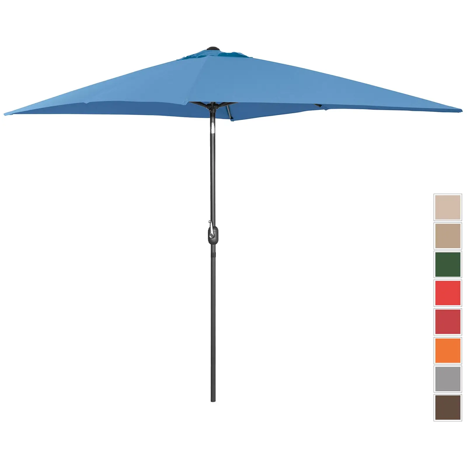 Suuri aurinkovarjo suojaa sinua kuumuudelta ja UV-säteilyltä rentoutuessasi kesällä terassilla tai puutarhassa. Uniprodon ammattilaitevalikoimasta löytyvät puutarhalaitteisiin lukeutuvat aurinkovarjot terassille, puutarhaan tai parvekkeelle vakuuttavat laadukkaalla, modernilla suunnittelullaan ja erityisellä pitkäikäisyydellään. Etsitkö suurta aurinkovarjoa? Suorakulmainen, jänneväliltään 200 x 300 cm oleva sininen aurinkovarjo luo reilun, auringolta ja kuumuudelta luotettavasti suojaavan varjon. Ajattoman muotoilunsa ansiosta tämä tilava aurinkovarjo on myös houkutteleva katseenvangitsija. Laadukkaat materiaalit ja huolellinen valmistustapa korostavat hienovaraisesti sen vakuuttavaa ulkonäköä! Aurinkovarjo tarjoaa viileän paikan lisäksi myös ennen kaikkea luotettavan suojan haitallisilta auringonsäteiltä. Varjon UV-suojakerroin on UPF 50+, joten se suojaa jopa 98 prosenttisesti kaikelta UV-säteilyltä. Täten voit nauttia vieraidesi kanssa ruuasta ja juomasta turvallisesti ja huoletta. Voit mukauttaa aurinkovarjon nopeasti ja yksilöllisesti mihin tahansa säätilanteeseen vain muutamalla yksinkertaisella toimenpiteellä. Auringon asennosta riippuen voit kallistaa varjoa ja luoda suojaisan paikan tarpeen mukaan. Varjon avaaminen ja sulkeminen käy aivan yhtä helposti käsikammella. Vankalla, tiheydeltään 180 g/m² olevalla polyesterikankaallaan varjo luo varjoisen paikan sinulle ja vieraillesi monen kesän ajan. Materiaalilla on suuri veto- ja repäisylujuus, se on pitkäikäinen, UV-kestävä ja erittäin helppo puhdistaa. Halkaisijaltaan 38 mm oleva aurinkovarjon tanko on valmistettu kevyestä ja murtumattomasta alumiinista ja ruoteet ovat terästä. Tuulensuojausjärjestelmä takaa paremman ilmankierron lisäksi myös vakauden tuulisella säällä. Voit käyttää aurinkovarjoa vapaasti seisovana tai pöytävarjona sen keskitetyn tukitangon ansiosta. Valitse alustaksi aina kiinteä tasainen pinta. Lisää vankkuutta sekä joustavuutta varjon pystytykseen antavat sopivat aurinkovarjon jalat, jotka löydät expondon valikoimasta.
