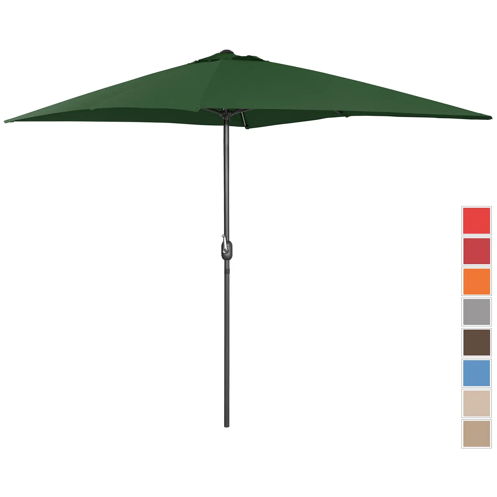Suuri aurinkovarjo suojaa sinua kuumuudelta ja UV-säteilyltä rentoutuessasi kesällä terassilla tai puutarhassa. Uniprodon ammattilaitevalikoimasta löytyvät puutarhalaitteisiin lukeutuvat aurinkovarjot terassille, puutarhaan tai parvekkeelle vakuuttavat laadukkaalla, modernilla suunnittelullaan ja erityisellä pitkäikäisyydellään. Etsitkö suurta aurinkovarjoa? Suorakulmainen, jänneväliltään 200 x 300 cm oleva vihreä aurinkovarjo luo reilun, auringolta ja kuumuudelta luotettavasti suojaavan varjon. Ajattoman muotoilunsa ansiosta tämä tilava aurinkovarjo on myös houkutteleva katseenvangitsija. Laadukkaat materiaalit ja huolellinen valmistustapa korostavat hienovaraisesti sen vakuuttavaa ulkonäköä! Aurinkovarjo tarjoaa viileän paikan lisäksi myös ennen kaikkea luotettavan suojan haitallisilta auringonsäteiltä. Varjon UV-suojakerroin on UPF 50+, joten se suojaa jopa 98 prosenttisesti kaikelta UV-säteilyltä. Täten voit nauttia vieraidesi kanssa ruuasta ja juomasta turvallisesti ja huoletta. Aurinkovarjo on pystytetty nopeasti ja yksilöllisesti vain muutamalla yksinkertaisella toimenpiteellä. Varjon avaaminen ja sulkeminen käy aivan yhtä helposti käsikammella. Vankalla, tiheydeltään 180 g/m² olevalla polyesterikankaallaan varjo luo varjoisen paikan sinulle ja vieraillesi monen kesän ajan. Materiaalilla on suuri veto- ja repäisylujuus, se on pitkäikäinen, UV-kestävä ja erittäin helppo puhdistaa. Halkaisijaltaan 38 mm oleva aurinkovarjon tanko on valmistettu kevyestä ja murtumattomasta alumiinista ja ruoteet ovat terästä. Tuulensuojausjärjestelmä takaa paremman ilmankierron lisäksi myös vakauden tuulisella säällä. Voit käyttää aurinkovarjoa vapaasti seisovana tai pöytävarjona sen keskitetyn tukitangon ansiosta. Valitse alustaksi aina kiinteä tasainen pinta. Lisää vankkuutta sekä joustavuutta varjon pystytykseen antavat sopivat aurinkovarjon jalat, jotka löydät expondon valikoimasta.