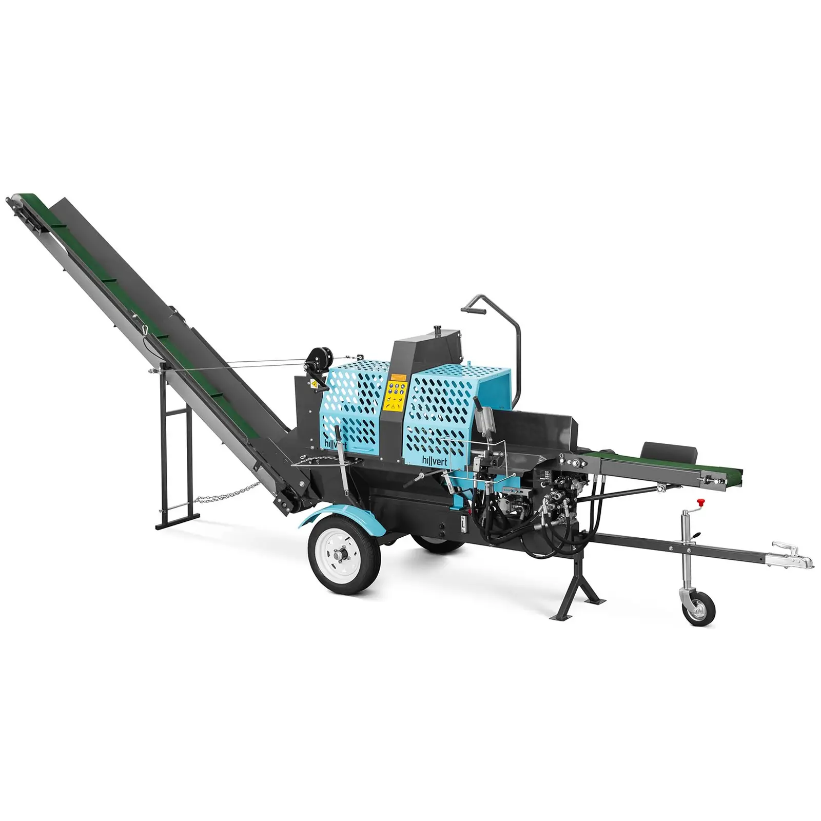 Talvi tulossa ja klapivarasto ammottaa tyhjyyttään? Ei hätää! hillvertin klapiautomaatilla teet polttopuita todella helposti. Tämä 3-in-1-laite sahaa, halkaisee ja kuljettaa pöllit yhdellä kertaa. Sinun tarvitsee vain laittaa halkaistava puu koneeseen, joka tekee kaiken muun puolestasi. Jätä kirves varastoon ja tee polttopuut vauhdilla. Automaattinen polttomoottori-halkomakone sopii erinomaisesti yksityiseen ja maatalouskäyttöön. Polttopuukone on todellinen voimanpesä, jota käyttää tehokas 6700-W-moottori. Olipa kyseessä pehmeä tai kova puu, vaakasuoralla tukinhalkaisulaitteella voit käsitellä puita, joiden halkaisija on enintään 300 mm. Ensimmäisessä vaiheessa kone sahaa pitkät tukit moottorisahalla pienemmiksi, enintään 530 mm:n paloiksi. Puu menee sitten hydrauliseen halkaisulaitteeseen, jossa on 4-osainen terä. 9. 5 t:n halkaisukapasiteetin ansiosta voit pilkkoa minkä tahansa puupalan vaivattomasti. Viimeisessä vaiheessa kuljetinhihna kerää valmiit polttopuut kasaan. Yksi leikkaussykli kestää vain 8 s! Tämän ansiosta klapikoneella voidaan valmistaa jopa 4 m³/h valmiita klapeja tukkien tyypistä ja paksuudesta riippuen. Automaattinen kone tuottaa klapeja, jonka pituus on enintään 530 mm ja halkaisija 50 – 300 mm. Helppoa ja turvallista kuljetusta varten laite on varustettu suurilla kumipyörillä. Jotta koneen käyttö olisi turvallista, suosittelemme että käytät aina asianmukaista suojavaatetusta. Huomautus: Varaosia saatavilla pyynnöstä.