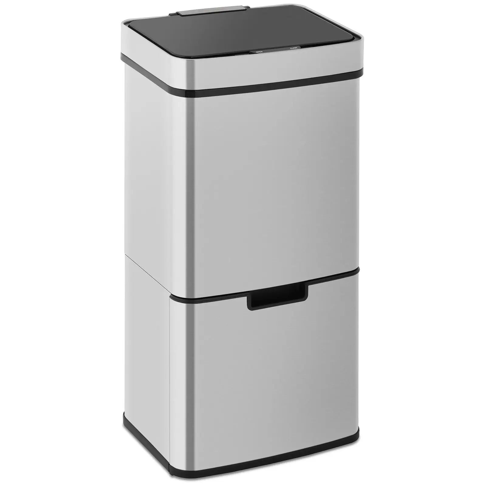 Roskasäiliön tulisi olla ennen kaikkea hygieeninen. Siksi automaattinen roska-astia STAR_ BIN_27 avautuu heti, kun lähestyt sitä ja sulkeutuu myös automaattisesti. Sinun ei tarvitse koskea mihinkään avataksesi kannen. Kätevää ja puhdasta samanaikaisesti. Lisäksi lattiatasolla sijaitsee kaksi muutakin roska-astiaa, joiden avulla voit lajitella jätteet kätevästi. Roskien kerääminen ja lajittelu voi olla niin helppoa! Roska-astian kansi pysyy tiiviisti kiinni sulkien hajut sisälleen, kunnes olet noin 30 cm:n etäisyydellä. Silloin liiketunnistin havaitsee lähestymisesi ja avaa kannen. Sinun ei tarvitse muuta kuin heittää roskat ylimpään astiaan. Kun tunnistin ei enää havaitse mitään liikkeitä, automatiikka odottaa viisi sekuntia ja sulkee kannen uudelleen. Liiketunnistimeen perustuvalla automatiikalla on paljon etuja. Roska-astian kansi on auki vain silloin, kun haluat heittää siihen jotain, loppuajan se pysyy kiinni. Tästä on suurta hyötyä varsinkin, jos astiassa on pilaantuvia elintarvikkeita. Sinun ei tarvitse koskea kantta, joka on tavallisissa roska-astioissa huomattavan likainen. Tämä on tärkeää oman terveytesi kannalta. Ja tietysti on kätevää, kun kansi avautuu automaattisesti. 72 l: n roska-astiassa on yläpuolella yksi automaattinen säiliö ja sen alapuolella kaksi käsikäyttöistä jäteastiaa. Yläastian tilavuus on 47 l ja siihen voidaan ripustaa pidikkeellinen roskapussi. Roska-astia voidaan avata ja sulkea pidempään napin painalluksella, jotta voit ottaa ämpärin sangasta kiinni. Lattiatasolla on ulosvedettävä lokero, jossa on kaksi muovisäiliötä. Molempien yhteenlaskettu tilavuus on 25 l ja ne voidaan irrottaa helposti yhdellä vedolla. Kolmiosaisen rakenteen ansiosta automaattinen roska-astia on ihanteellinen roskien lajitteluun! Vankka kotelo on valmistettu ruostumattomasta teräksestä, joka on erityisen kestävä päivittäisessä käytössä. Tunnistimen voi kytkeä päälle ja pois päältä suojatussa paikassa olevasta katkaisimesta. Kannen automatiikan käyttövoima tulee kuudelta AA-paristolta (eivät kuulu toimitukseen), joten et tarvitse ulkoista virranlähdettä.