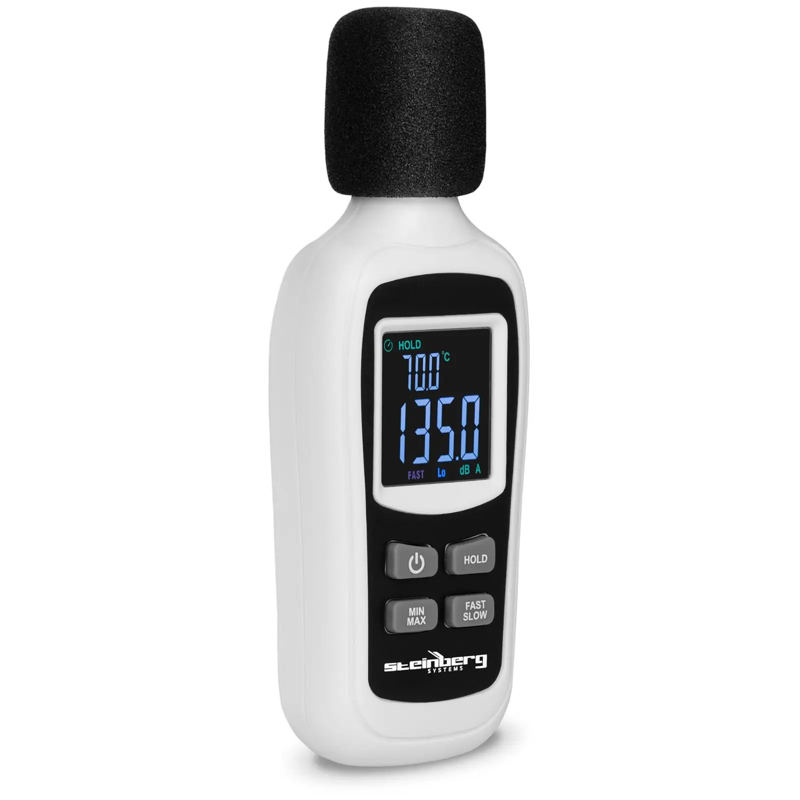 Jokainen reagoi meluun eri tavalla. Desibelimittarilla voit määrittää tarkasti, kuinka meluisaa toimistossa, korjaamolla tai kadulla on. Db-mittari mittaa yhtä luotettavasti niin ihmisten kuin myös koneiden aiheuttaman melun. Äänenvoimakkuusmittarilla mittaat 35 – 135 dB alueella luotettavasti eri lähteistä aiheutuneen melun tarkasti. Jopa suuret äänenvaihtelut on mitattavissa 50 dB dynaamisella alueella tarkasti. Db-mittari vakuuttaa ± 2 dB mittaustarkkuudellaan. Näin ollen mitattujen arvojen tarkka luokittelu on mahdollista, olipa kyseessä sitten katumelu tai koneiden aiheuttamat äänet. Desibelimittari käsittää 31,5 Hz – 8 kHz taajuusalueen, joten se mittaa myös taajuuksia, joita ihmiskorva ei herkimmillään pysty aistimaan. Taajuusalue on valittavissa optimaallisten mittaustulosten saavuttamiseksi. Taajuusalue A on optimaalinen ympäristöäänien, kuten esimerkiksi toimistoäänien mittaamiseen. Toiminnoilla „Fast“ (nopea) ja „Slow“ (hidas) voit mitata tarkemmin myös liikkuvia tai yksittäisiä äänilähteitä. Fast-tilassa laite mittaa 125 millisekunnin nopeudella ja määrittää täten myös nopeat melunvaihtelut toisin kuin Slow-tila, jolla voit tehdä mittauksia sekunnin nopeudella ja mitata täten jatkuvaa melua. Äänenvoimakkuuden mittaamisen ohella laitteella voi määrittää myös lämpötilan -20…+70 °C alueella. Tarvittaessa lämpötilayksikkö voidaan vaihtaa Celsiuksesta Fahrenheitiksi. Kaikki asetukset on helposti valittavissa muutamalla näppäimellä. Kaikki mitatut tiedot on tarkastettavissa suoraan LCD-näytöltä yhden desimaalin tarkkuudella. Taustavalaistus takaa optimaalisen näkyvyyden myös hämärässä. Desibelimittari toimii kolmella 1,5 V Micro AAA paristolla ja sen enimmäiskäyttöaika on 60 tuntia täyteen ladatulla paristolla. Optimaalisten tulosten määrittämiseksi mikrofoni on varustettu tuulisuojalla.