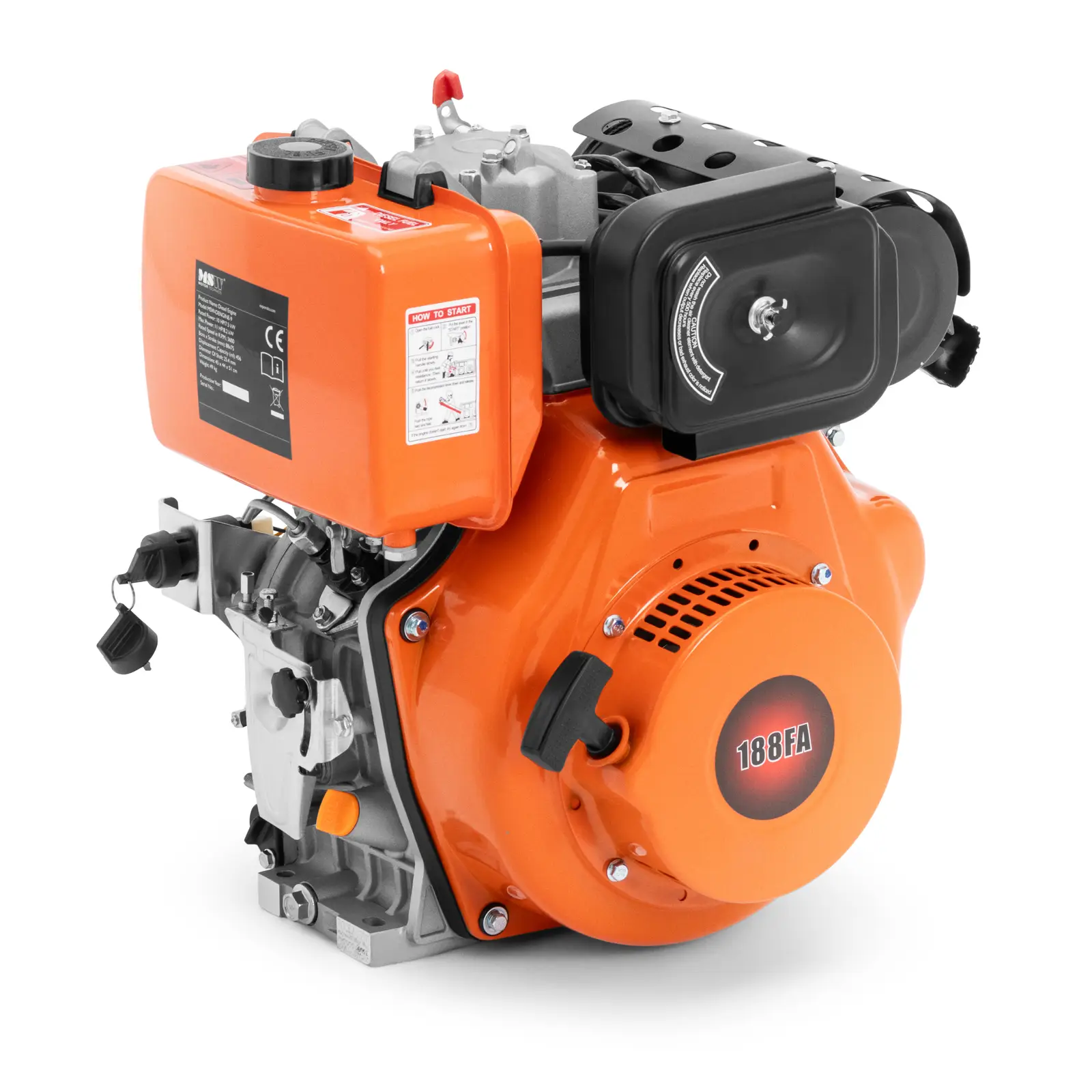 Tehokas 11 hv:n dieselmoottori sopii monenlaisiin käyttötarkoituksiin. Se soveltuu sekä vakio- että vaihtomoottoriksi erilaisissa laitteissa, kuten vesipumpuissa, tärylätkissä, ruohonleikkureissa, lakaisukoneissa tai lumilingoissa. Aivan yhtä hyvin voit kuitenkin käyttää sitä myös traktoreissa, ilmatyynyaluksissa ja sähkögeneraattoreissa. Jälkiasennetun sylinterimäisen äänenvaimentimen ansiosta tämä dieselmoottori on huomattavasti hiljaisempi kuin muut vastaavat mallit. Ilmajäähdytetty yksisylinterinen nelitahtimoottori tarjoaa käyttöösi vaikuttavaa suorituskykyä: 456 cm3:n iskutilavuuden ja 8,2 kW:n maksimitehon (3600 r/min) ansiosta tämä paikallismoottori täyttää korkeimmatkin vaatimukset. Tehokkaasta suorituskyvystään huolimatta dieselmoottori on erittäin taloudellinen, mikä on hyvä uutinen lompakollesi. Moottorin käynnistys on nopeaa vetonarun avulla. Jos arvostat kestävyyttä ja turvallisuutta, tämä dieselmoottori on juuri oikea valinta sinulle. Kestävät materiaalit, siisti viimeistely ja teräksinen nokka-akseli takaavat, että moottori kestää luotettavasti lukuisat intensiiviset käyttökerrat. Tehokas ilmajäähdytys myös suojaa moottoria ylikuumenemiselta. Kaksivaiheinen suodatinjärjestelmä puolestaan varmistaa, että moottoriin pääsee vain puhdasta ilmaa. Öljykylpyilmansuodatin sopii erityisesti koneisiin, joita huolletaan epäsäännöllisesti.