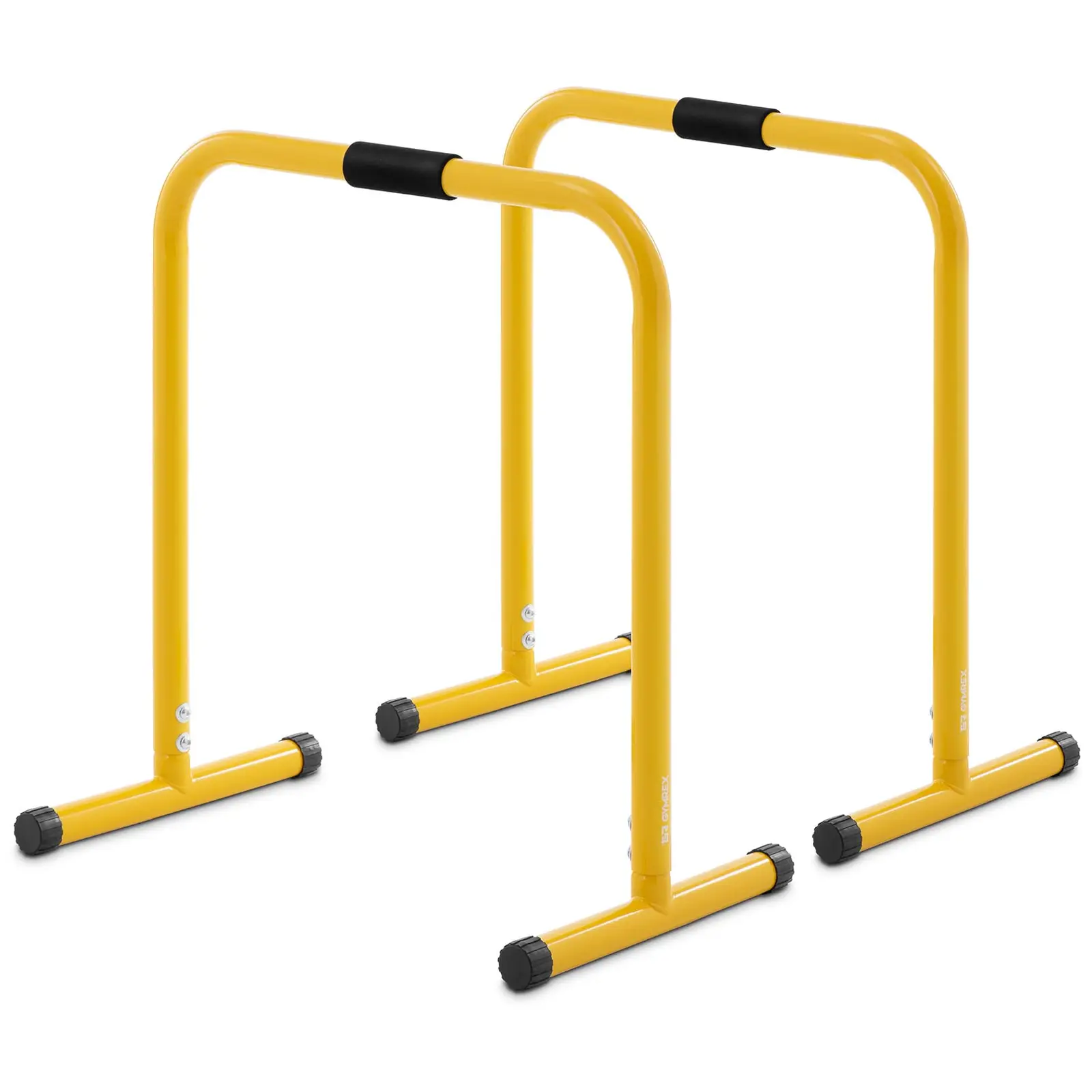 Dippiteline on monikäyttöinen laite kaikkien ylävartalon lihasten treenaamiseen. Kaksi kädensijaa tekevät dippitelineestä täydellisen työntö-, veto- ja vatsalihasharjoituksiin. Onpa kyse pienistä tiloista tai kotikuntosalista: monipuolisella dippitelineellä voidaan vahvistaa tehokkaasti ja hellävaraisesti selkää, rintakehää, hartioita, vatsaa, kolmipäisiä hartialihaksia ja hauista. Dippipenkki mahdollistaa uskomattoman monia painoharjoituksia, joilla saat nopeasti tuloksia. Sopii sekä aloittelijoille että kokeneille urheilijoille. Lihasvoiman lisäksi voit treenata myös kestävyyttä, koordinaatiota, ryhtiä ja tasapainoaistia. Kahden pehmustetun kädensijan ansiosta teline soveltuu erinomaisesti paitsi leuanvetoihin myös dippeihin tai jalannostoharjoituksiin monin eri variaatioin. Samalla tuetaan harjoitusten oikeaa suorittamista ja estetään väärät liikkeet. Kahvoissa on liukumaton päällyste, joten otteesi pitää luotettavasti intensiivisissäkin harjoituksissa. Dippiteline kestää jopa 100 kg:n kuormituksen. Tämä on laitteen vankan rakenteen ja materiaalina käytetyn korkealaatuisen teräksen (Q235) ansiota. Materiaali on lisäksi erittäin hygieenistä ja helposti puhdistettavaa. Toimitus sisältää asennusmateriaalin ja yksityiskohtaiset asennusohjeet, joiden avulla telineen kokoaminen käy nopeasti ja näin pääset aloittamaan ylävartalon treenaamisen saman tien. Punnerrustangot voidaan purettuina säilyttää kätevästi pienessäkin tilassa niiden kompaktin rakenteen ansiosta.