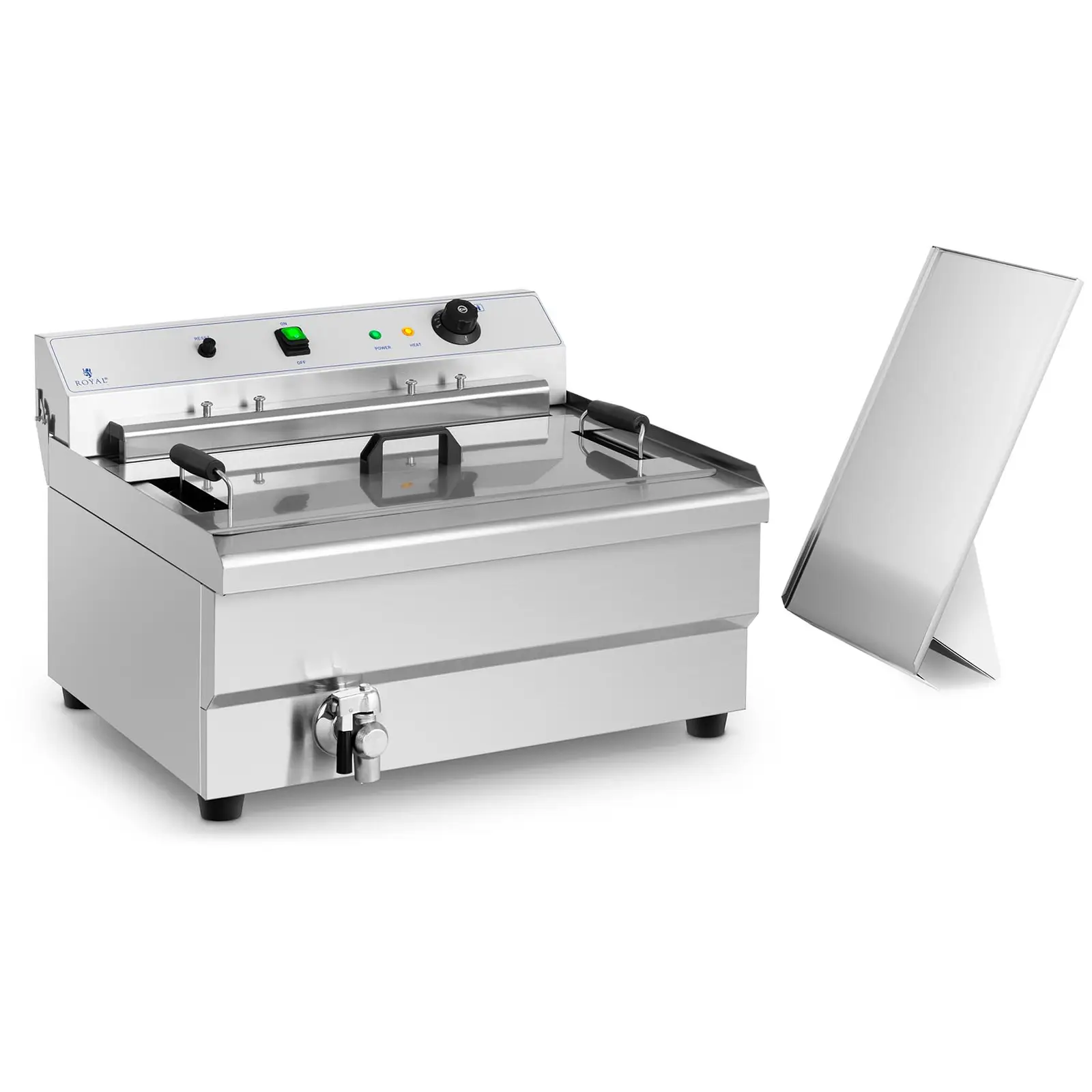 Royal Cateringin friteerauskeitin RCBG-30STHB kehitettiin sopivaksi ammattimaiseen ja jatkuvaan käyttöön leipomoissa, ravintoloissa, supermarketeissa, välipalabaareissa tai ruokarekoissa. 9 000 watin teholla ja 30 litran keittotilalla piispanmunkkien, donitsien ja hillomunkkien lisäksi keitin sopii täydellisesti myös ranskalaisten, kalan tai sipulirenkaiden paistamiseen suurissa määrin. Keitin sisältää käteviä lisäosia, kuten sivussa olevan valutustason, poistohanan sekä kylmävyöhyketekniikan, joten tämä ruostumattomasta teräksestä valmistettu laite on huomattavasti mukavampi käyttää kuin monet muut vastaavat friteerauskeittimet. Ravintolalaitteiden verkkokauppiaasi Royal Catering tarjoaa tälläkin tuotteella älykästä toiminnallisuutta, helppokäyttöisyyttä ja vaivatonta huoltoa sekä käytännöllistä muotoilua. Friteerauskeitin tarjoaa 30 litran keittotilallaan ja 25 litran enimmäisöljymäärällään mahdollisuuden friteerata suuria määriä kerrallaan ajan säästämiseksi. Ammattimaisessa käytössä keitin on käytettävissä monipuolisesti ja se soveltuu makeiden leivonnaisten paistamisen ohella myös ranskalaisten, paneroidun lihan ja kalan tai vihannesten valmistukseen. Irrotettavan 9 000 watin lämpövastuksen hyvän tehon ansiosta keitin saavuttaa 200 °C maksimilämpötilansa nopeasti. Laadukas ja erittäin tarkka termostaatti pitää öljysäiliön lämpötilan tasaisena – rapeiden paistotulosten lisäksi myös sähköä säästyy. Friteerauskori on ripustettavissa sille tarkoitettujen koukkujen varaan, jolloin ylimääräinen rasva voidaan valuttaa ja valmiiksi friteeratut ruuat jäähdyttää korissa kätevästi. Käytännöllisten lisäosien kanssa keitin on ihanteellinen täydellisesti sujuvaan paistamiseen ammattilaiskeittiöissä ja leipomoissa. Sivulla sijaitseva kätevä valutustaso on kätevä säilytyspaikka valmiille friteeratuille ruuille ja mahdollistaa samalla ylimääräisen rasvan valumisen takaisin öljysäiliöön. Lämpövyöhyke ehkäisee putoavien paistojämien palamisen ja takaa sen, että öljyn maku säilyy pidempään muuttumattomana ja valmistettavien ruokien maku tuoreena. Lisäksi mukana toimitettava kansi suojaa öljyä likaantumiselta ja pidentää sen käyttöikää. Friteerauskeittimen kuori on valmistettu hyvälaatuisesta ruostumattomasta teräksestä, joten se on lujatekoisuutensa ja korroosionkestävyytensä lisäksi myös erittäin helppo puhdistaa. Puhdistuksen entisestäänkin helpommaksi tekee irrotettava lämpövastus, joten säiliön kaikki pinnat ovat tavoitettavissa vaivattomasti. Vanha öljy voidaan poistaa säiliöstä kätevästi ja nopeasti poistohanan kautta. Laitteessa on monta eri turvatoimintoa, jotka takaavat mahdollisimman turvallisen työskentelyn. Niihin lukeutuu sulake, joka ehkäisee ylikuumenemisen, kumitassut, jotka takaavat varman pidon sekä mitoiltaan 247 x 451 x 149 mm olevan friteerauskorin lämpöeristetty kahva.