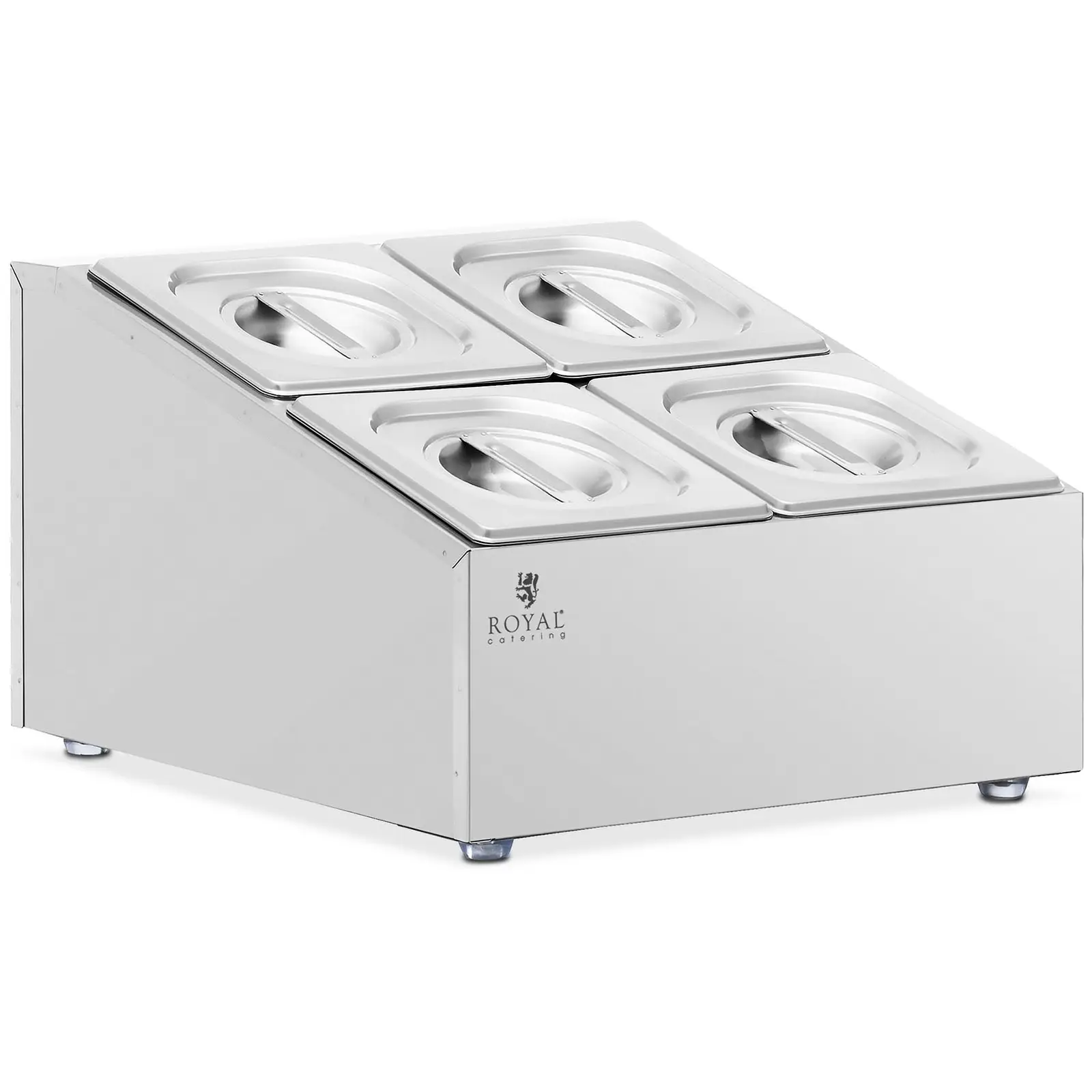 Mausteet, hedelmät, täytteet tai pizzan lisukkeet – Säilytä ja tarjoile kaikenlaisia raaka-aineita ammattimaisesti Royal Cateringin modernissa GN-telineessä. Teline toimitetaan täydellisenä settinä, johon kuuluvat myös astiat ja sopivat kannet. Tämä tekee siitä ihanteellisen keittiövälineen ravintoloihin, pikaruokaloihin, baareihin, pitopalveluihin tai festivaalikojuihin ja ruokarekkoihin. Säilytä jopa 7,6 litraa ainesosia ja ruokaa erillään toisistaan korkealaatuisessa ruostumattomasta teräksestä valmistetussa telineessä. GN-telineen yksittäiset osat ovat irrotettavia ja helposti täytettäviä. Lisäksi ne ovat helposti kuljetettavia ja konepesunkestäviä – ihanteellisia ravintola-alan tiukkoihin hygieniavaatimuksiin. Jokaiseen astiaan mahtuu 1,9 l. Neljä luistamatonta kumijalkaa varmistavat liukumattoman jalustan ilman naarmuja.