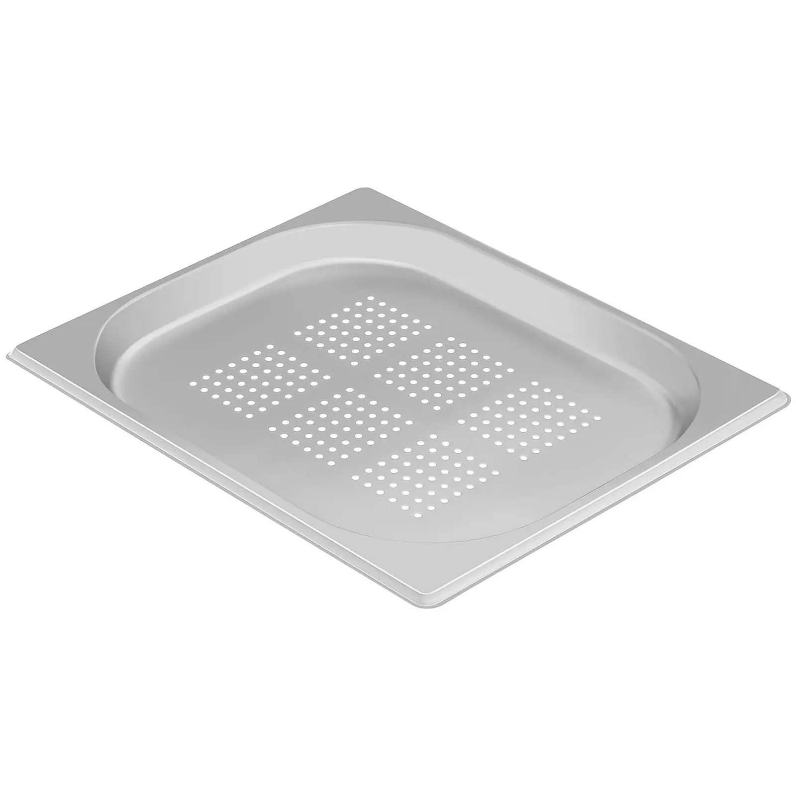 Royal Cateringin rei’itetty Gastronorm (GN) 1/2 -astia RCGN-P1/2X20 on suunniteltu ammattimaiseen gastronomiseen käyttöön ja soveltuu ravintoloihin, ruokaloihin, herkkukojuihin, salaattibaareihin, kahviloihin, pizzerioihin, hotelleihin yms. Tässä GN-vuoassa ruoka säilyy pitkään lämpimänä lämpöhauteessa tai tuoreena ja viileänä kylmävitriinissä. Tämä GN 1/2-astia on tukeva, säilyttää muotonsa ja ei naarmuunnu. Näin se täyttää loistavasti gastronomisen käytön asettamat korkeat vaatimukset ja vakuuttaa samalla monipuolisuudellaan: se käy lämpimänä ja kylmänä säilytykseen ja jopa pakastamiseen. Se on 20 mm syvä ja sen tilavuus on 1,3 litraa. Rei’itetty GN-astia vakuuttaa monipuolisuudellaan: voit valuttaa siinä liian nesteen pois vaikkapa lihasta tai käyttää sitä suoraan vihannesten kypsentämiseen. Se sopii myös loistavasti kalan tai äyriäisten tarjoiluun jääpedillä. Sulavasta vedestä syntyvä vesi voi valua rei’itetyn vuoan alle asetettuun GN-astiaan. GN-vuoassa on kookkaat kulmat ja käytännöllinen reunus. Sitä voi käyttää yhdessä kaikkien yleisesti myynnissä olevien GN 1/2-kansien kanssa. Sen litteiden reunojen ansiosta sen voi myös sijoittaa lämpöhauteeseen tai kylmävitriiniin ja ottaa sieltä taas pois puhdistusta tai täyttämistä varten. Reunukset estävät myös vesihauteesta muodostuvien höyryjen karkaamista astian laitojen kautta. Näin ollen se säilyttää lämmön paremmin kuin vastaavat astiat, joissa on kaarevat reunat. Reunojen profiili ja pohjan pyöristetyt kulmat tekevät näiden GN 1/2- vuokien pinoamisen mahdolliseksi. Niiden ei tarvitse olla yhtä syviä. Pinotut vuoat eivät takerru kiinni toisiinsa. GN 1/2-astia on valmistettu laadukkaasta haju- ja makuneutraalista ruostumattomasta teräksestä, mikä tekee siitä hyvin kestävän ja pitkäikäisen. Se sopii optimaalisesti lämpötiloille välillä -20 ja 300 °C. Vuoka ei millään tavalla muuta muotoaan tai väänny, vaikka siirtäisit sen suoraan pakastimesta kuumaan uuniin ja sieltä tarjolle. Aika on rahaa: GN-vuoan RCGN-P1/2X20 materiaali ja pyöristetyt alanurkat tekevät