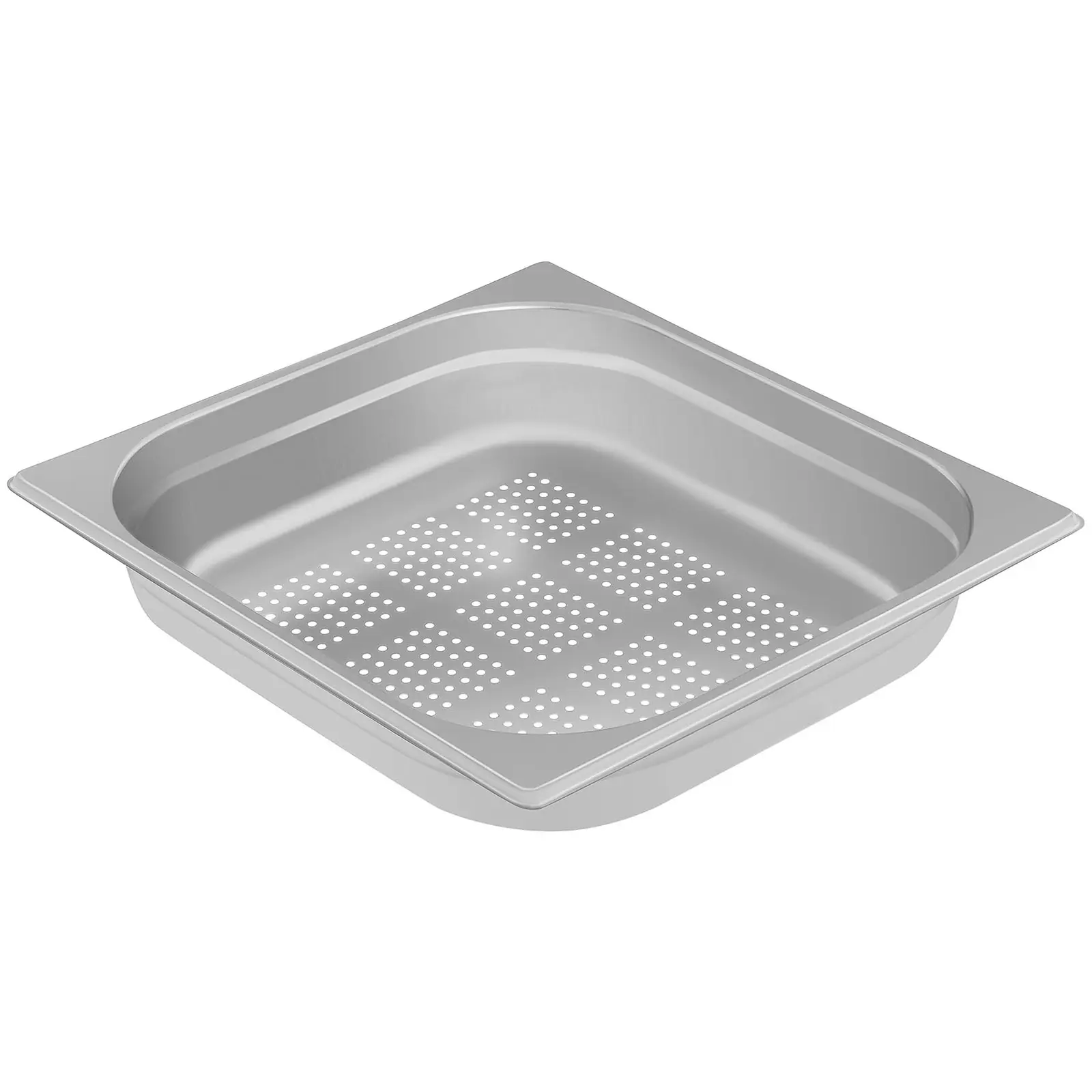 Royal Cateringin rei’itetty Gastronorm (GN) 2/3 -astia RCGN-P2/3X65 on suunniteltu ammattimaiseen gastronomiseen käyttöön ja soveltuu ravintoloihin, ruokaloihin, herkkukojuihin, salaattibaareihin, kahviloihin, pizzerioihin, hotelleihin yms. Tässä GN-vuoassa ruoka säilyy pitkään lämpimänä lämpöhauteessa tai tuoreena ja viileänä kylmävitriinissä. Tämä GN 2/3-astia on tukeva, säilyttää muotonsa ja ei naarmuunnu. Näin se täyttää loistavasti gastronomisen käytön asettamat korkeat vaatimukset ja vakuuttaa samalla monipuolisuudellaan: se käy lämpimänä ja kylmänä säilytykseen ja jopa pakastamiseen. Se on 65 mm syvä ja sen tilavuus on 5,5 litraa. Rei’itetty GN-astia vakuuttaa monipuolisuudellaan: voit valuttaa siinä liian nesteen pois vaikkapa lihasta tai käyttää sitä suoraan vihannesten kypsentämiseen. Se sopii myös loistavasti kalan tai äyriäisten tarjoiluun jääpedillä. Sulavasta vedestä syntyvä vesi voi valua rei’itetyn vuoan alle asetettuun GN-astiaan. GN-vuoassa on kookkaat kulmat ja käytännöllinen reunus. Sitä voi käyttää yhdessä kaikkien yleisesti myynnissä olevien GN 2/3-kansien kanssa. Sen litteiden reunojen ansiosta sen voi myös sijoittaa lämpöhauteeseen tai kylmävitriiniin ja ottaa sieltä taas pois puhdistusta tai täyttämistä varten. Reunukset estävät myös vesihauteesta muodostuvien höyryjen karkaamista astian laitojen kautta. Näin ollen se säilyttää lämmön paremmin kuin vastaavat astiat, joissa on kaarevat reunat. Reunojen profiili ja pohjan pyöristetyt kulmat tekevät näiden GN 2/3- vuokien pinoamisen mahdolliseksi. Niiden ei tarvitse olla yhtä syviä. Pinotut vuoat eivät takerru kiinni toisiinsa. GN 2/3-astia on valmistettu laadukkaasta haju- ja makuneutraalista ruostumattomasta teräksestä, mikä tekee siitä hyvin kestävän ja pitkäikäisen. Se sopii optimaalisesti lämpötiloille välillä -20 ja 300 °C. Vuoka ei millään tavalla muuta muotoaan tai väänny, vaikka siirtäisit sen suoraan pakastimesta kuumaan uuniin ja sieltä tarjolle. Aika on rahaa: GN-vuoan RCGN-P2/3X65 materiaali ja pyöristetyt alanurkat tekevät sen perusteellisesta puhdistamisesta helppoa ja nopeaa, mikä taas tekee astian turvalliseksi. Tämä keittiöväline on myös konepesunkestävä.