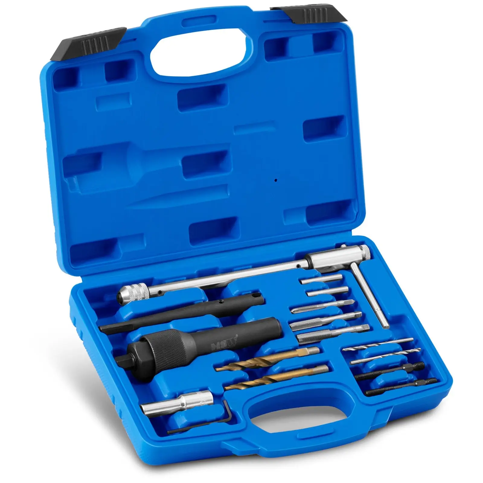MSW-GPR-01 MSW:n ammattilaitteisiin kuuluva hehkutulpan kierteen korjaussarja on erityinen setti hehkutulppien turvalliseen irrottamiseen ja kierteiden ammattimaiseen korjaamiseen ilman, että sylinterikantta on vaihdettava. Lukuisten työkalujensa ansiosta tämä sarja sopii useimpien moottoriajoneuvojen hehkutulppiin ja on erityisen hyödyllinen kaupallisissa korjaamoissa. Mutta jopa itseoppineet nikkarit voivat käyttää tätä 16-osaista työkalusarjaa vaurioituneiden tai rikkinäisten hehkutulppien turvalliseen purkamiseen ja kokoamiseen. Hehkutulppien korjaussarjan laajaan toimituksen sisältöön kuuluu muun muassa kaksi vaiheporaa repeytyneiden hehkutulppien poraamiseksi ja kolme kierreleikkuria hehkutulpan kierteen katkaisemiseksi. Lisäksi muut adapterit, keskitys- ja kierteytystyökalut takaavat yksinkertaisen, nopean ja mutkattoman menettelyn hehkutulppien vaihdossa. Kaikki hehkutulpan poraustyökalun osat on valmistettu pitkäikäisestä teräksestä ja ne takaavat siten hyvän kestävyyden jopa suuressa voimankäytössä. Saat käytännöllisen, mukavan kantokahvan sisältävän sarjan eri työkaluille tarkoitetun muovisalkun, jossa kaikilla työkalun osilla on kiinteä paikkansa. Tällä tavoin eri välineet voidaan laittaa turvallisesti takaisin salkkuun käytön jälkeen ja pitää työpaja siistinä. Ammattimainen kierteen työkalusarja takaa turvallisen irrotuksen ja asennuksen. Hehkutulppa tai sylinterikansi voivat vaurioitua nopeasti, jos erikoistyökaluja ei käytetä, mikä aiheuttaa loukkaantumisvaara käyttäjälle. Valitse turvallisin tapa MSW:n hehkutulpan kierteen korjaussarjalla.