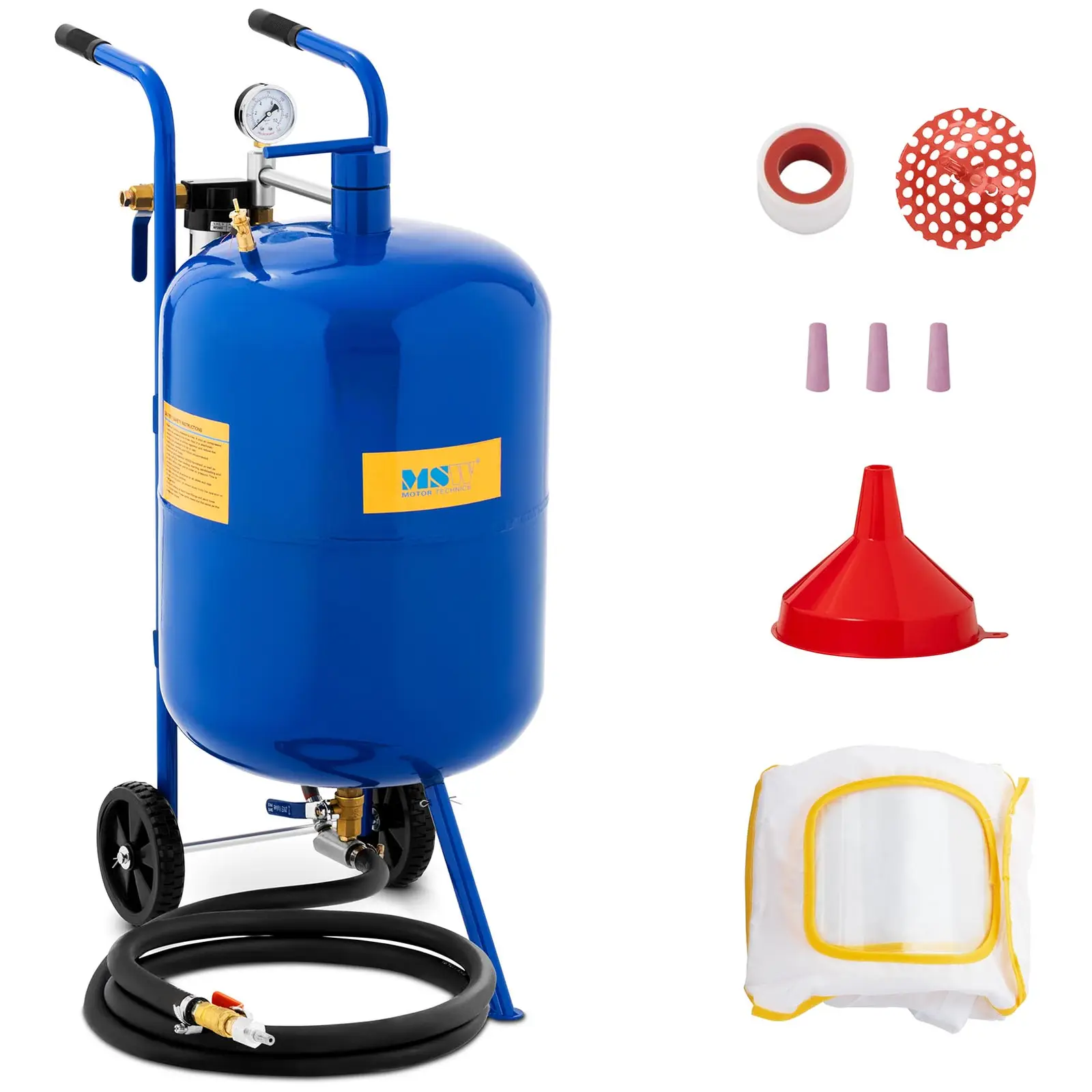 MSW:n hiekkapuhalluslaite MSW-MS76A on tehokas työkalu nopeaan pintojen käsittelyyn, kuten ruosteen, vanhojen maalikerrosten ja pinttyneen lian poistoon. Se sopii sekä kotinikkareille että puoliammattimaisille harrastajille. Hiekkapuhalluslaitteen säiliöön mahtuu 76 l puhallushiekkaa, joten et joudu vähän väliä keskeyttämään työtäsi jälkitäyttämisen vuoksi. Laite sopii loistavasti metallille, lasille, tiilille, muoville tai puulle – esimerkiksi vanhojen huonekalujen entisöintiin. Hiekkapuhalluslaite tuottaa jopa 9 baarin käyttöpaineen, jolla se suoriutuu kaikista puhdistushaasteista nopeasti ja perusteellisesti. Sen puhallusvoima on jopa 30 prosenttia vastaavien laitteiden voimaa suurempi. Hiekkapuhalluslaite sopii loistavasti erityisen intensiiviseen pintojen käsittelyyn. Hiekkapuhalluslaitteen voimakkaan tehon täydentää sen käytännöllinen varustus, joka täyttää korkeimmatkin vaatimukset. Siinä on analoginen painemittari, jonka avulla ilmanpainetta on helppo säädellä. Laitteessa on myös vedenerotin, joka estää veden tai öljyn kerääntymisen paineilmajärjestelmään ja pidentää huomattavasti laitteen käyttöikää. Laitteen liikuteltavuuden ja helpon käsiteltävyyden takaa sen raskaaseen käyttöön suunniteltu 250 cm pitkä sulkuventtiilillä varustettu letku. Lisäksi se kulkee näppärästi kumirulliensa varassa. Ne ovat hiljaiset ja liikkuvat tasaisesti estäen samalla lattian naarmuuntumisen ja tärinän. Hiekkapuhalluslaitteessa on kaksi pitkää ergonomisesti muotoiltua kahvaa, joista sitä on helppo ohjailla. Lisäksi siinä on vankat tukijalat, joiden päälle laskettuna se seisoo tukevasti paikoillaan. Kaikki nämä ominaisuudet tekevät siitä ihanteellisen laitteen kookkaiden ja hankalasti liikuteltavien kohteiden työstöön. Hiekkapuhalluslaite MSW-MS76A on valmistettu jauhepinnoitetusta teräksestä, jonka pitkäikäisyys tekee laitteesta kannattavan investoinnin, joka maksaa itsensä takaisin monien käyttövuosiensa ansoista. Turvallisuus on alusta asti tärkeä tekijä: Laitteen tehoa säädetään ilmansäätimellä ja siinä on ylipaineelta suojaava varoventtiili. Toimitus sisältää suppilon puhallushiekan siistiin ja hävikittömään täyttöön, pellavaisen kasvosuojan, rullan teflonnauhaa ja neljä erikokoista suutinta, joten voit heti ryhtyä töihin saatuasi laitteen.