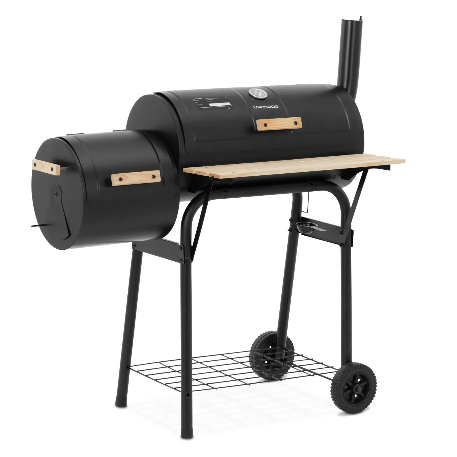 Pidätkö mehukkaista pihveistä, savustetuista grillivihanneksista ja tuoreesta valkosipulipatongista? Siinä tapauksessa Royal Cateringin savustusgrilli on kuin tehty sinua varten! Hiiligrillin avulla voit järjestää unohtumattomia grilli-iltoja sekä valmistaa maukkaita ja herkullisia ruokia. Piditpä sitten perinteisen hiiligrillin aromeista tai savun mausta, kahden suljettavan kammion ansiosta voit kypsentää monenlaiset ruoat juuri oikein. Yksinkertainen käyttö ja monet kätevät toiminnot tekevät tästä mallista ihanteellisen grilliratkaisun kotipihaan. Aivan yhtä hyvin se kuitenkin sopii käytettäväksi retkellä, piknikillä, festareilla ja muissa vastaavissa ulkoilmatapahtumissa. Korkea savupiippu varmistaa turvallisuuden ja tehokkaan savunpoiston. Se ohjaa savun grillikammiosta putken kautta sivulle ja estää sitä kulkeutumasta ihmisiin päin. Näin sinä ja vieraasi voitte grillata ilman jatkuvaa savua silmissä. Samalla voit nauttia grillattavan ruoan aromikkaista tuoksuista. Grillissä on kehittynyt ilmanohjausjärjestelmä, jonka avulla voit säätää grillauslämpötilaa. Lisäksi savustimen kannessa on lämpömittari, jonka avulla voit kätevästi seurata sen kulloistakin lämpötilaa. Jos grillaat usein, monipuoliset välineet ovat kaiken A ja O. Grillin etuosassa onkin puinen säilytystaso, johon voit asettaa kaikki tarvitsemasi apuvälineet. Olipa kyse grillipihdeistä, alumiinifoliosta, astioista tai herkullisista grillivartaista, taso tarjoaa riittävästi tilaa kaikille tärkeille välineille. Lisäksi sen vaalea puurakenne antaa grillin ulkonäölle viimeisen silauksen. Grillin alaosassa on myös tilava ritilä hiilten, sytykkeiden ja vastaavien tarvikkeiden säilytystä varten. BBQ-grillin tulipesissä on lisäksi suuret ovet, jotka voit avata ja sulkea kauniisti muotoilluilla puukahvoilla. Näin pääset helposti käsiksi grilliritilöihin, ja asetat grillattavat ruoat kuumien hiilten päälle. Vaihtoehtoisesti voit myös sulkea ovet, jolloin herkulliset savuaromit pysyvät grillin sisällä ja tarttuvat ruokiin. Grilli-savustin-yhdistelmä on todella helppo puhdistaa. Voit poistaa tuhkat kätevästi sen sivuilla sijaitsevien suurten ovien kautta. Lisäksi se on valmistettu kestävästä raudasta. Materiaali on helppo puhdistaa ja takaa grillin vakauden. Tämä BBQ-grilli sopii käytettäväksi kaikkina vuodenaikoina. Jos kuitenkin haluat varastoida sen talven ajaksi, kaksi suurta pyörää auttaa sinua kuljettamaan sen mukavasti haluttuun säilytyspaikkaan.
