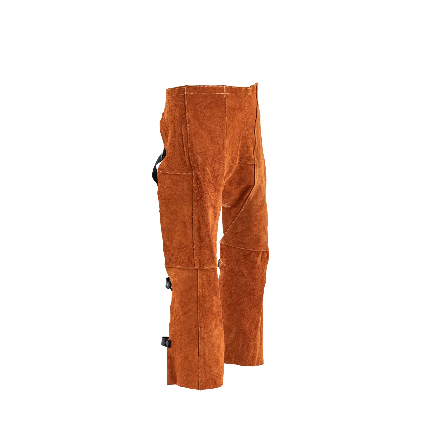 Laadukkainkaan hitsaustakki tai -esiliina ei suojaa jalkojasi hitsauksen yhteydessä. Tähän tarkoitukseen voit kuitenkin käyttää näitä hitsaajan housunsuojia, jotka on valmistettu hyväksi havaitusta lehmän haljasnahasta. Niiden ja muiden valikoimamme hitsausvaatteiden avulla suojaat itsesi tehokkaasti hitsaustöitä tehdessäsi. L-koon hitsaajan housunsuojien leveys on 67,5 cm ja pituus 95 cm. Käyttämällä näitä hitsaajan housunsuojia, voit luottaa korkealaatuiseen ammattitaitoon, joka vastaa hitsauksen päivittäisiin haasteisiin. Tukeva ja laadukkaasti muotoiltu lehmänhaljasnahka on viimeistelty kuumuuden- ja palonkestävillä saumoilla. Suojavaatteet suojaavat luotettavasti jalkojasi tai tarkemmin sanottuna housujasi lantiosta nilkkoihin. Käytännöllisten pikakiinnikkeiden ansiosta voit pukea hitsaajan housusuojat päällesi käden käänteessä ja aloittaa työskentelyn välittömästi. Avoin muotoilu, jossa vain etuosa on peitetty, estää epämiellyttävän lämmön muodostumisen työskentelyn aikana.
