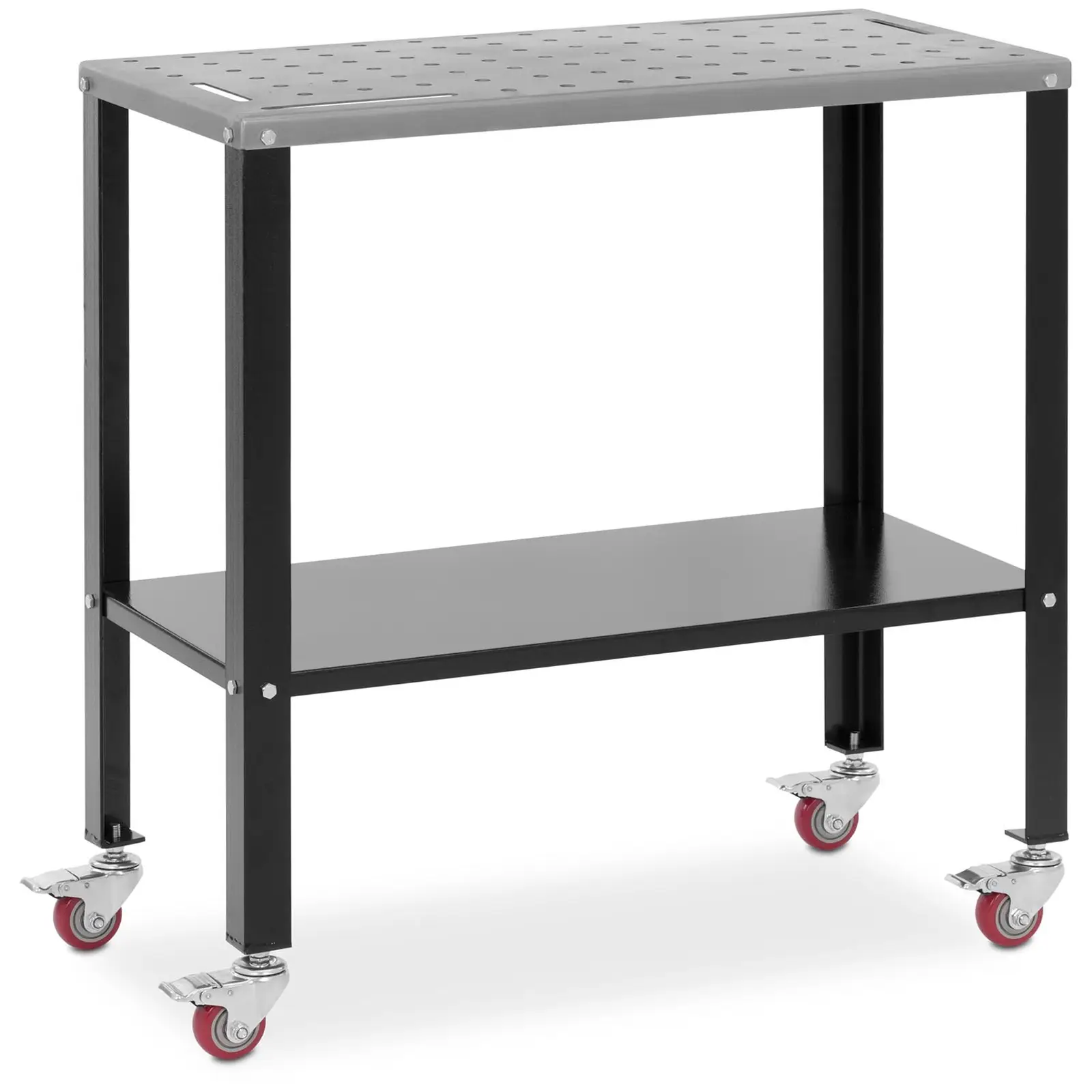 Vaaditko hitsaustöissä korkeaa suorituskykyä ja tarkkoja tuloksia? Aseta sitten hitsattavat kappaleet täydelliselle korkeudelle Stamos Welding Groupin hitsauspöydällä. Raskas työpöytä hitsaukseen kantaa raskaatkin metallikappaleet turvallisesti. Työtasolla on runsaasti tilaa kaikenlaisten kappaleiden kohdistamiseen. Tarvittaessa voit asettaa myös itse hitsauslaitteen sen päälle. Neljällä erittäin tukevalla jalalla seisova teräksestä valmistettu jigipöytä kestää ongelmitta jopa 544 kg:n kuormituksen. Pöydän alla on hylly, jossa voit pitää lisävarusteita, kuten puristimia tai työkaluja helposti saatavilla. Kestävästä hiiliteräksestä valmistettu järeä hitsauspöytä ei heilu tai tärise edes täydellä teholla hitsattaessa tai työkappaletta siirrettäessä. Pöytä tarjoaakin luotettavan alustan kaikenlaiseen hitsaustyöhön. Käytä pöytälevyn reikiä kiinnittääksesi ja kohdistaaksesi työkappaleet tarkasti puristimia käyttäen. Vaihtoehtoisesti voit käyttää hitsausmagneetteja metalliosien kiinnittämiseen. Myös magneetit kiinnittyvät pöytälevyyn kätevästi. 91,3 x 46 cm:n kokoinen hitsaustaso on riittävän suuri myös kookkaammille esineille. Hitsaus pöytä tarjoaa myös reilusti liikkumisvapautta mitä moninaisimmissa hitsaustilanteissa. Haluatko siirtää hitsauspöytää ja työskennellä eri paikassa? Voit tehdä tämän helposti neljällä 3″ suurella pyörällä, jotka voit lukita paikallee nneljällä jarrulla optimaalisen vakauden takaamiseksi.