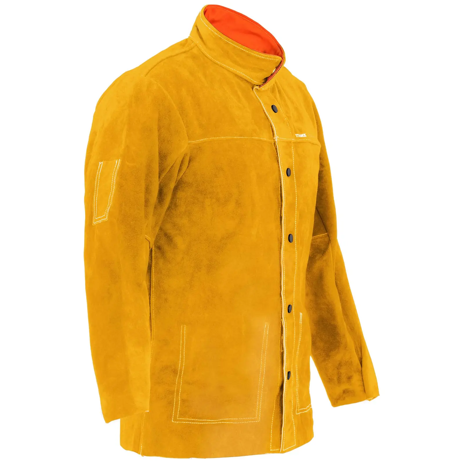 Asianmukainen hitsaustakki suojaa sinua kuumuudelta, roiskeilta ja kipinöiltä ja on lisäksi kaikkien ammattimaisten vaatimusten mukainen. Hankinta, joka kannattaa, vaikka olisit vain ”sunnuntaihitsari”. Tämä koon M hitsaustakki suojaa ylävartalon ja käsivarret erinomaisesti hitsattaessa. Sen istuu päälläsi mukavasti rajoittamatta liikkumavapauttasi. Ennen kaikkea se estää kuumuutta, roiskeita ja kipinöitä aiheuttamasta sinulle vakavia ja kivuliaita loukkaantumisia hitsaamisen yhteydessä. Hitsausvaatteissa tärkeää on paitsi ehdottoman laadukas materiaali, myös ensiluokkainen viimeistely. Kaikki tämän takin saumat on ommeltu synteettisestä kuidusta valmistetulla langalla. Sen ansiosta saumat kestävät repimisen lisäksi myös liekkejä ja kuumuutta. Takki on valmistettu naudan haljasnahasta, joka on äärettömän kestävä materiaali kovassa päivittäisessä käytössäkin. Yksi tämän hitsaustakin hyvistä ominaisuuksista ovat sen sähköä johtamattomat napit, joiden ansiosta tämä suojavaate sopii käytettäväksi sähkölaitteiden, kuten hitsauslaitteiden – mutta myös plasmaleikkureiden kanssa. Tarranauhakiinnikkeet huolehtivat takin hyvästä istuvuudesta. Kultaisesta takista erivärisenä erottuvat kaulukset voidaan tarvittaessa nostaa pystyyn. Lisäksi takissa on kaksi kätevää sisätaskua sekä pienet taskut hihoissa. Tämä takki suojaa sinua luotettavasti kaikissa hitsaustöissä, kuten MMA-, MIG/MAG-, TIG-, mikroplasma-, piste- ja suojakaasuhitsauksessa sekä plasma- ja polttoleikkauksessa. Tämä nahkainen hitsaustakki on EN-standardin ISO 11611:2007, suojaluokan 2 ja paloturvallisuusluokan A1 mukainen.