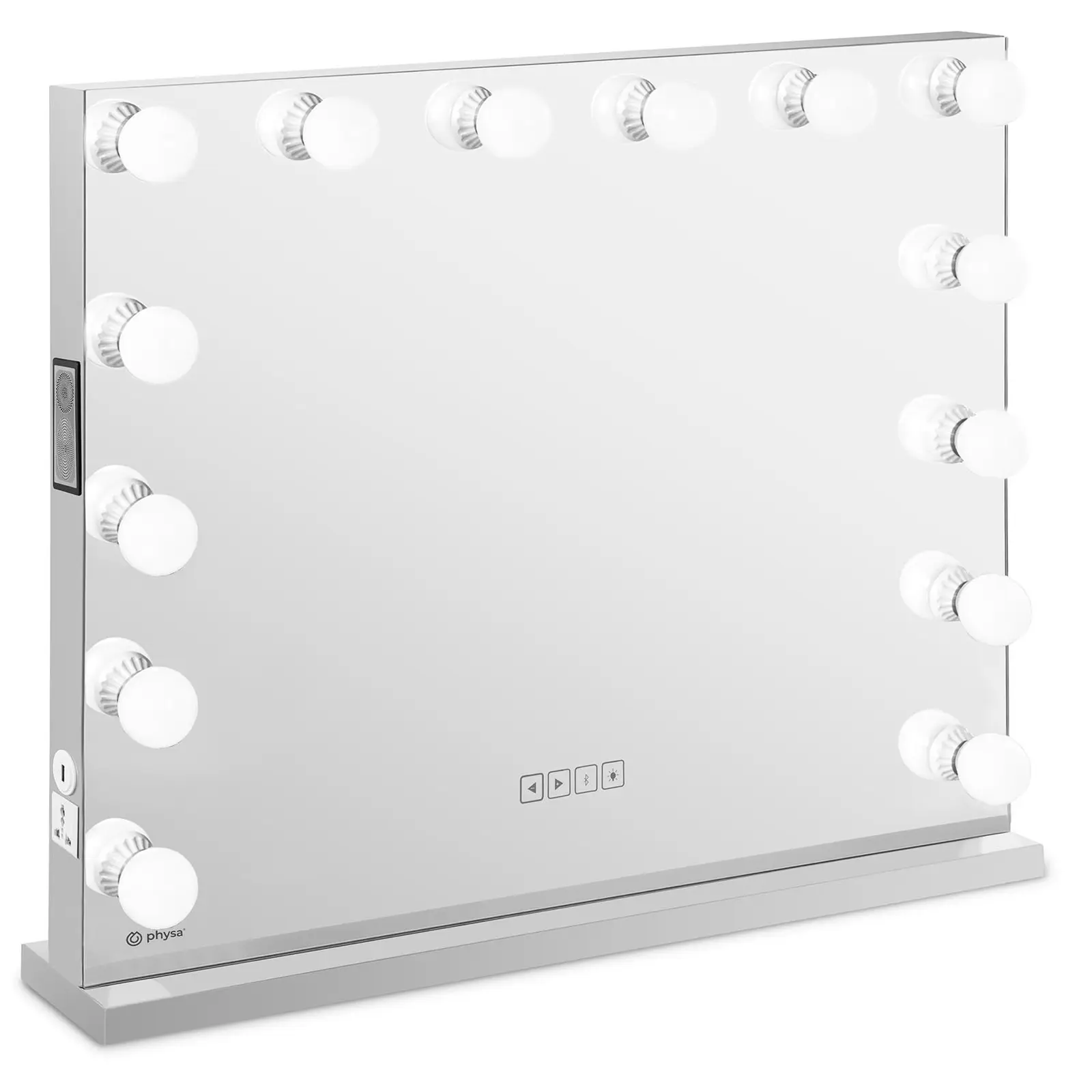 physan Hollywood-meikkipeilissä PHY-CMS- 13 SILVER asiakkaasi näyttäytyvät hohdokkaina. Joko kauneushoitolassa, kampaamossa, takahuoneessa tai kotona makuuhuoneessa: kulmikas valaistu meikkipeili varmistaa parhaan valaistuksen meikkien, kampausten ja asukokonaisuuksien luomiseen. Lisäksi tyylikäs teatteripeili ei ole vain todellinen katseenvangitsija, vaan se takaa myös täydellisesti valaistut selfiet. 14 lamppua on integroitu kehyksettömään peiliin, joista kukin loistaa 3 W tasaisella valolla. 6400 K:n valoväri pääsee hyvin lähelle auringonsäteiden värilämpötilaa, joten saat luonnollisen vaikutelman meikkiesi tai kampaustesi tekemiseen. Energiaa säästävät LED-lamput sisältyvät toimitukseen ja niiden käyttöikä on jopa 10000 tuntia. Lampun alhainen lämpötila ja UV-säteily takaavat sen turvallisen käytön. Miellyttävän värimaailman aikaansaamiseksi LED-meikkipeili on varustettu portaattomalla värin säädöllä. Jos tarvitset lisää valoa yksityiskohtia varten, käännä himmennin vain ylös. Kätevää: sähkölaitteiden, kuten hiustenkuivaajan, silitysraudan tai partakoneen käyttöä varten peilin runkoon on integroitu pistorasia. Voit aina ladata älypuhelimesi tai tablettisi helposti saatavissa olevan ylimääräisen USB-liitännän kautta. Näin sinun ei tarvitse etsiä sopivaa virtalähdettä. Kohokohta: Bluetooth-kaiuttimien ansiosta peili toistaa jopa suosikkimusiikkiasi laitteeltasi. Äänenvoimakkuutta voidaan säätää peilipinnan kosketusnäytöllä. Valaistussa meikkipeilissä on vakaa pohja, joka varmistaa peilin varman paikallaan pysymisen tasaisilla pinnoilla. Tämä tarkoittaa, että et ole sidottu yhteen paikkaan ja voit myös kuljettaa meikkipeilin asiakkaan luo tai ottaa sen mukaan tapahtumiin, ja sijoittaa sen mihin tahansa. Voit myös asentaa peilin pysyvästi seinälle. Kytkiessä meikkipeilin ja valaistuksen päälle, valo tarvitsee vain alle puoli sekuntia saavuttaakseen täyden kirkkautensa.