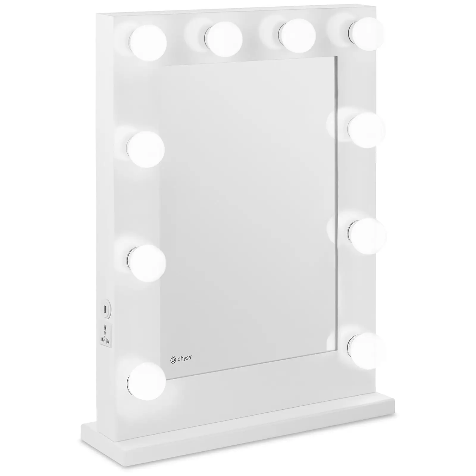 physan Hollywood-peilissä PHY-CM- 9 WHITE asiakkaasi näyttäytyvät hohdokkaina. Joko kauneushoitolassa, kampaamossa, takahuoneessa tai kotona makuuhuoneessa: kulmikas valaistu meikkipeili varmistaa parhaan valaistuksen meikkien, kampausten ja asujen luomiseen. Lisäksi tyylikäs teatteripeili ei ole vain todellinen katseenvangitsija, vaan se takaa myös täydellisesti valaistut selfiet. 10 lamppua on integroitu valkoiseen pinnoitettuun teräsrunkoon, joista kukin loistaa 3 W tasaisella valolla. 6. 400 K : n valon väri pääsee hyvin lähelle auringonsäteiden värilämpötilaa, joten saat luonnollisen vaikutelman meikkiesi tai kampaustesi tekemiseen. Energiaa säästävät LED-lamput sisältyvät toimitukseen ja niiden käyttöikä on jopa 10 000 tuntia. Lampun alhainen lämpötila ja UV-säteily takaavat sen turvallisen käytön. Miellyttävän värimaailman aikaansaamiseksi LED-meikkipeili on varustettu portaattomalla värin säädöllä. Jos tarvitset lisää valoa yksityiskohtia varten, käännä himmennin vain ylös. Käytännössä Sähkölaitteiden, kuten hiustenkuivaajan, silitysraudan tai partakoneen käyttöä varten peilin runkoon on integroitu pistorasia. Voit aina ladata älypuhelimesi tai tablettisi helposti saatavissa olevan ylimääräisen USB-liitännän kautta. Näin sinun ei tarvitse etsiä sopivaa virtalähdettä. Valaistu meikkipeilissä on vakaa pohja, joka varmistaa peilin varman paikallaan pysymisen tasaisilla pinnoilla. Tämä tarkoittaa, että et ole sidottu yhteen paikkaan ja voit myös kuljettaa meikkipeilin asiakkaan luo tai ottaa sen mukaan tapahtumiin ja sijoittaa sen mihin tahansa. Voit myös asentaa peilin pysyvästi seinälle. Kytkiessä meikkipeilin ja valaistuksen päälle, kestää vain alle puoli sekuntia, kunnes valo saavuttaa täyden kirkkautensa.