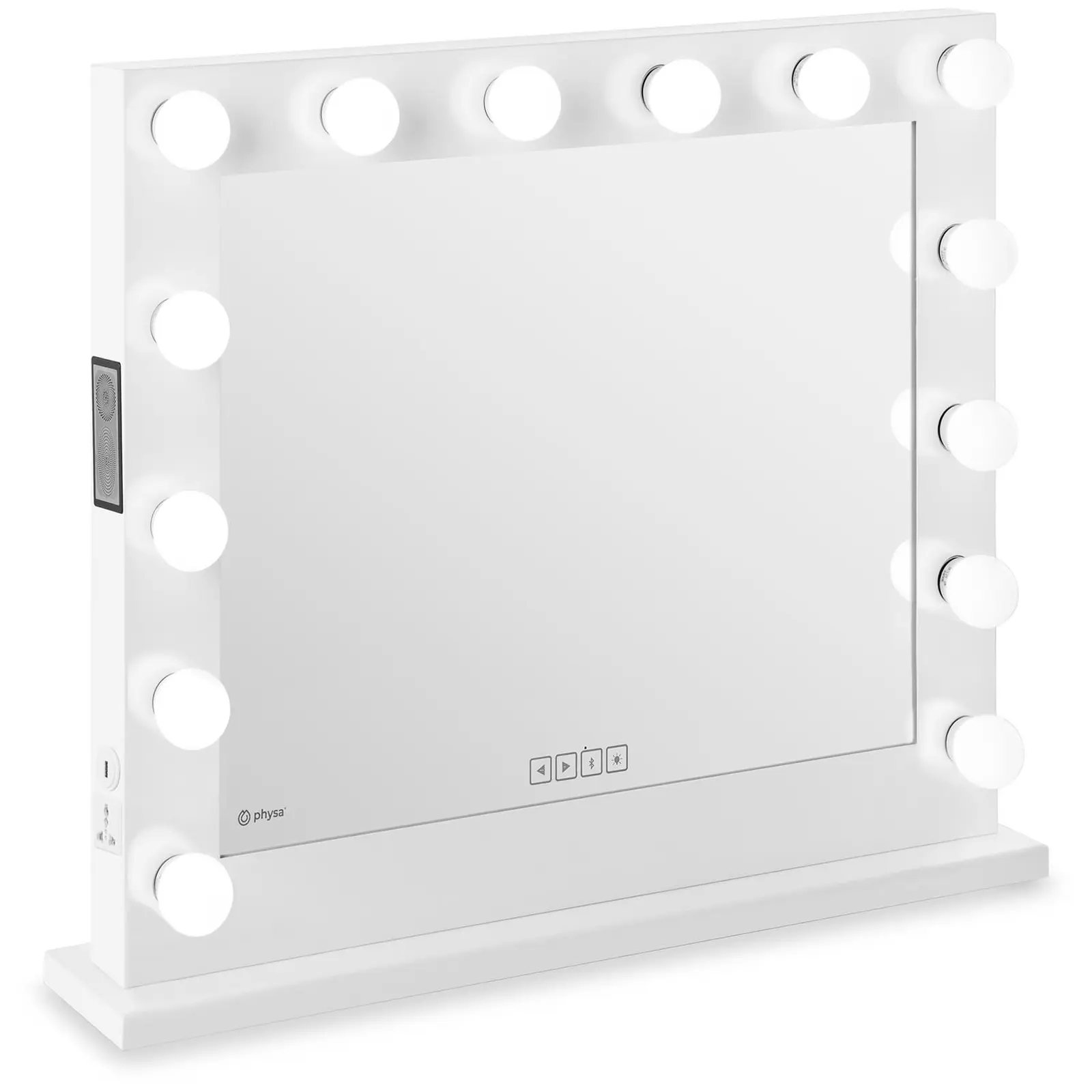 Physan Hollywood-peilissä PHY-CMS- 8 WHITE näyttäytyvät asiakkaasi hohdokkaina. Joko kauneushoitolassa, kampaamossa, takahuoneessa tai kotona makuuhuoneessa: kulmikas valaistu meikkipeili varmistaa parhaan valaistuksen meikkien, kampausten ja asujen luomiseen. Lisäksi tyylikäs teatteripeili ei ole vain todellinen katseenvangitsija, vaan se takaa myös täydellisesti valaistut selfiet. 14 lamppua on integroitu valkoiseen pinnoitettuun teräsrunkoon, joista kukin loistaa 3 W tasaisella valolla. 6400 K:n valon väri pääsee hyvin lähelle auringonsäteiden värilämpötilaa, joten saat luonnollisen vaikutelman meikkiesi tai kampaustesi tekemiseen. Energiaa säästävät LED-lamput sisältyvät toimitukseen ja niiden käyttöikä on jopa 10 000 tuntia. Lampun alhainen lämpötila ja UV-säteily takaavat sen turvallisen käytön. Miellyttävän värimaailman aikaansaamiseksi LED-meikkipeili on varustettu portaattomalla värin säädöllä. Sähkölaitteiden, kuten hiustenkuivaajan, silitysraudan tai partakoneen käyttöä varten peilin runkoon on integroitu kätevä pistorasia. Voit aina ladata älypuhelimesi tai tablettisi helposti saatavissa olevan ylimääräisen USB-liitännän kautta. Näin sinun ei tarvitse etsiä sopivaa virtalähdettä. Kohokohta: Bluetooth-kaiuttimien ansiosta peili toistaa jopa suosikkimusiikkiasi laitteeltasi. Äänenvoimakkuutta voidaan säätää peilipinnan kosketusnäytöllä. Valaistu meikkipeilissä on vakaa pohja, joka varmistaa peilin varman paikallaan pysymisen tasaisilla pinnoilla. Tämä tarkoittaa, että et ole sidottu yhteen paikkaan ja voit myös kuljettaa meikkipeilin asiakkaan luo tai ottaa sen mukaan tapahtumiin, ja sijoittaa sen mihin tahansa. Voit myös asentaa peilin pysyvästi seinälle. Kytkiessä meikkipeilin ja valaistuksen päälle, valo tarvitsee vain alle puoli sekuntia saavuttaakseen täyden kirkkautensa.