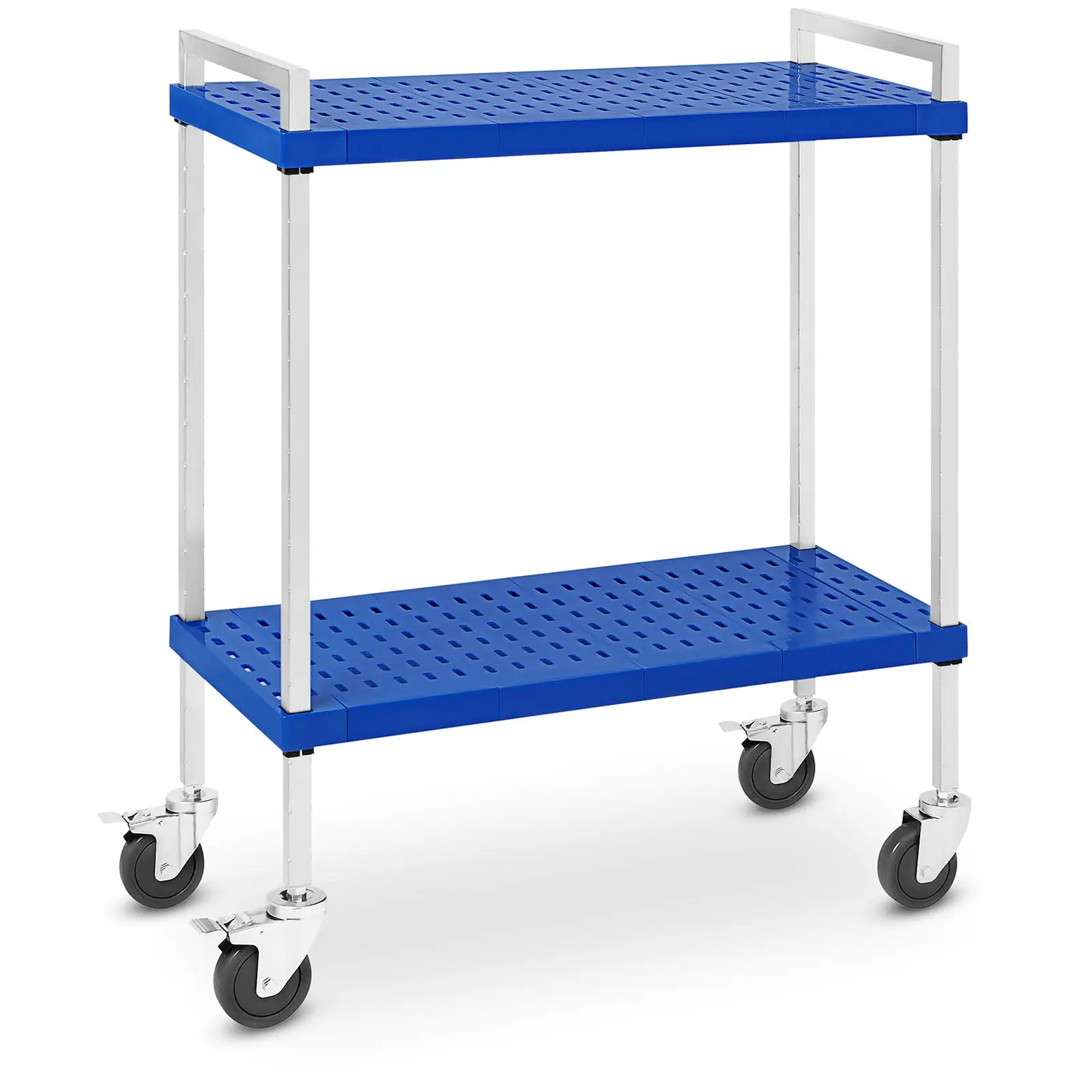 Royal Cateringin hotellivaunussa RC-STSS842 on kaksi tukevaa tasoa. Vankan, nimenomaan GN-astioille suunnitellun rakenteensa ansiosta tämä vaunu sopii loistavasti ruokaloihin, suurkeittiöihin, ravintoloihin tai julkisiin laitoksiin. Tällä vaunulla ruokien tarjoileminen, astioiden korjaaminen pöydästä ja kuljetus keittiöön tai varastojen täyttö on todella helppoa. Tarjoiluvaunu on erittäin kestävä ja helppo puhdistaa. Tämä tarjoiluvaunu on valmistettu 1,1 mm paksusta ruostumattomasta teräksestä ja iskunkestävistä muovitasoista, mikä tekee siitä hyvin pitkäikäisen ja vankan. Nämä materiaalit tekevät siitä myös helpon puhdistaa ja pitää kunnossa. Tarjoiluvaunumme on viimeistelty laadukkaasti, ja ne ovat erittäin kestäviä ja pitkäikäisiä. Kahden muovista valmistetun tason mitat ovat 37,5 x 86 cm. Niillä on runsaasti tilaa ruoalle ja juomille. Pystyt vaivatta tarjoilemaan suurelle asiakasmäärälle ja yhtä näppärästi taas viemään käytetyt astiat pois. Tarjoiluvaunuun pääsee helposti käsiksi kaikilta puolilta. Vaunun tasojen välinen etäisyys on 75 cm, joka riittää mainiosti GN-astioille, kattiloille ja suuremmillekin esineille. Hyllytasot kantavat ongelmitta jopa 25 kg:n painon. Suuren kuormitettavuutensa ja tilavien hyllytasojensa ansiosta tämä vaunu säästää tarjoilijalta monia turhia askelia ja tehostaa näin työntekoa huomattavasti. Tarjoiluvaunussa on neljä kookasta kevyesti liikkuvaa pyörää. Pyörät on päällystetty termoplastisella kumilla, mikä tekee vaunusta täyteen lastattunakin hiljaisen liikuttaa. Lisäksi pyörät kääntyvät 360 astetta, minkä ansiosta hotellivaunua voi ohjata ketterästi ja helposti ahtaissakin tiloissa. Kahdessa pyörässä on jarrut, jotka estävät vaunua tehokkaasti karkaamasta omille teilleen sillä aikaa, kun teet työtäsi. Tästä on paljon hyötyä etenkin vaunua lastattaessa. Vaunun kahdesta ergonomisesta muovikahvasta saa hyvän otteen työntämistä varten ja vaunun saa luotsattua ongelmitta kapeidenkin paikkojen läpi. Vaunun rakenne on selkeä ja sen kokoaminen käy kuin leikiten. Kokoamiseen tarvittava materiaali sisältyy toimitukseen.