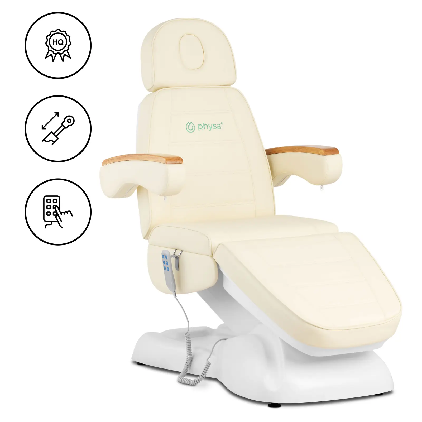 Hoitopöytä PHYSA SANREMO tarjoaa parhaan mukavuuden makuulla tai istuessa. Näin voit suorittaa mukavasti kosmeettisia hoitoja, joista asiakkaasi voi keskittyä nauttimaan. Hoitotuoli soveltuu kauneudenhoito-, tatuointi- ja lävistysliikkeisiin sekä kylpylöihin ja hyvinvointiyrityksiin. Mukavuuden ja ergonomian takaamiseksi hoitopöytä on varustettu lukuisilla toiminnoilla. Tehokas moottori mahdollistaa helpon käsittelyn johdollisen kaukosäätimen avulla. Voit asettaa hoitotason korkeuden välille 530 – 650 mm. Lisäksi voit säätää jalkatuen kulman (0 – 30°) kulloisenkin hoidon ja asiakkaasi tarpeiden mukaan. Miellyttävä pehmuste yhdessä ensiluokkaisen, öljyä ja vettä hylkivän, helposti puhdistettavan keinonahkapäällysteen kanssa takaa korkean mukavuuden ja moitteettoman hygienian. Lepotuolin paksujen pehmusteiden päällä asiakkaasi voivat rentoutua kokonaisvaltaisesti. Makuutoiminto täydentää tuolin luomaa hyvinvointi-ilmapiiriä. Älykkään rakenteensa, jauhepäällystetyn metallijalustansa ja laadukkaiden materiaaliensa ansiosta physan hoitotuolin maksimikuormitus on jopa 150 kg. Tämä hoitopöytä tekee vaikutuksen pitkäikäisyydellään sekä yksinkertaisella ja klassisella muotoilullaan.