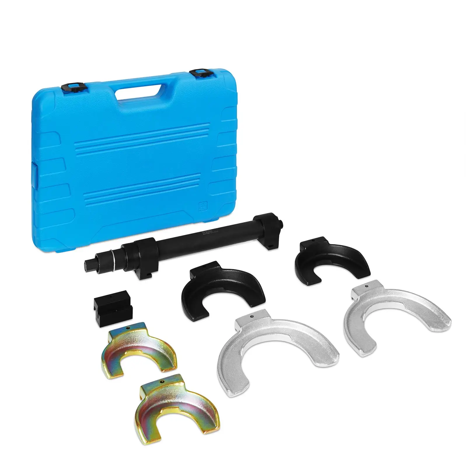 MSW:n ammattilaitteista löytyvällä jousipuristimella MSW-HCSC-01 voit poistaa tai vaihtaa ajoneuvojen kuluneita tai viallisia MacPherson-joustintukia ja iskunvaimentimia. Tällä työkalulla jouset ja iskunvaimentimet voi vaihtaa vaarattomasti ja ammattimaisesti. Se sopii automekaanikoille, jälleenmyyjille ja yksityiskäyttöön. Jousikiristinsarja koostuu hydraulisesta välikappaleesta ja kolmesta puristuspääparista. Ne soveltuvat useimmille kartiomaisilla ja sylinterimäisillä jousilla varustetuille McPherson-joustintuille, ja siksi niitä voidaan käyttää lukuisissa BMW-, Toyota-, Seat-, Opel-, VW-, Audi-, Skoda-, Nissan-, Volvo-, ja Porsche- ajoneuvoissa sekä monissa muissa merkeissä. Voit käyttää jousipuristinta yleisesti sekä etu- että taka-akselille. Kolme halkaisijaltaan 60 – 212 mm:n puristuspääparia yhdessä hydraulisen välikappaleen kanssa voivat puristaa erikokoisia jousia. Suuren 300 mm jännevälin, joka voidaan säätää tarkasti jouselle puristuspäästä riippuen, ansiosta tätä ammattimaista autotyökalua voidaan käyttää yleisesti. Jousilevy voidaan vaihtaa nopeasti ja helposti. Välikappale on valmistettu hiiliteräksestä. Tämä mahdollistaa jopa 1 050 kg eli 10 200 Nm puristusvoiman yhdessä kiristyspäiden kanssa. Vankka ja tehokas rakenne mahdollistaa nopean ja tarkan työskentelyn. Kuljetuksen helpottamiseksi jousipuristin toimitetaan salkussa, joten työkalua voidaan käyttää näppärästi myös asiakaskäynneillä. Kaikki sarjan osat sijaitsevat kuljetussalkussa, järjestyksessä ja valmiina käyttöön. Siinä niitä voidaan myös turvallisesti säilyttää.
