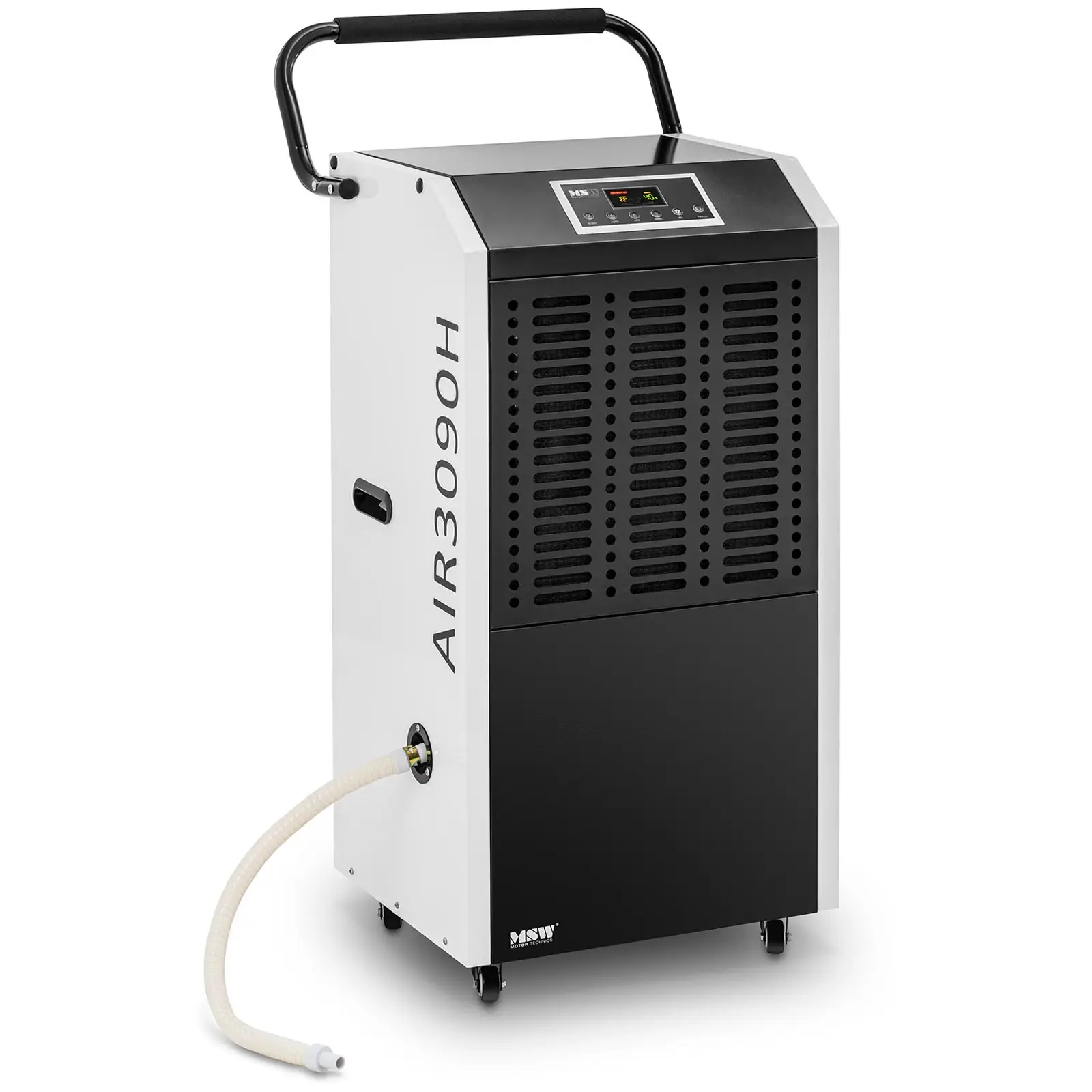 Olit sitten rakennustyömaalla tai tekemässä keittiöremonttia: MSW:n rakennuskuivain pitää seinät kuivina. Ilmankuivaajalla estät homeen muodostumisen kosteisiin seiniin, mikä voisi vaatia kalliita korjauksia. Lisäksi monet työt, kuten maalaamineen ja rappaus, sujuvat kuivaimen avulla nopeasti. Jatkuvassa käytössä ilmankuivain autotalliin tai työkäyttöön poistaa jopa 138 litraa kosteutta päivässä, joka kertyisi muuten seiniin. Suurimman hyötysuhteen saavutat 30 °C:n huonelämpötilassa ja 80 %:n ilmankosteudessa. Tätä varten laite kierrättää jopa 1129 m³ ilmaa tunnissa ja jäähdyttää sitä tehokkaan 1300 W:n kompressorinsa avulla. Laite käyttää tähän tarkoitukseen erittäin ympäristöystävällistä R290-kylmäainetta. Kondensoitunut neste valuu sitten pois letkun kautta. Kuivain sopii täydellisesti jopa 70 – 100 m²:n kokoisiin tiloihin. Kuivauslaite on varustettu LED-näytöllä, jolla voit asettaa ja ohjata kaikkia tarvittavia arvoja. Voit asettaa halutun käyttöjakson 24 tunnin ajastimella. Lisäksi rakennuskuivaimessa on automaattinen virrankatkaisu. Automaattinen jäänpoistotoiminto puolestaan mahdollistaa laitteen käytön jopa 5 °C:n lämpötiloissa. Lisäksi kuivain käynnistyy automaattisesti, kun huoneen kosteus nousee liian korkeaksi. Sensorinäyttö ilmoittaa mahdollisista virhetilanteista, jolloin voit reagoida niihin asianmukaisesti. Voit irrottaa sisäänrakennetun ilmansuodattimen helposti ja pestä sen seuraavaa käyttökertaa varten. Haluatko siirtää laitetta? Voit tehdä sen helposti pyörien ja kätevän kahvan avulla. Tästä syystä kondenssikuivain soveltuu myös isommille työmaille ja useiden huoneiden kuivaukseen.