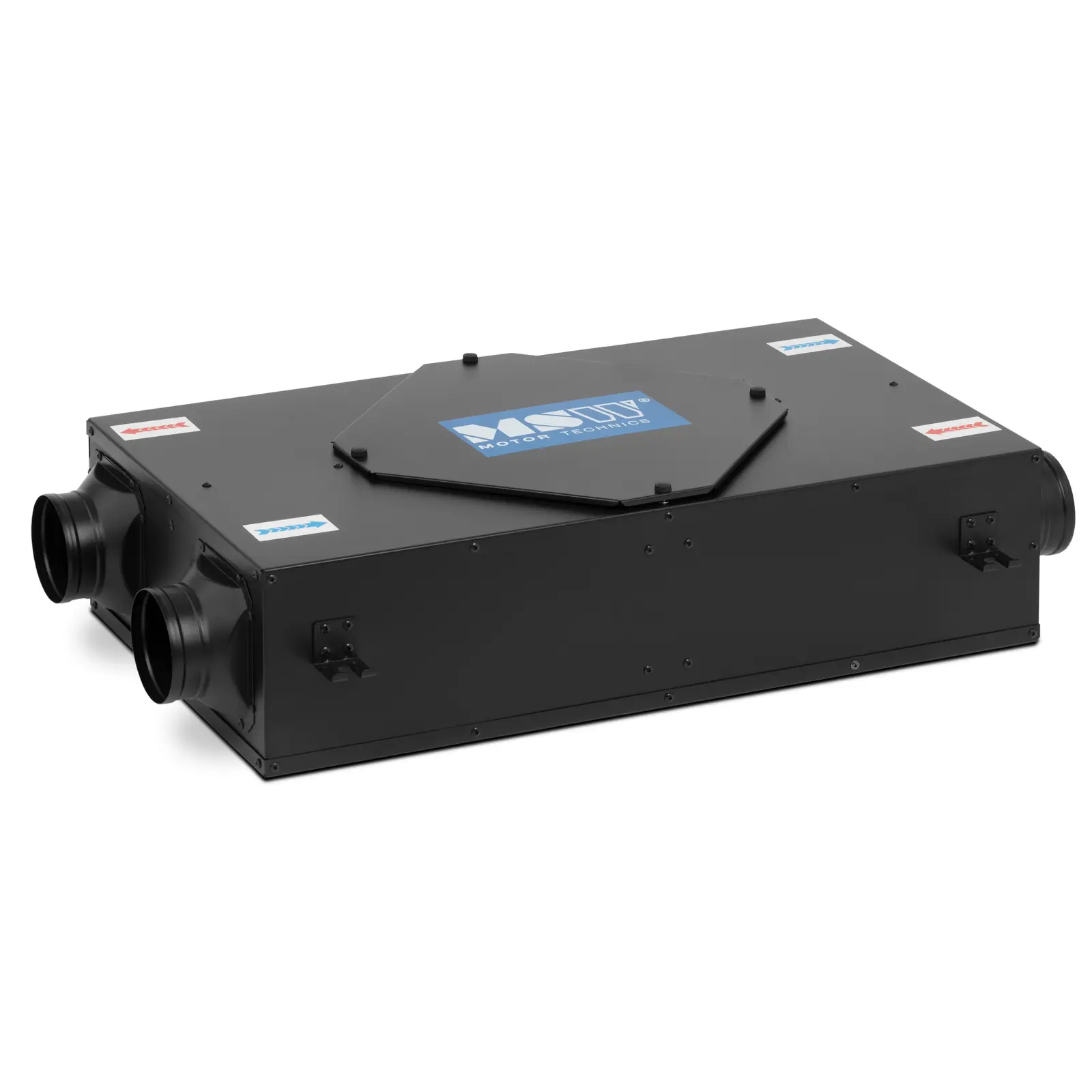 Käytetty poistoilma energianlähteeksi? Ilmanvaihtokone lämmöntalteenotolla sopii viileän ja raikkaan tuloilman lämmittämiseen poistoilman avulla. Tämä fiksu järjestelmä on energiaa säästävä ja kustannustehokas lämmitysratkaisu. Erittäin kompakti ristivirtauslämmönvaihdin tekee vaikutuksen paitsi tehokkailla teknisillä ominaisuuksillaan myös näppärällä muotoilullaan. Ilma-lämmönvaihtimen ydin on sen sisällä oleva grafeenimoduuli, jonka läpi sekä tulo- että poistoilma johdetaan. Uusinta teknologiaa edustavan moduulin rakenne mahdollistaa jopa 65 %:n lämmönvaihdon. Lisäksi molemmat ilmavirrat kulkevat kahden suodattimen läpi, mikä takaa raikkaan ilman ja miellyttävän mikroilmaston. Sisään- ja ulostuloaukot poisto- ja tuloilmalle ovat halkaisijaltaan 146 mm:n kokoiset ja varmistavat ilman optimaalisen virtauksen lämmönvaihtimen läpi. Tämä lämmön talteenottojärjestelmä sopii käytettäväksi enintään 70 m² suurissa tiloissa, jotka eivät ole korkeampia kuin 3 m. Kiertosäätimen avulla voit ottaa käyttöön haluamaasi tilaan sopivan ilmavirran tason 210, 175 tai 160 m³/h. Näin varmistat tasaisen ilmanvaihdon sekä optimaalisen lämmön- ja kosteudensiiron. Puhaltimen pitkäikäinen moottori toimii vähän huoltoa vaativalla vaihtovirtakuparikäämillä, joka tekee vaikutuksen luotettavalla toiminnallaan. Lisäksi ilmanvaihtolaite on varustettu ylikuumenemissuojalla. Kotelon sisäpuolella oleva vaahtomuovipanelointi takaa myös hiljaisen toiminnan.