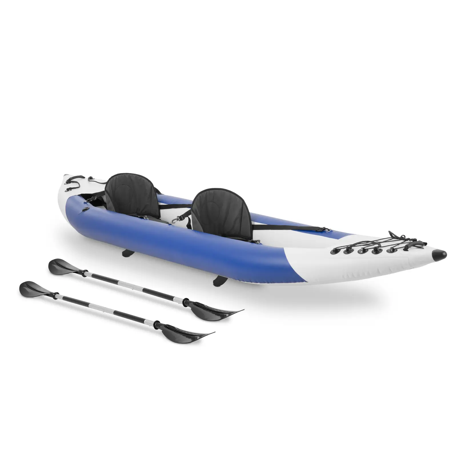 Kaipaatko melontaretkelle? MSW:n puhallettavalla kajakki kahdelle hengelle tarjoaa mahdollisuuden tutkia rauhallisia rannikkovesiä ja lahtia, pieniä järviä ja kanavia spontaanisti ja ilman valmisteluja. Laaja setti sisältää kaiken, mitä tarvitset vesillä liikkumista varten: Itse ilmakajakin lisäksi toimitukseen sisältyy kaksi 223 cm pitkää melaa, kaksi evää, istuimet selkänojalla sekä ilmapumppu ja korjaussarja. Käytön jälkeen voit pakata kaikki tarvikkeet mukana toimitettuun laukkuun ja kuljettaa sen helposti auton tavaratilassa, bussissa tai junassa. Voit täyttää kajakin muutamassa minuutissa sen mukana toimitetulla ilmapumpulla. Asenna sitten vain pohjalevy ja istuimet paikalleen, ja olet valmis lähtemään matkaan! Kahdelle henkilölle suunnitellun ja jopa 180 kg:n kuormalle sopivan kajakin rungossa on kaksi kahvaa, joiden avulla se on helppo kuljettaa veteen. Kevyet alumiinimelat, joissa on muovilavat, tekevät kajakin ohjaamisesta helppoa. Erityisen neljällä ilmakammiolla (kaksi rungossa, yksi alakannella ja V-muotoinen turvaköli) varustetun rakenteensa ansiosta tämä kajakki istuu erittäin tukevasti ja turvallisesti vedessä, joten se sopii myös aloittelijoille. Puhallettava kajakki on valmistettu korkealaatuisista materiaaleista, kuten ruostumattomasta teräksestä, alumiinista, muovista (polyvinyylikloridi ja polypropeeni) ja nailonista, ja on lisäksi erityisen kestävä. Tämän takaa myös rungon UV-kestävä, kolmikerroksinen kangas (PVC, nailon ja jälleen PVC). Setti sisältää myös käytännöllisen korjaussarjan.