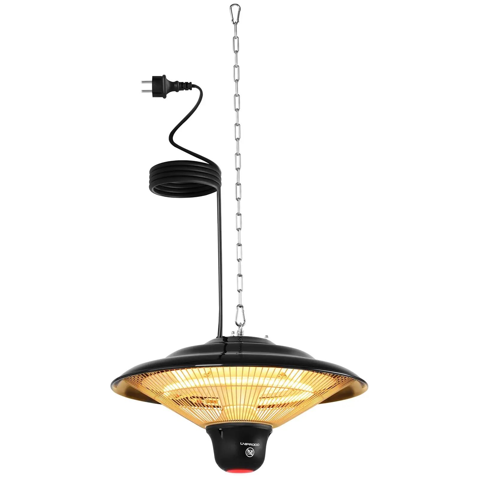 Pidennä puutarhajuhliasi tai grillikauttasi Uniprodon infrapunakattolämmittimellä! Sisällä tai ulkona: Tehokas säteilylämmitin takaa kodikkaat lämpötilat lyhyessä ajassa kuitenkaan säilytystilaa viemättä. Kattolämmitin soveltuu niin pienille terasseille kuin täysiin katukahviloihin, autotalleihin, työpajoihin sekä varastotiloihin. Kattolämmitin yhdistää tehokkaan 1500 watin tehon ja luotettavan infrapunatekniikan. Myöhäisinä tunteina tai viileämpinä vuodenaikoina viihtyisä lämpö miellyttävällä valaistuksella saadaan aikaan nopeasti. Moderni ilme teolliseen tyyliin erottuu muista säteilylämmittimistä ja luo tunnelmallisen ilmapiirin. Teräskotelo korostaa selkeää ulkomuotoa ja takaa samalla pitkän käyttöiän. Ripustettava lämmitin on helppo kiinnittää kattoon tilan säästämiseksi ja soveltuu siksi myös pienimmille terasseille tai ahtaisiin tiloihin. Virtakytkin on helposti käytettävissä milloin tahansa ja takaa säteilevän lämmittimen helpon toiminnan. Käytön aikana suojaritilä estää tahattoman kosketuksen lämmityselementin kanssa ja estää näin onnettomuuksia. Suojausluokka-IP34 suojaa terassilämmitintä pölyltä ja roiskevedeltä, ja sitä voidaan käyttää epäröimättä kaikissa sääolosuhteissa.
