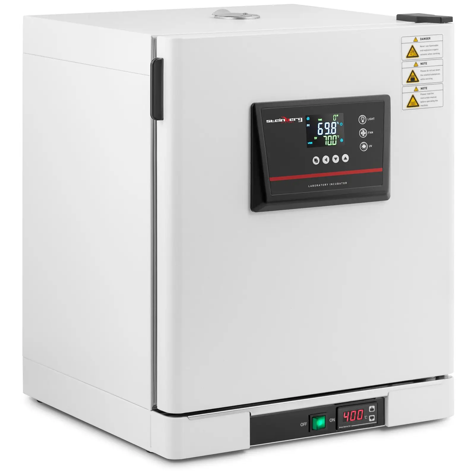 Mikro-organismeilla, soluviljelmillä ja itiöillä on yksi yhteinen piirre: ne tarvitsevat vakiolämpötiloja kehittyäkseen optimaalisesti laboratoriossa. Tämän varmistaa Steinberg Systemsin inkubaattori SBS-LI-43. Optimaalisen lämpötilan hallinnan ja kestävän kotelon ansiosta se on luotettava työkalu jokaisessa lääketieteen, elintarvikeanalytiikan tai biologian laboratoriossa, jossa sitä voidaan käyttää helposti ja tehokkaasti. Inkubaattori varmistaa optimaaliset olosuhteet viljelmille PID-ohjelmiensa avulla, jotka voidaan asettaa kosketusohjauspaneelilta ja tarkistaa LCD-näytöltä. Se tarjoaa toimintoja, kuten ajan- ja lämpötilan säädön, ylikuumenemissuojan, ajastimen ja automaattisen sammutuksen. Lämpötilan säädin ylläpitää tarkasti asetettua, maksimissaan 70 °C lämpötilaa ajastimeen asetetun ajan 0 – 9 999 min. Anturit tarkistavat lämpötilan jatkuvasti ja korjaavat automaattisesti mahdolliset poikkeamat. Tämän seurauksena inkubaattori ylläpitää lämpötilaa ± 1. 5 °C:n tarkkuudella. RS-485-liitännän avulla inkubaattori voidaan yhdistää tietokoneeseen. Lämpötilan voi rajoittaa kätevästi digitaaliselta näytöltä. Lisäksi laitteessa on UV-valolla toimiva sterilisaatiotoiminto. Ovi tilavaan sisätilaan on ilmatiivistetty silikonikumitiivisteellä ja varmistaa siten minimaalisen lämpötilahäviön viljelmien tai bakteerien inkuboinnin aikana. Kaksiovinen järjestelmä sisältää karkaistusta lasista valmistetun lämmönkestävän oven, joka antaa sinulle mahdollisuuden tarkkailla inkuboinnin edistymistä tarvittaessa. Ulko-ovi toimii suojana, joka kiinnittyy magneeteilla. Lämpötila jakautuu hyvin tasaisesti sisätilaa kiertävän ilmastoinnin kautta, joten lämpötilan vaihteluilta vältytään. Sisävalaistukseen voit valita tavallisen valon tai bakteereja tappavan valon. Sisus on valmistettu ruostumattomasta teräksestä ja on siksi erittäin helppohoitoinen ja kestää hyvin korroosiota ja muita ympäristövaikutuksia. Inkubaattori on 43 l tilavuudellaan erittäin tilava. Säädettävän korkeutensa ansiosta sisäosaa voidaan käyttää optimaalisesti ja mukauttaa eri näytteille tai viljelmille sopivaksi. Kotelo on valmistettu tukevasta, valssatusta teräksestä, joka on varustettu sähköstaattisella pinnoitteella tehden ulkokuoresta erittäin kestävän. Tämä tarkoittaa, että inkubointikaappi kestää myös raskaita kuormia ja se voidaan puhdistaa vaivattomasti.