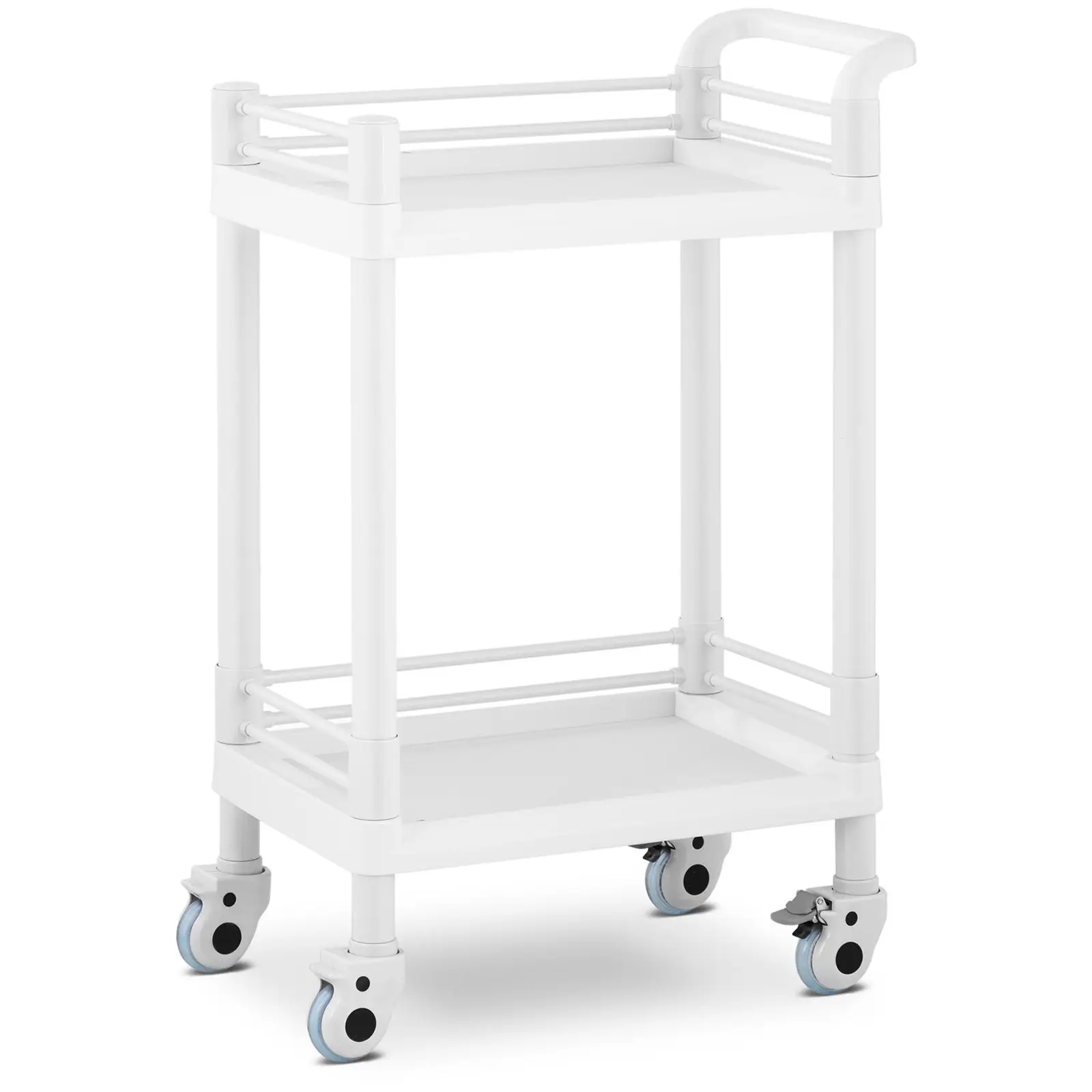 Pidätkö järjestyksestä ja haluat säilyttää tarvittavat välineet aina käden ulottuvilla? Tällöin tarvitset Steinberg Systemsin instrumenttivaunun! Vaunun kahdella tasolla pidät välineet aina parhaassa järjestyksessä olipa kyseessä sitten koeputket nesteet tai käsipaperit. Käytä vaunun kahta, mitoiltaan 43 x 30 x 5 cm olevaa tasoa välineiden säilyttämiseen käden ulottuvilla. Korotetut reunat estävät tavaroiden putoamisen tasoilta. Samalla yksi sivu on auki, mikä helpottaa välineiden ottamista vaunusta ja niiden lastaamista sinne. Säilytätkö laitteita ja nesteitä kaapissa tai varastossa ja haluat siirtää ne kaikki nyt työpöydällesi? Tätä varten instrumenttivaunu tarjoaa reilusti tilaa ja kuljettaa kaikki tarvikkeet neljällä pyörällään ja työntökahvallaan nopeasti ja mukavasti juuri sinne, missä niitä tarvitset! ABS:stä ja PVC:stä valmistettujen pyörien materiaaliyhdistelmä on erityisen hellävarainen jopa herkille lattioille. Vaunun paikallaan pysyvyydestä huolehtii kaksi luotettavaa seisontajarrua. Kestävästä muovista valmistettujen putkien ja hyllyjen ansiosta kuljetusvaunu tekee vaikutuksen vakaalla rakenteellaan, joka kantaa jopa 20 kg. Käytetyt materiaalit ovat erittäin helppohoitoisia ja kestäviä, joten laboratoriovaunu ei petä sinua päivittäisessäkään käytössä. Laboratorion lisäksi vaunu sopii myös lukuisiin eri käyttöympäristöihin, kun liikuteltava, mutta samalla hyvin järjestetty säilytystaso on tarpeen!