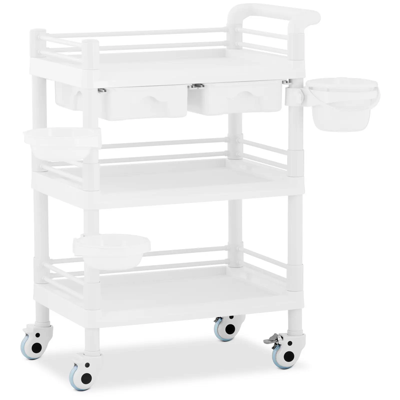 Pidätkö järjestyksestä ja haluat säilyttää tarvittavat välineet aina käden ulottuvilla? Tällöin tarvitset Steinberg Systemsin instrumenttivaunun! Vaunun kolmella tasolla ja kahdessa vetolaatikossa pidät välineet aina parhaassa järjestyksessä olipa kyseessä sitten koeputket nesteet tai käsipaperit. Käytä vaunun kolmea, mitoiltaan 54 x 37 x 14 cm olevaa tasoa välineiden säilyttämiseen käden ulottuvilla. Korotetut reunat estävät tavaroiden putoamisen tasoilta. Samalla yksi sivu on auki, mikä helpottaa välineiden ottamista vaunusta ja niiden lastaamista sinne. Lisää säilytystilaa tarjoaa mitoiltaan 17 x 35 x 8 cm vetolaatikko, jotka on sijoitettu mukavalle korkeudelle suoraan ylimmän säilytystason alapuolelle. Laboratoriovaunu on varustettu jopa roskien varalle. Voit kiinnittää kolme kätevää astiaa (yksi kannellinen) haluamaasi kohtaan ja kääntää niitä tarvittaessa 360°. Säilytätkö laitteita ja nesteitä kaapissa tai varastossa ja haluat siirtää ne kaikki nyt työpöydällesi? Tätä varten instrumenttivaunu tarjoaa reilusti tilaa ja kuljettaa kaikki tarvikkeet neljällä pyörällään ja työntökahvallaan nopeasti ja mukavasti juuri sinne, missä niitä tarvitset! ABS:stä ja PVC:stä valmistettujen pyörien materiaaliyhdistelmä on erityisen hellävarainen jopa herkille lattioille. Vaunun paikallaan pysyvyydestä huolehtii kaksi luotettavaa seisontajarrua. Kestävästä muovista valmistettujen putkien ja hyllyjen ansiosta kuljetusvaunu tekee vaikutuksen vakaalla rakenteellaan, joka kantaa jopa 30 kg. Käytetyt materiaalit ovat erittäin helppohoitoisia ja kestäviä, joten laboratoriovaunu ei petä sinua päivittäisessäkään käytössä. Laboratorion lisäksi vaunu sopii myös lukuisiin eri käyttöympäristöihin, kun liikuteltava, mutta samalla hyvin järjestetty säilytystaso on tarpeen!